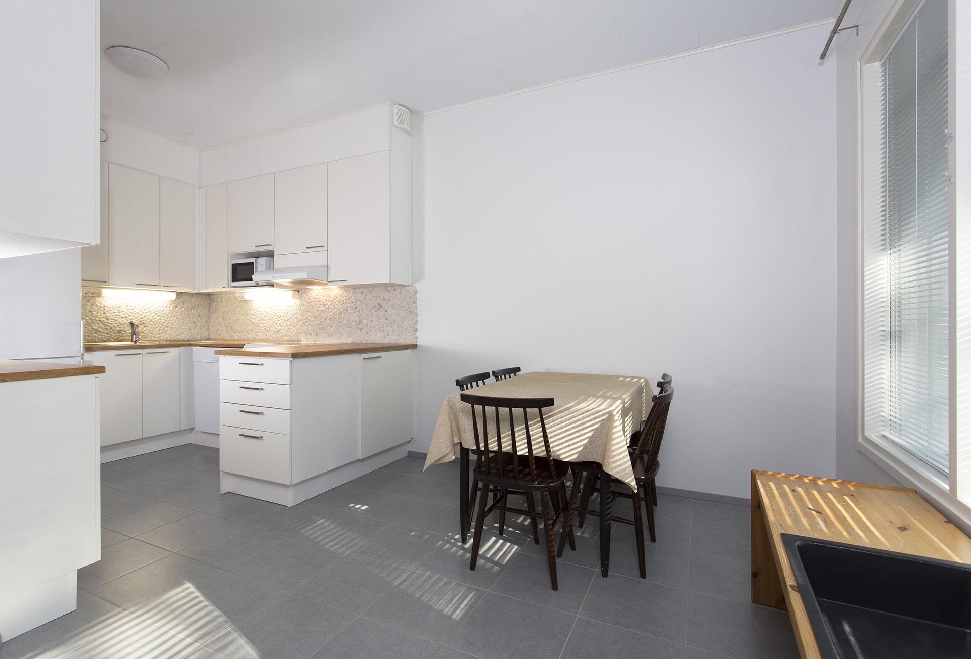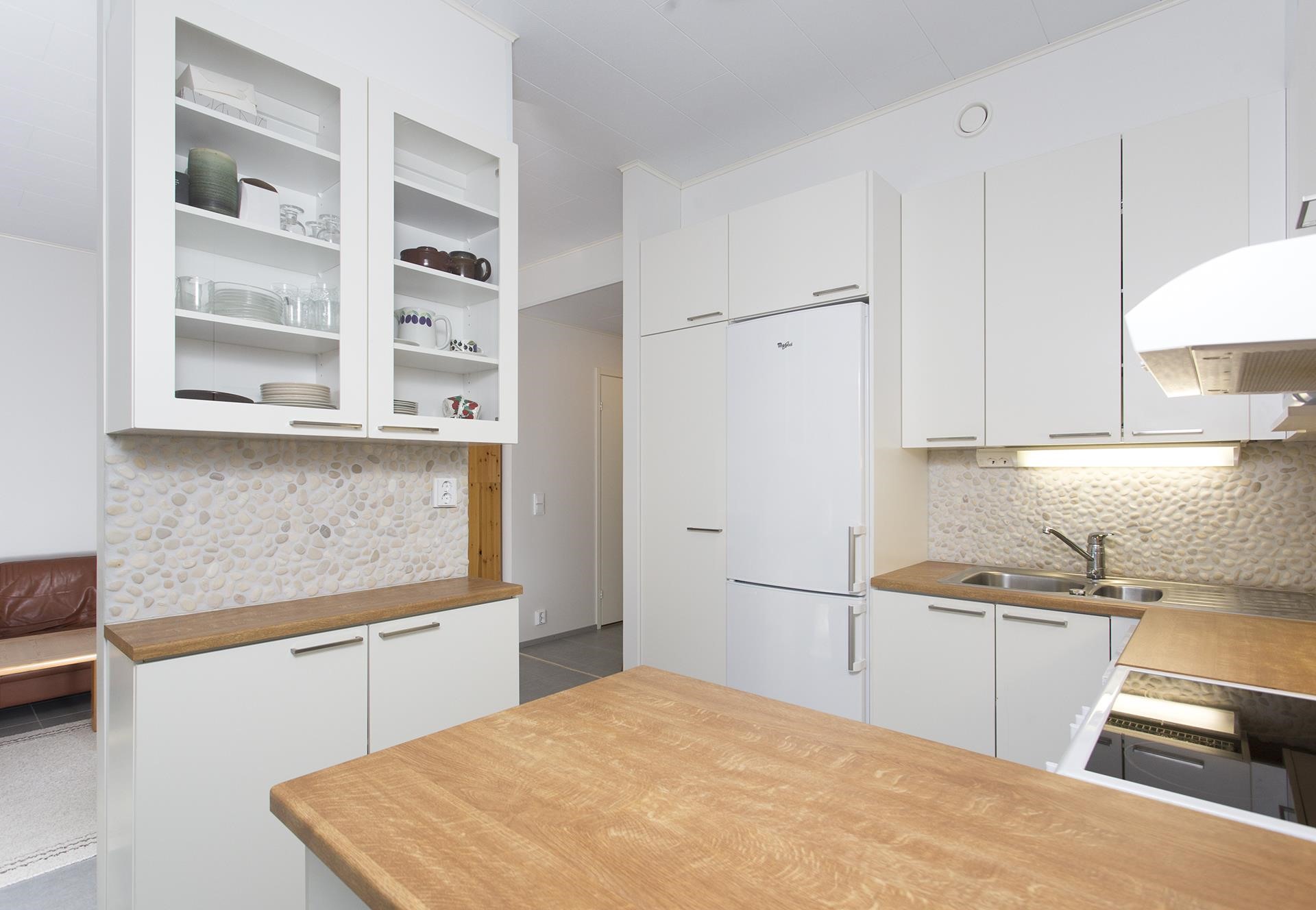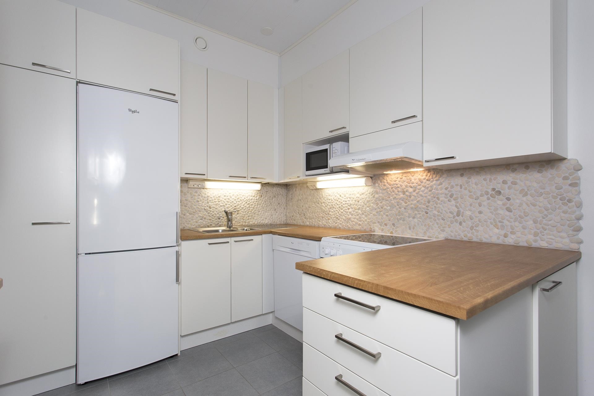 - Jääkaappipakastin, keraaminen liesi, liesituuletin, astianpesukone, kaapistot, kiinteät valaisimet.