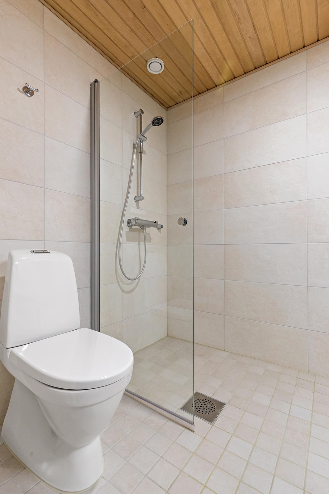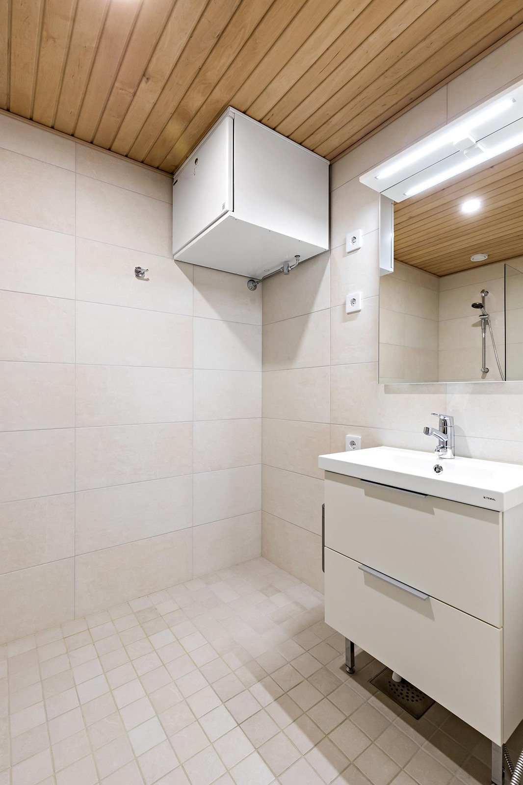 - Kylpyhuone, suihku, suihkuseinä, peilit, allaskaappi, pesukoneliitäntä, lattialämmitys, kiinteät valaisimet.