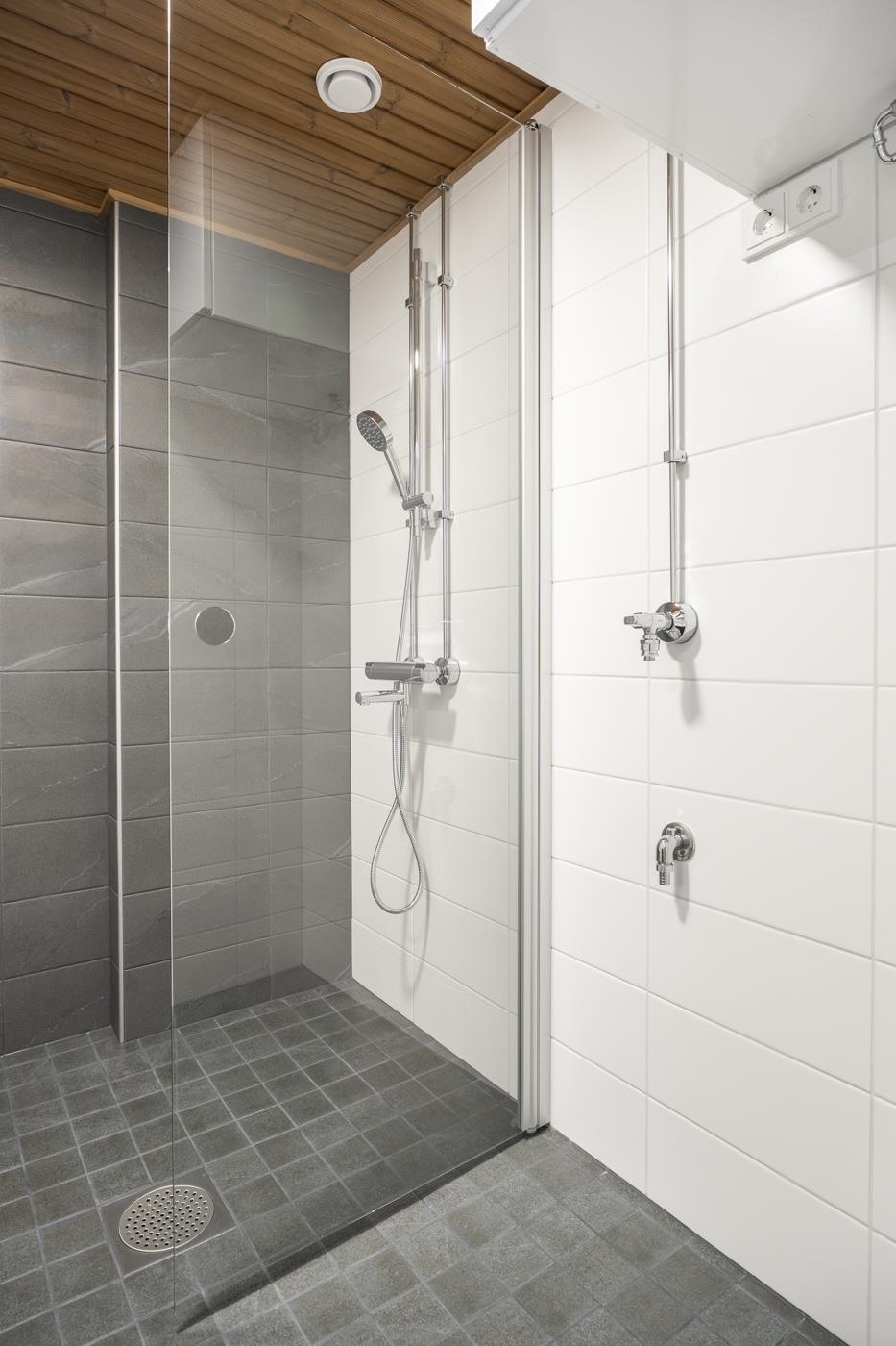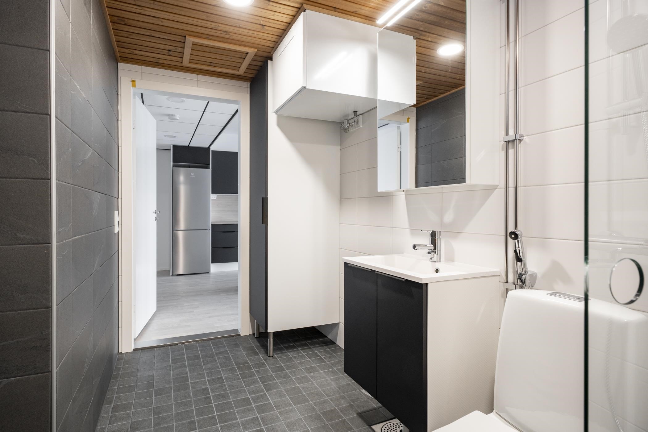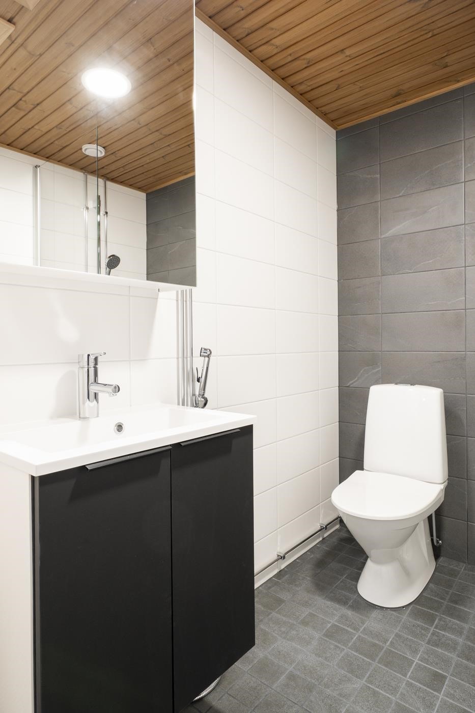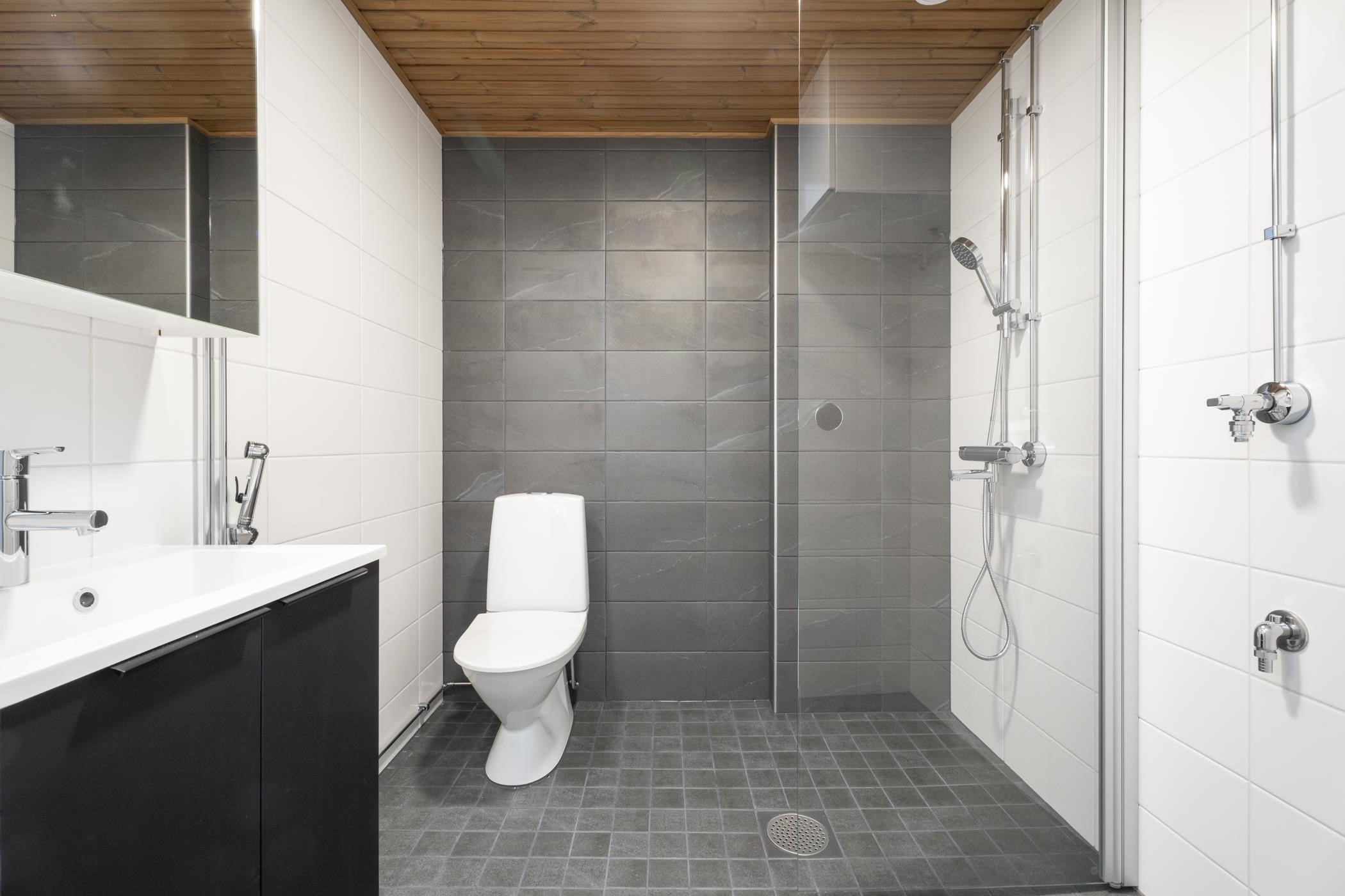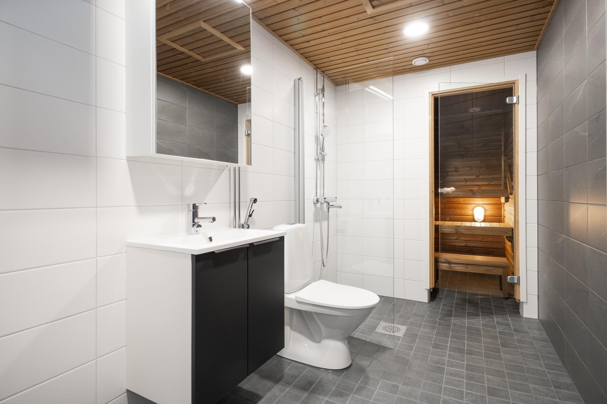 - Kylpyhuoneen lattiat ja seinät ovat laatoitettuja, katto paneloitu. Kylpyhuoneessa on tasoallas ja pesuallaskaappi sekä sen yläpuolella peilikaappi. Kylpyhuoneessa on pyykinpesukoneliitäntä ja varaus päällekkäiselle kuivausrummulle. Saunan lattia on laatoitettu, seinät ja katto paneloituja. Laudetasot ja askelmat ovat mäntyä, tukirakenteena on höylätty havupuu. Saunan ovi on kokolasinen.