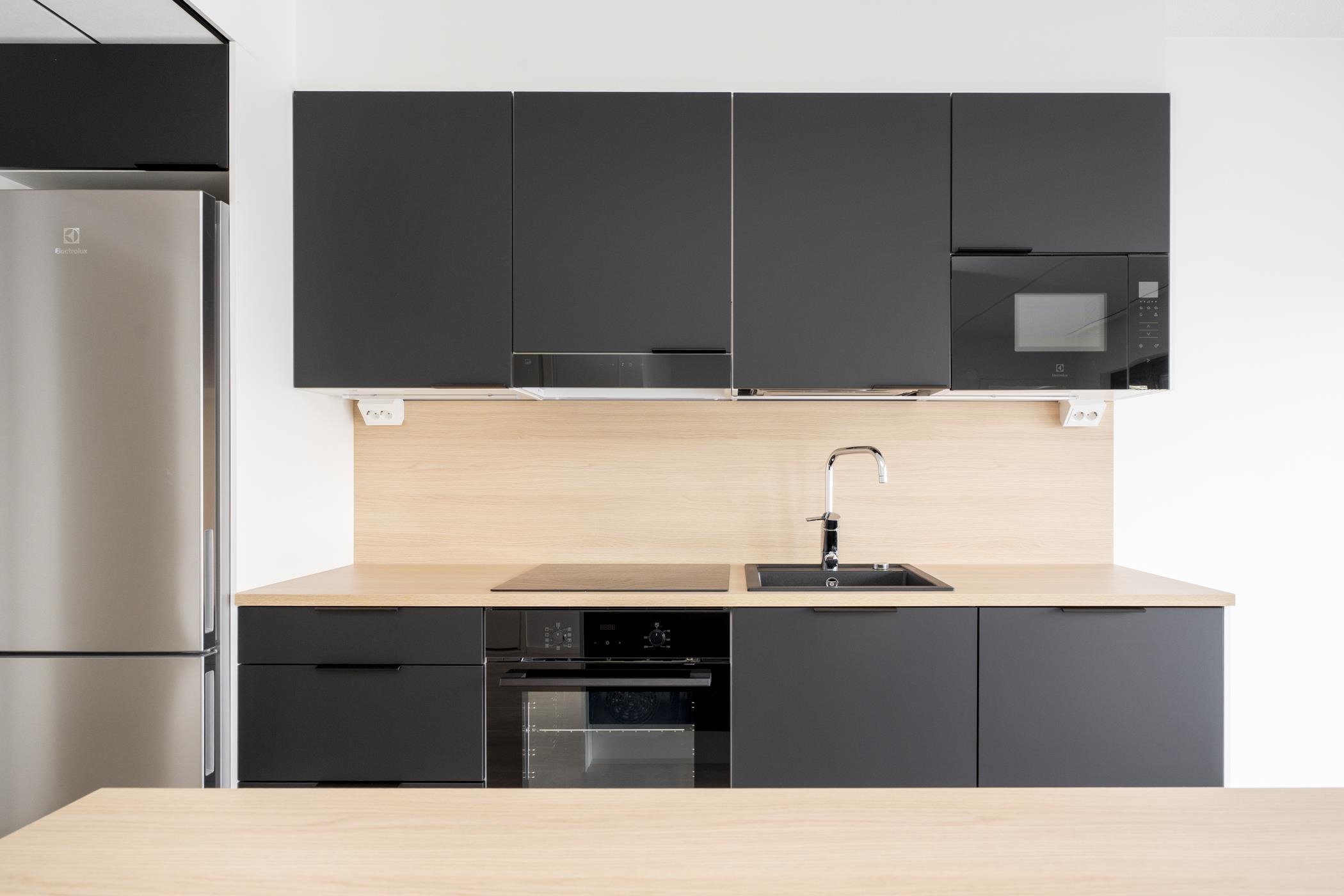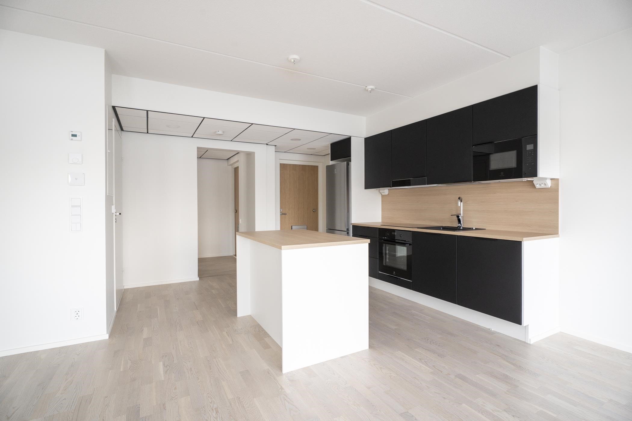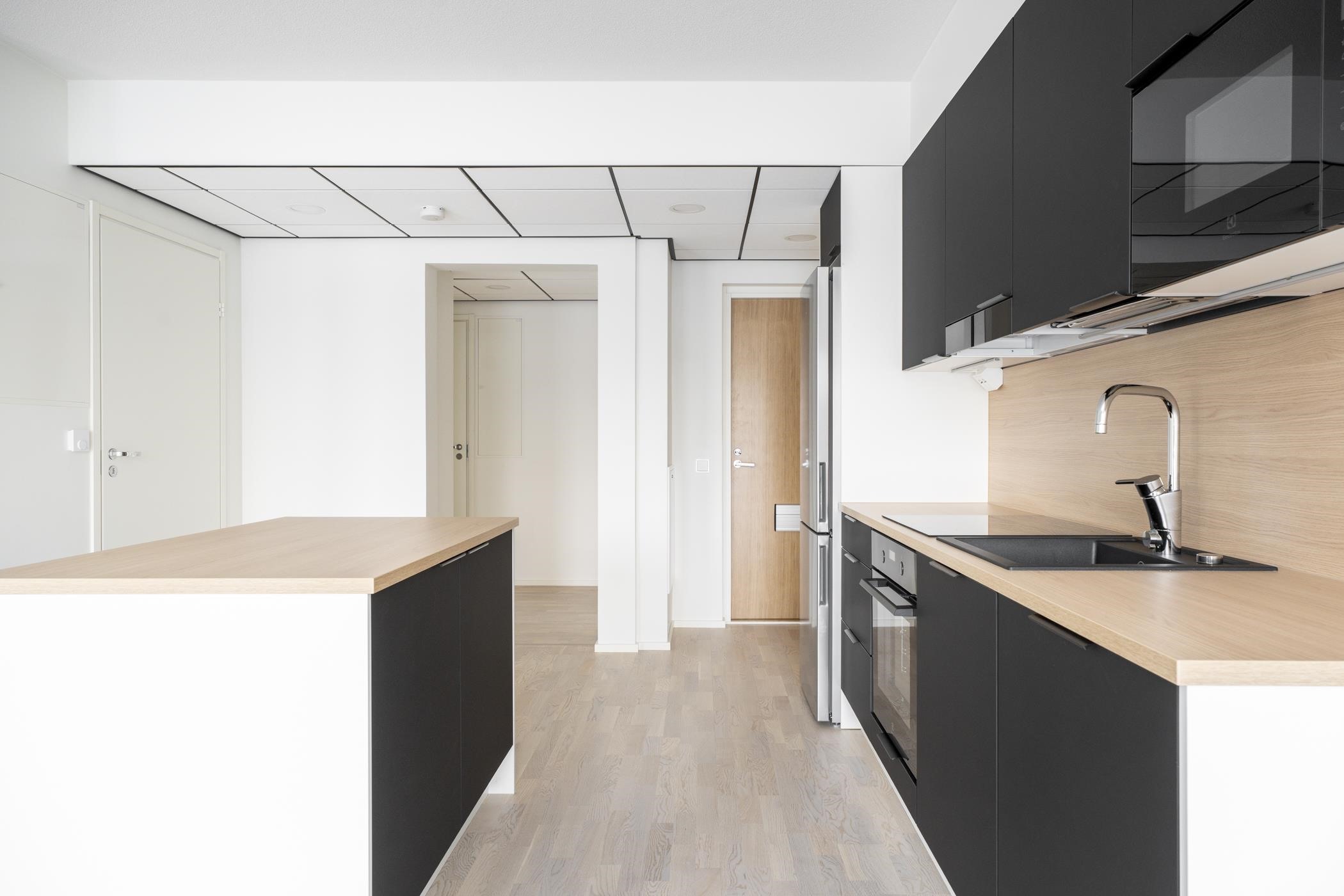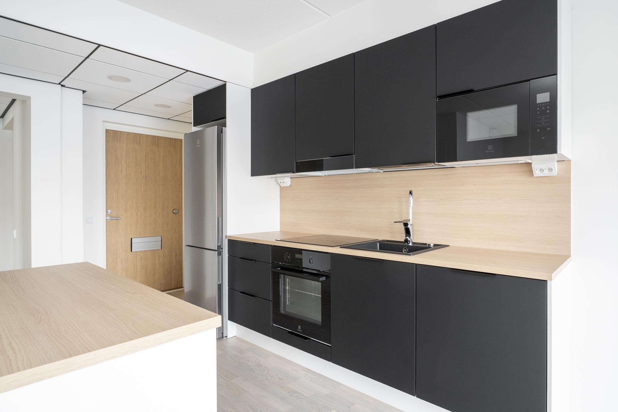 - Keittiöissä on erillisuuni, induktioliesitaso ja jää-pakastinkaappi. 2h- ja 3h-asuntojen keittiöissä on 60 cm leveä astianpesukone ja 1h-asunnoissa 45 cm leveä astianpesukone. Keittiöissä on tilavaraus mikroaaltouunille. Keittiön pöytätaso on laminaattitaso, johon on kiinnitetty valutasollinen 1-altainen rst-allas tai komposiittiallas.