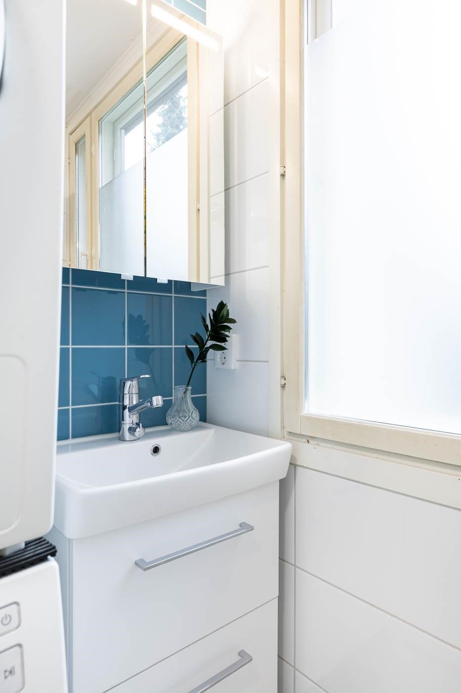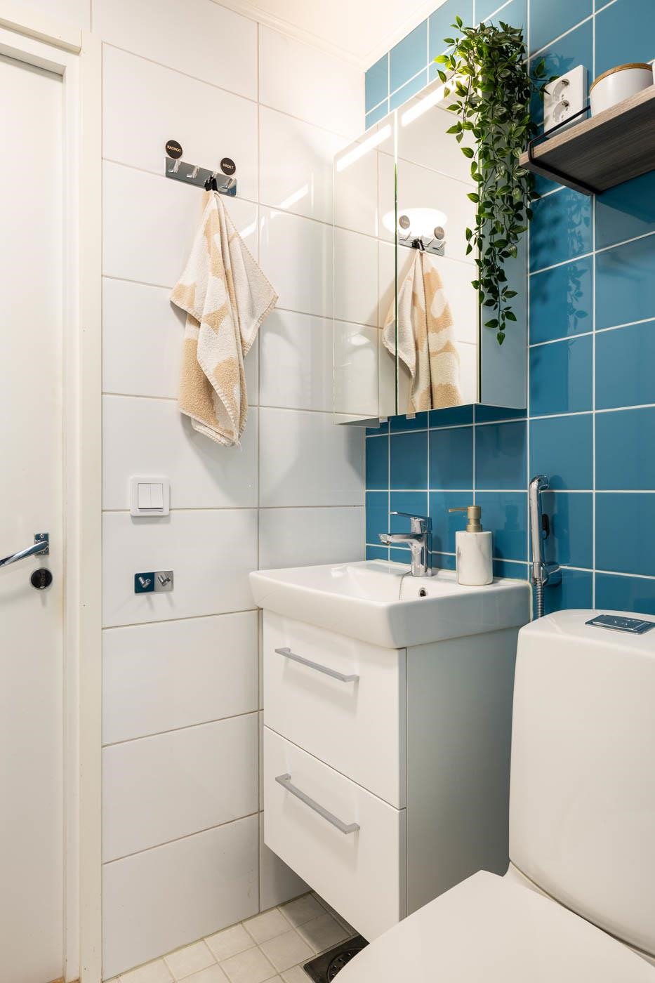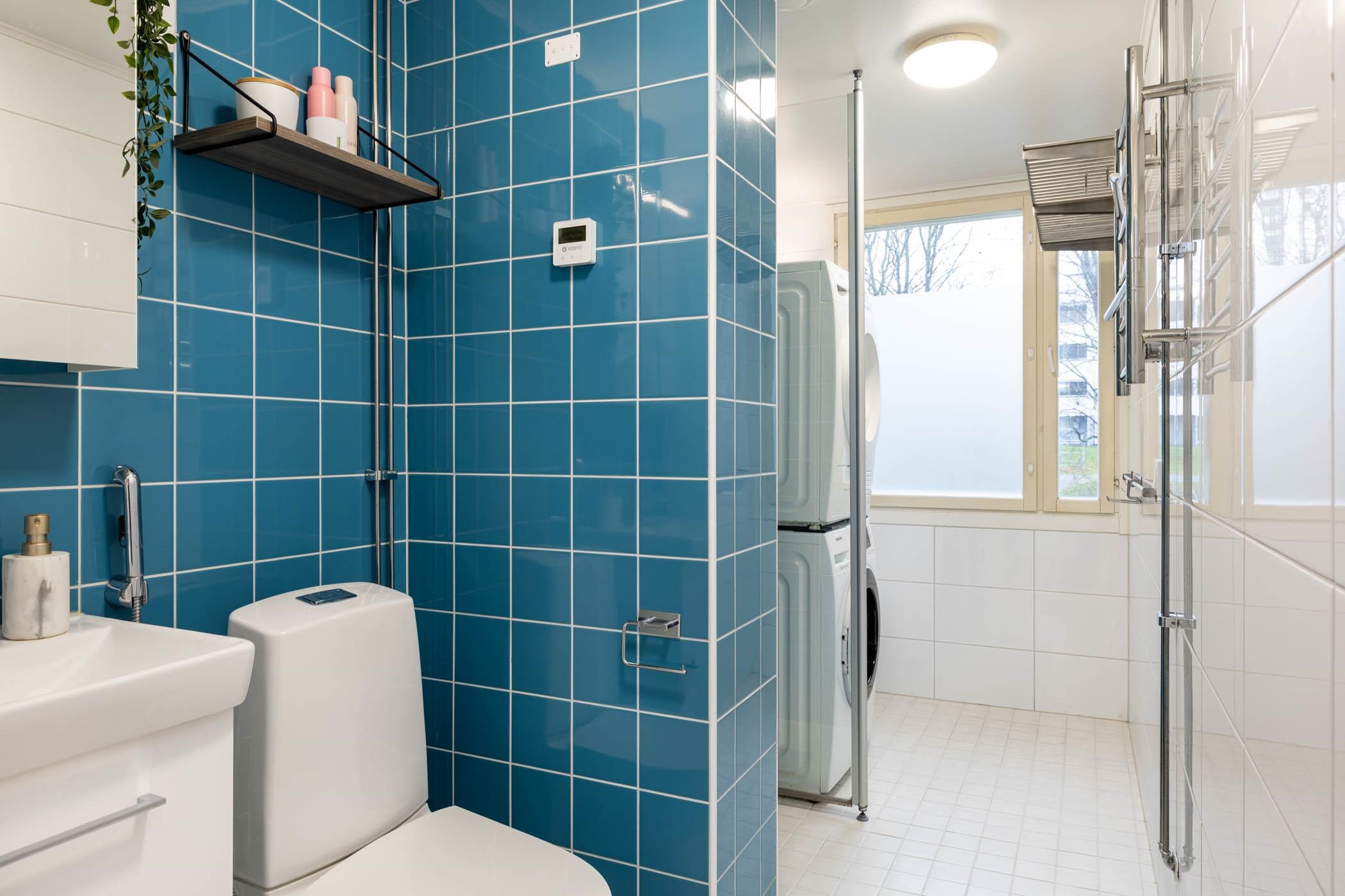 - Kylpyhuoneessa on suihku, suihkuseinä, kaksi peilikaappia ja kaksi allaskaappia, pesukoneliitäntä, wc istuin, bidee, kiinteät valaisimet ja lattialämmitys. Kylpyhuone ja wc -tila on remontoitu yhtiön putkistosaneerauksen yhteydessä vuonna 2020.