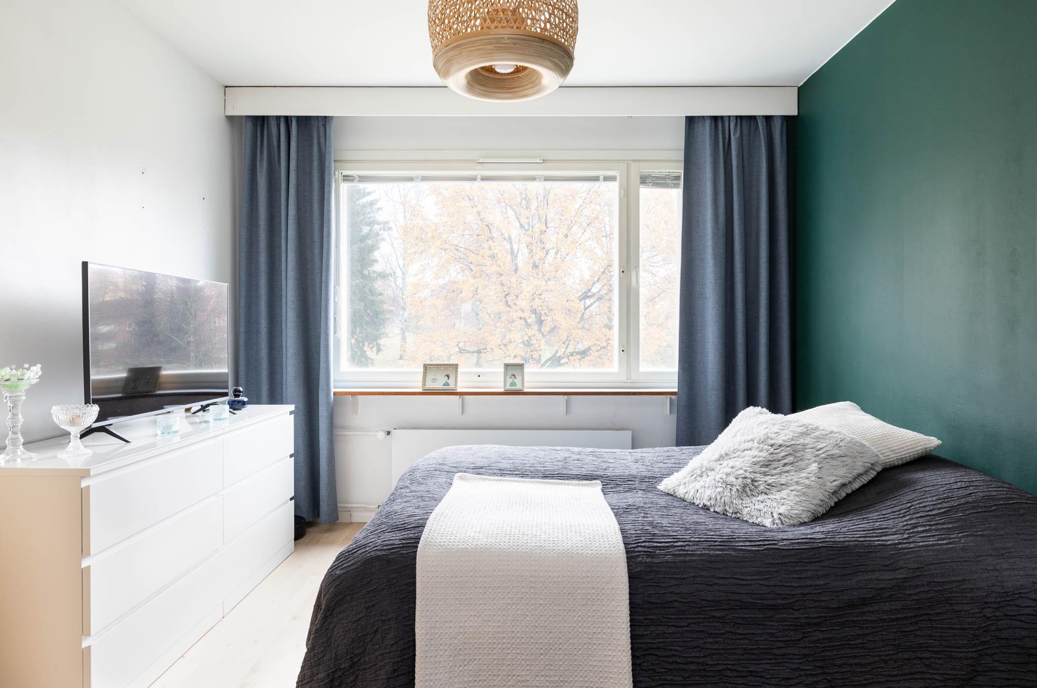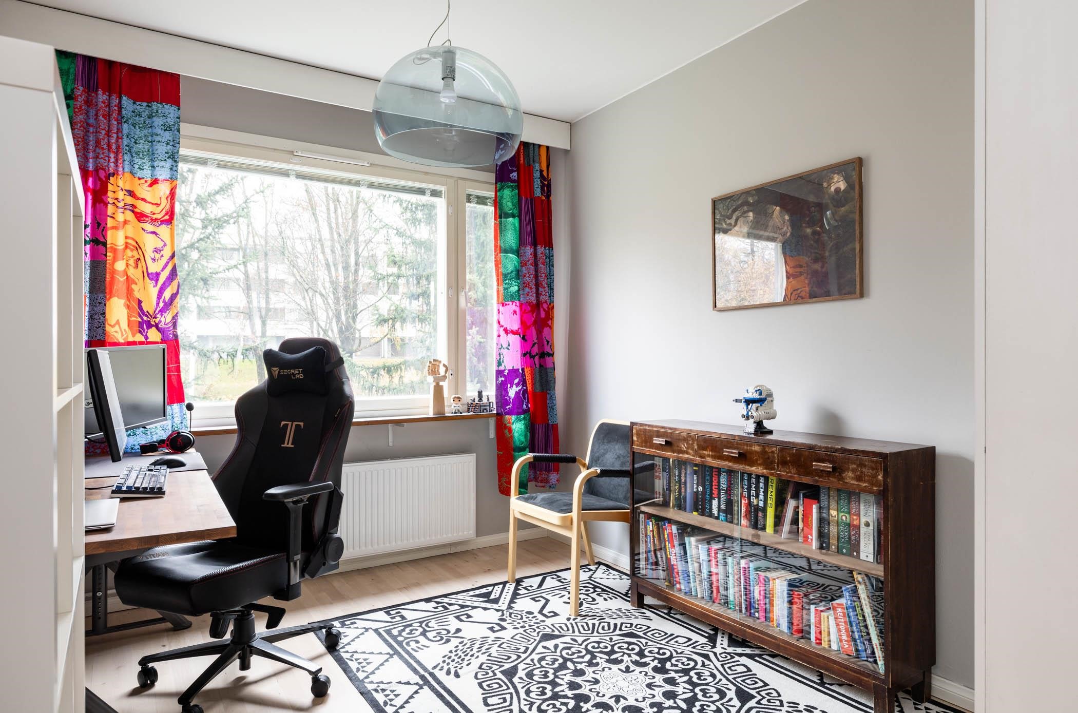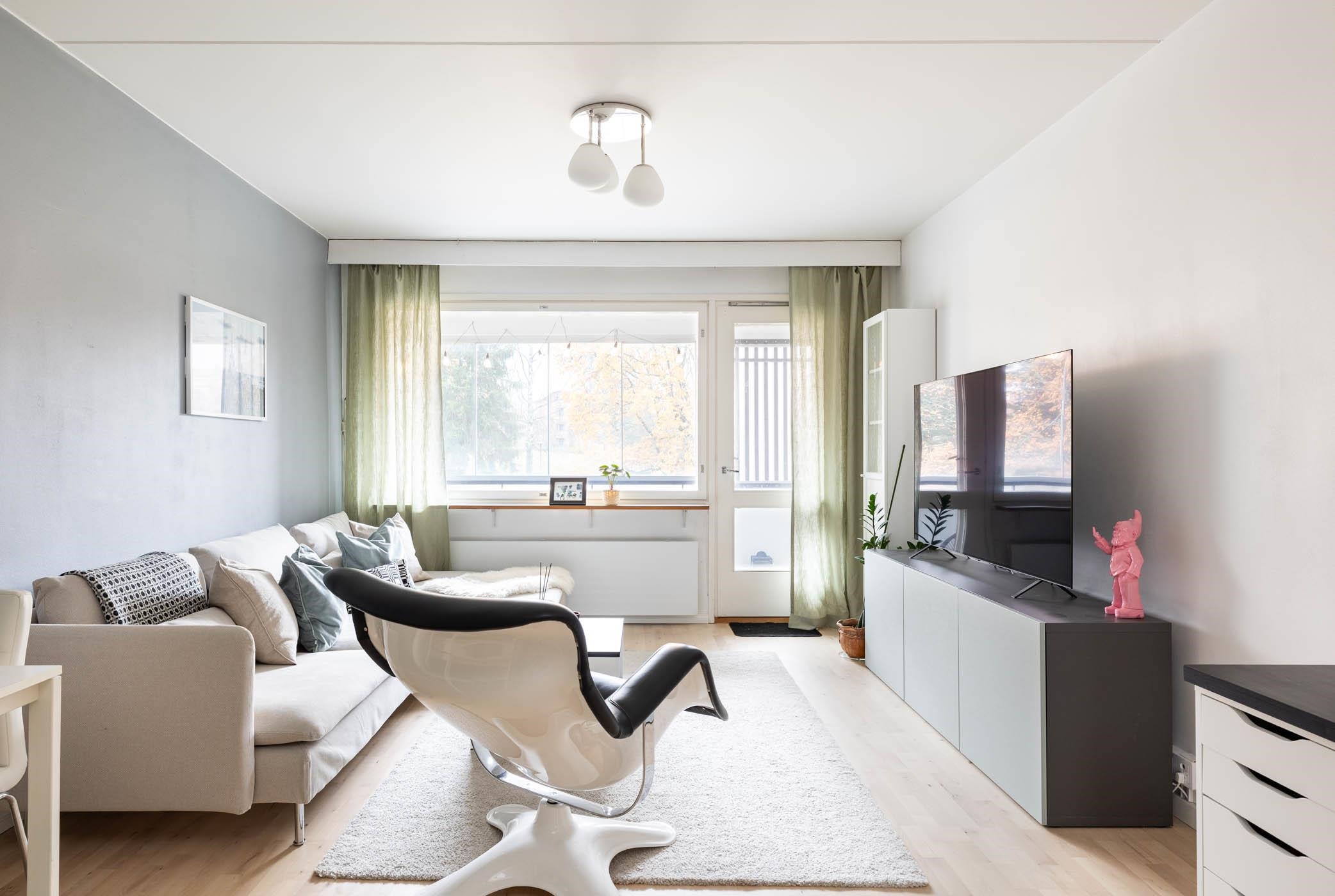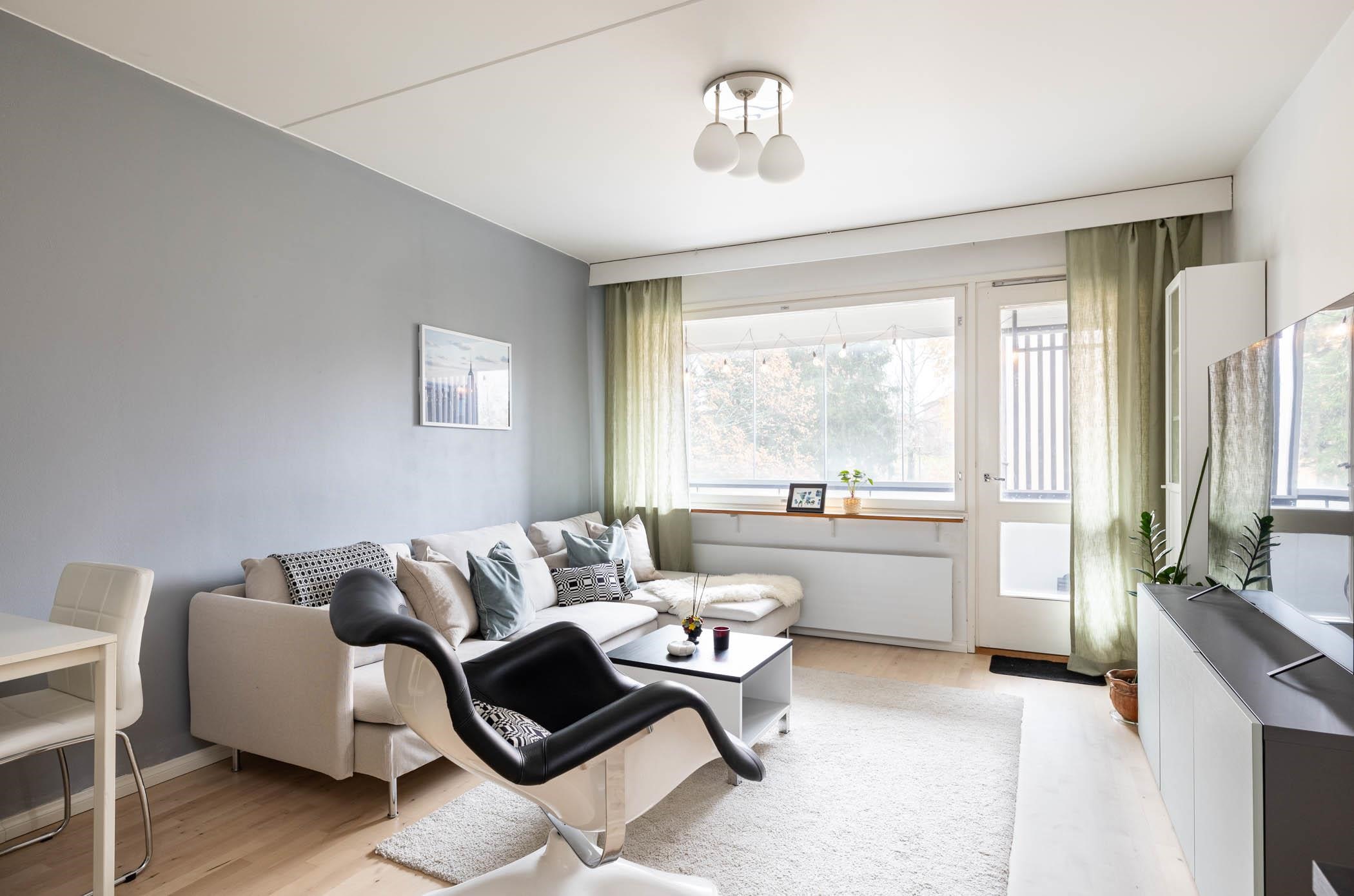 Asunnon pohjaratkaisu on suunniteltu käytännölliseksi, ja säilytystilaa on runsaasti vaatehuoneen ja kahden häkkivaraston ansiosta. Keittiö ja kylpyhuone on kumpikin remontoitu vuonna 2020. Valoisassa olohuoneessa on etelään suuntautuva lasitettu parveke, joka tarjoaa ihastuttavat puistonäkymät.
