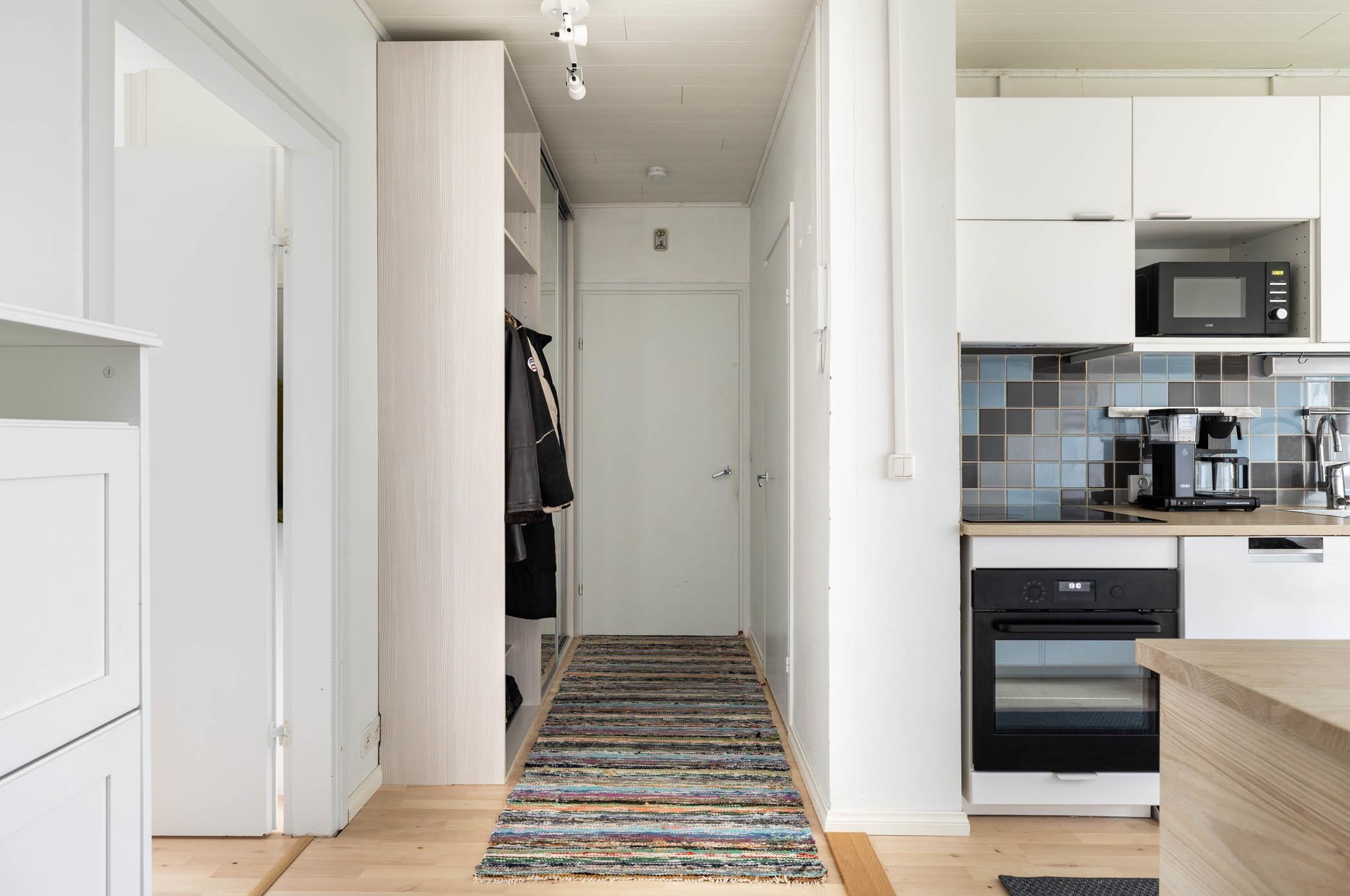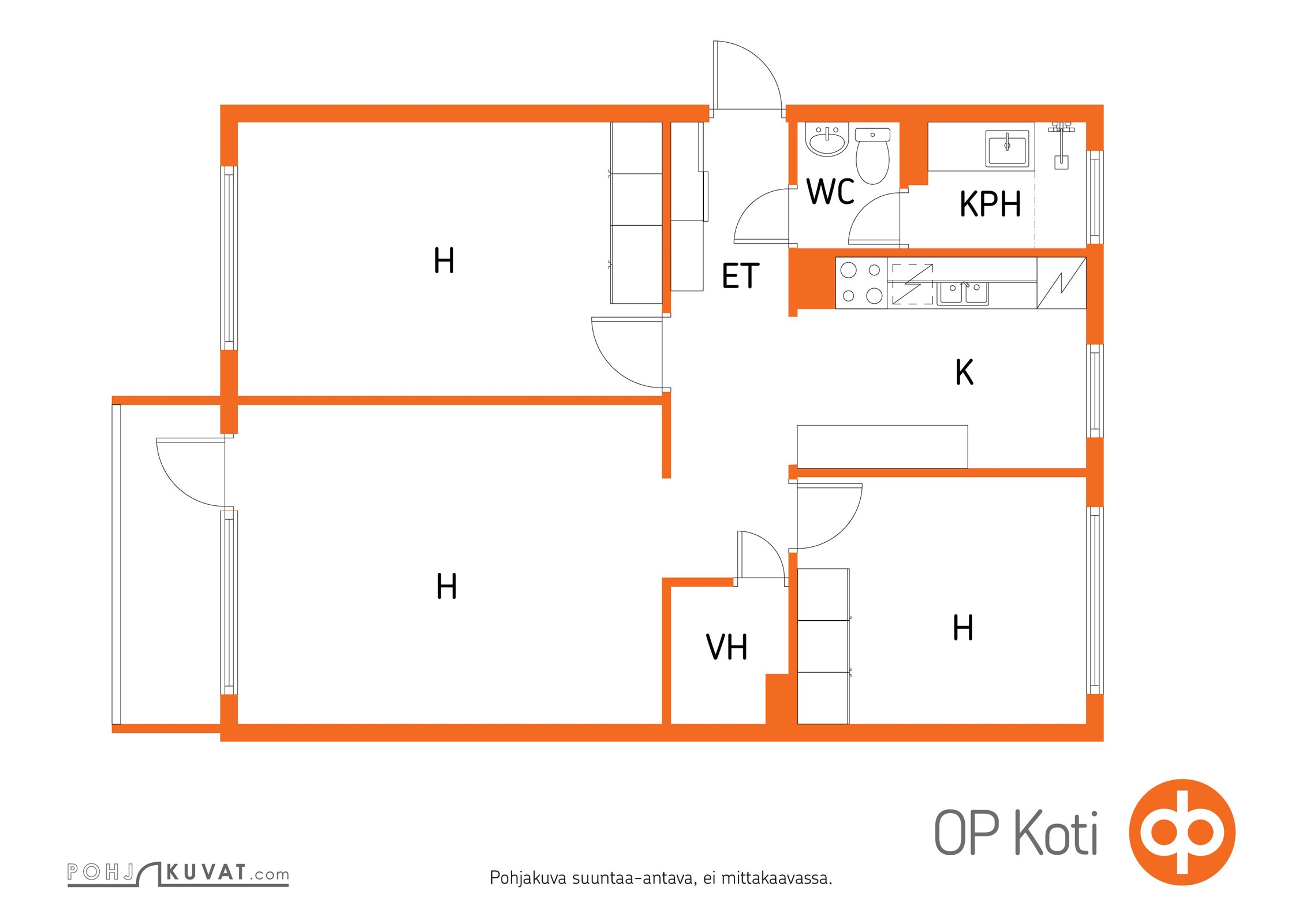 - Olohuone, parveke ja yksi makuuhuone etelään. Kylpyhuone, keittiö ja yksi makuuhuone pohjoiseen.