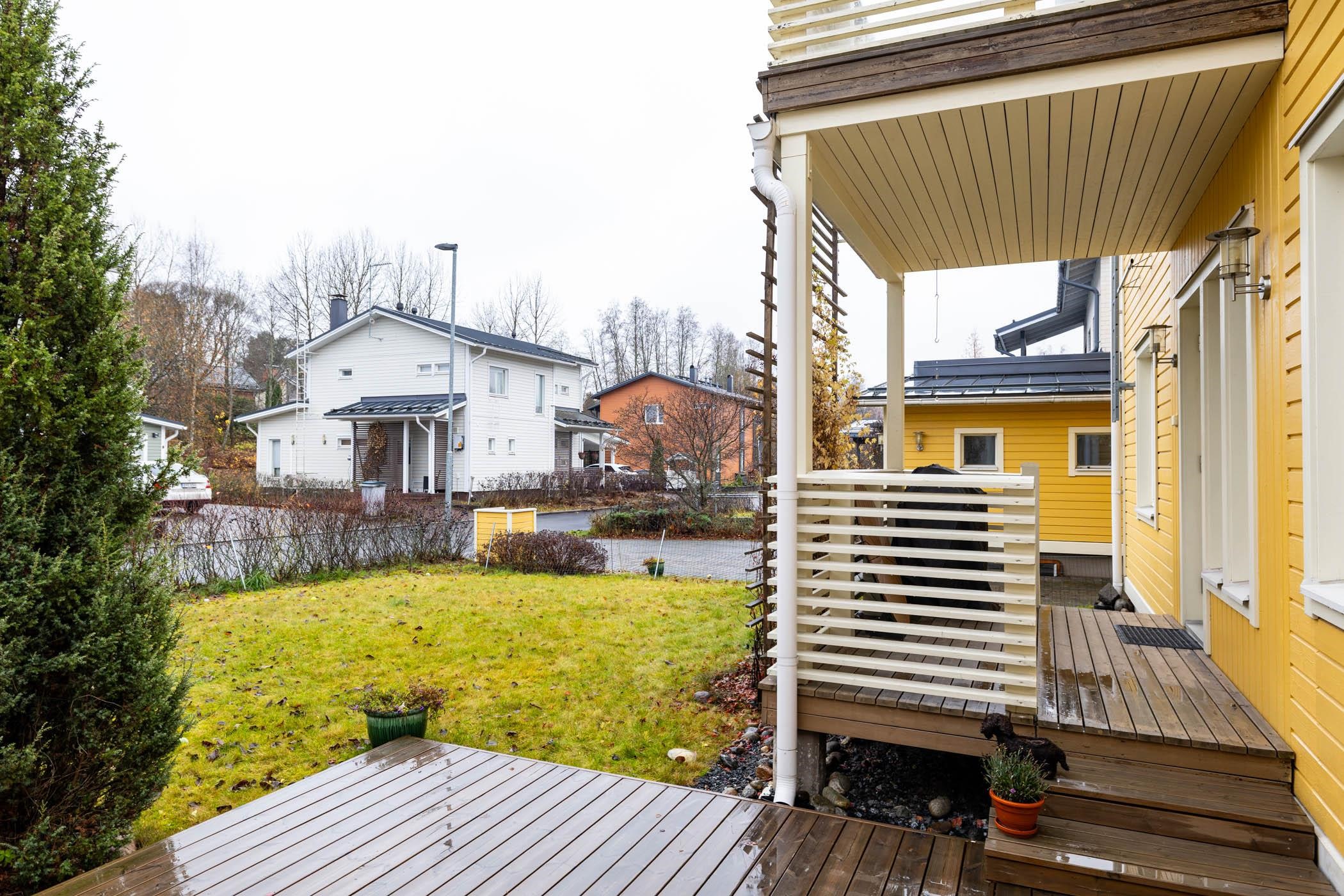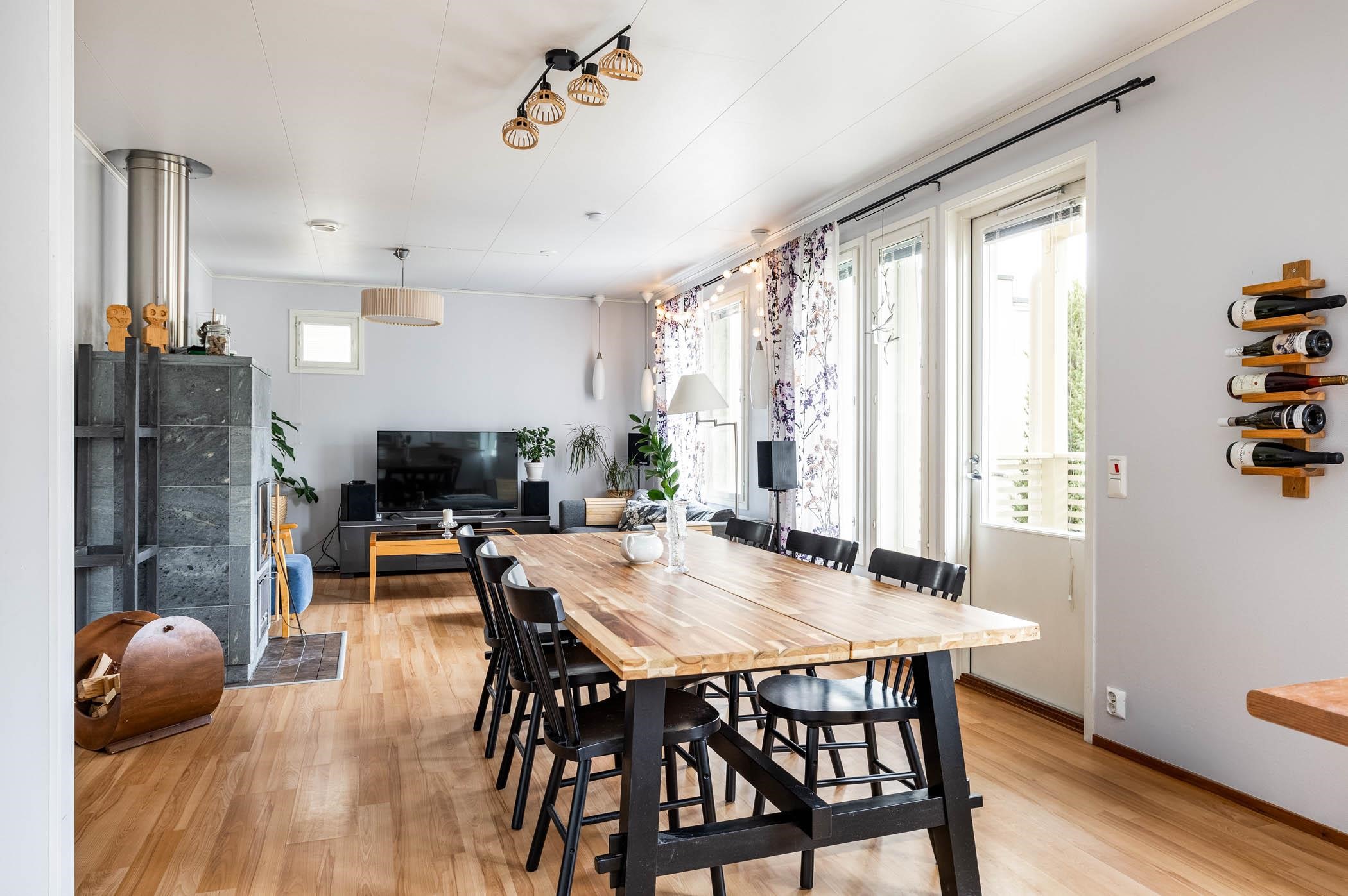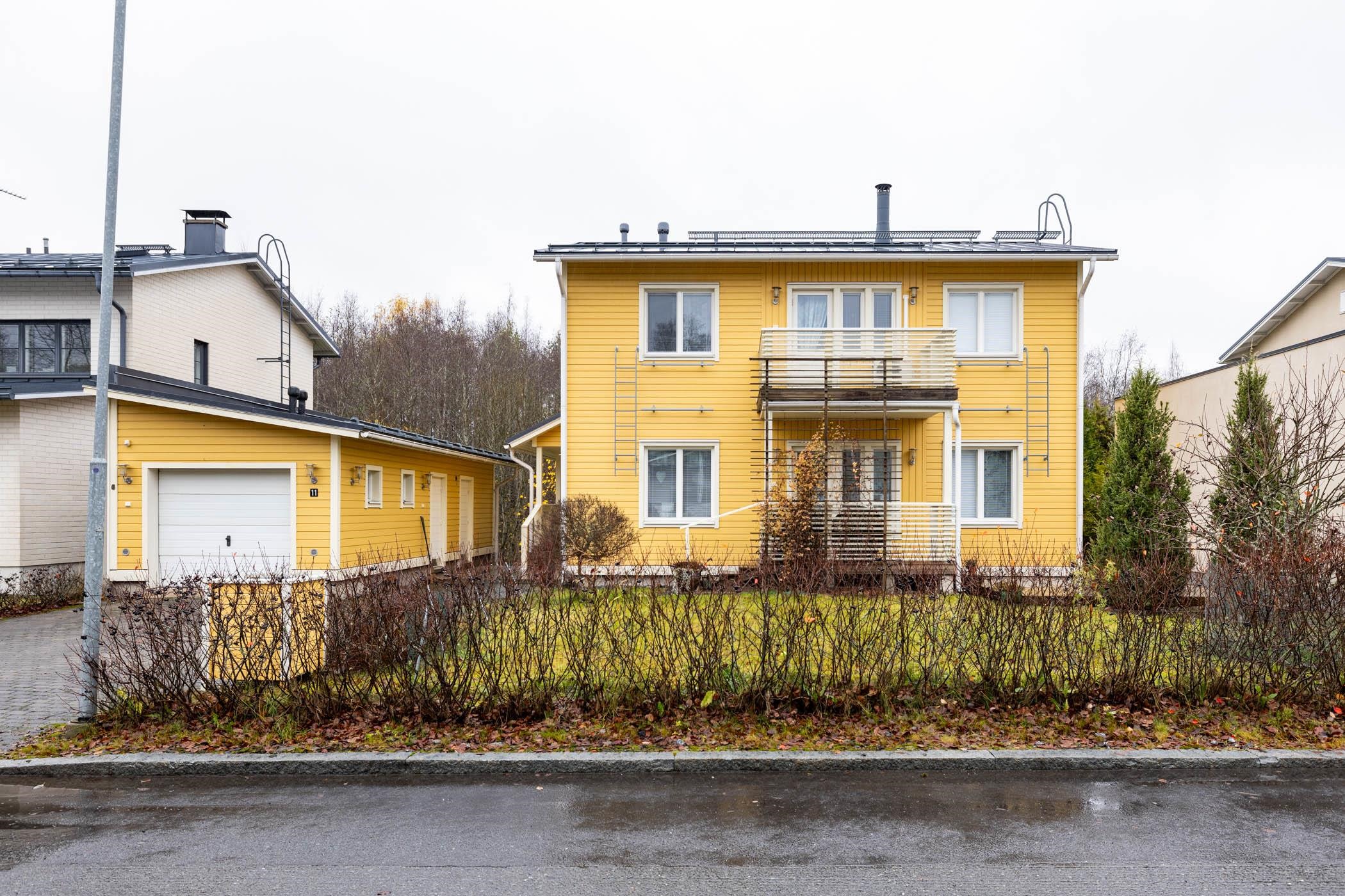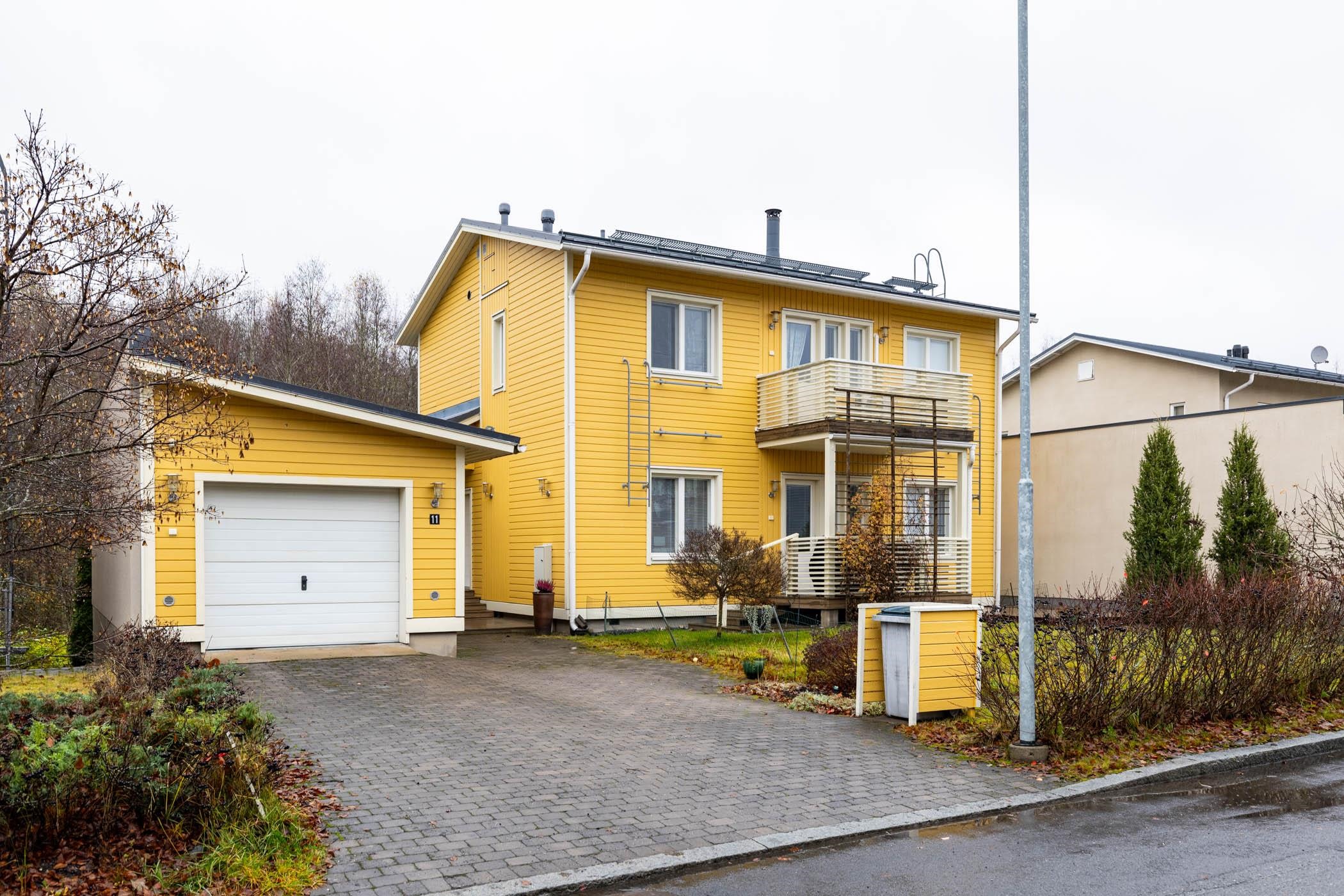 Omakotitalo puiston laidalla jossa tilaa, rauhaa ja toimivuutta Finninmäessä Tämä vuonna 2008 valmistunut omakotitalo sijaitsee Tampereen Finninmäessä, rauhallisella ja luonnonläheisellä alueella, jossa arki soljuu mukavasti kaupunkielämän ja metsänrauhan rajapinnassa. Tontti rajoittuu takapihan osalta puistoon, mikä tekee pihapiiristä erityisen suojaisan ja vehreän. Kodin tilaratkaisut on suunniteltu arjen sujuvuutta ajatellen. Alakerrassa avautuu valoisa olohuone, jonka yhteydessä on ruokailutila ja toimiva keittiö. Lisäksi löytyy yksi makuuhuone, wc/suihku sekä tilava eteinen. Yläkerrassa sijaitsee kolme makuuhuonetta, aulatila ja toinen wc, minkä lisäksi lämmin varasto ja tekninen tila tuovat käytännöllisyyttä asumiseen. Kokonaispinta-ala on 149,2 m², josta asuintilojen osuus on 144 m². Viiden huoneen kokonaisuus tarjoaa runsaasti tilaa niin perheelle kuin etätyöskentelyyn tai harrastuksiin. Kodin tunnelma, tilavuus ja sijainti tekevät tästä kohteesta harvinaisen yhdistelmän, täällä voit todella viihtyä. Tule tutustumaan ja ihastu Finninmäen rauhaan ja tämän kodin monipuolisiin mahdollisuuksiin!
