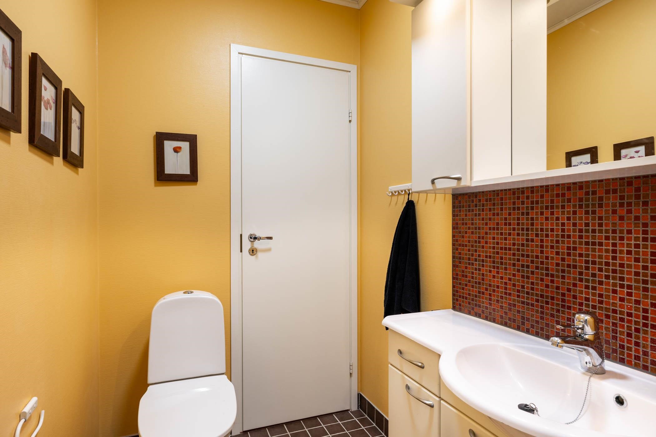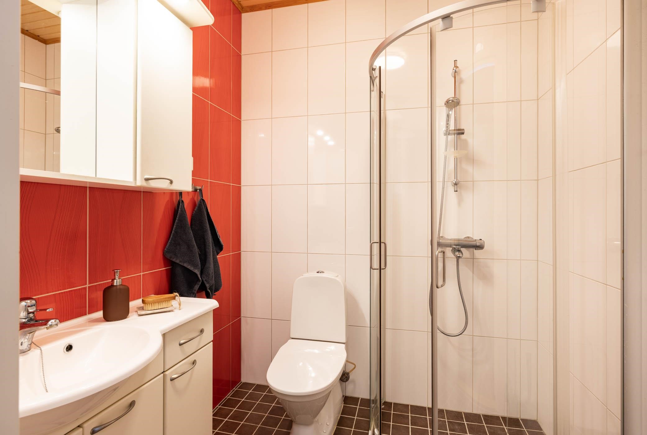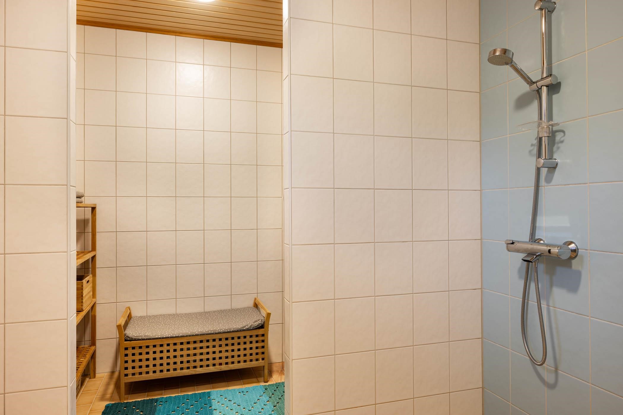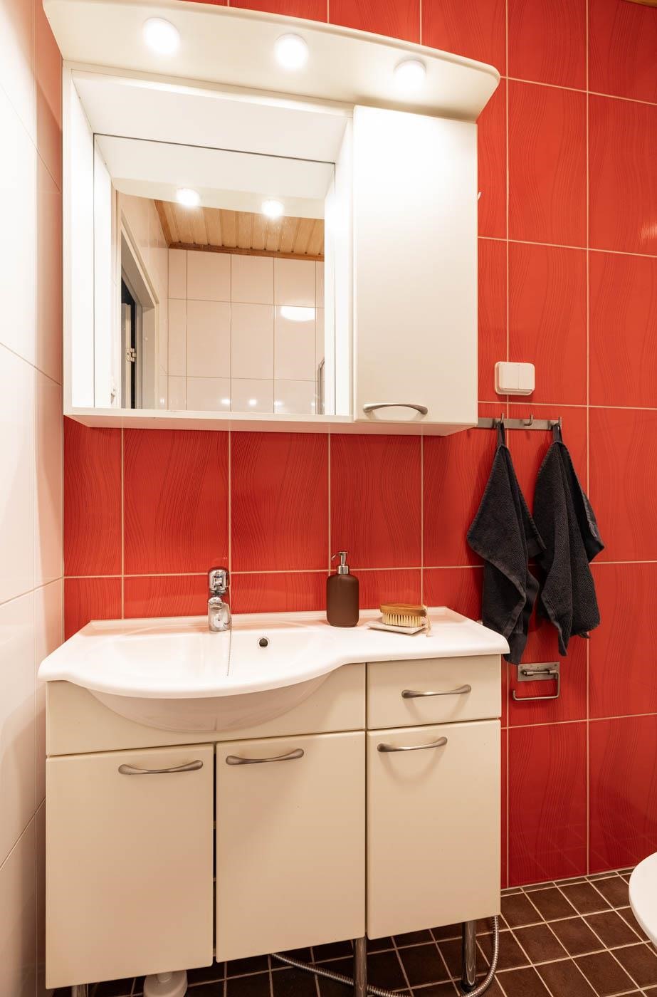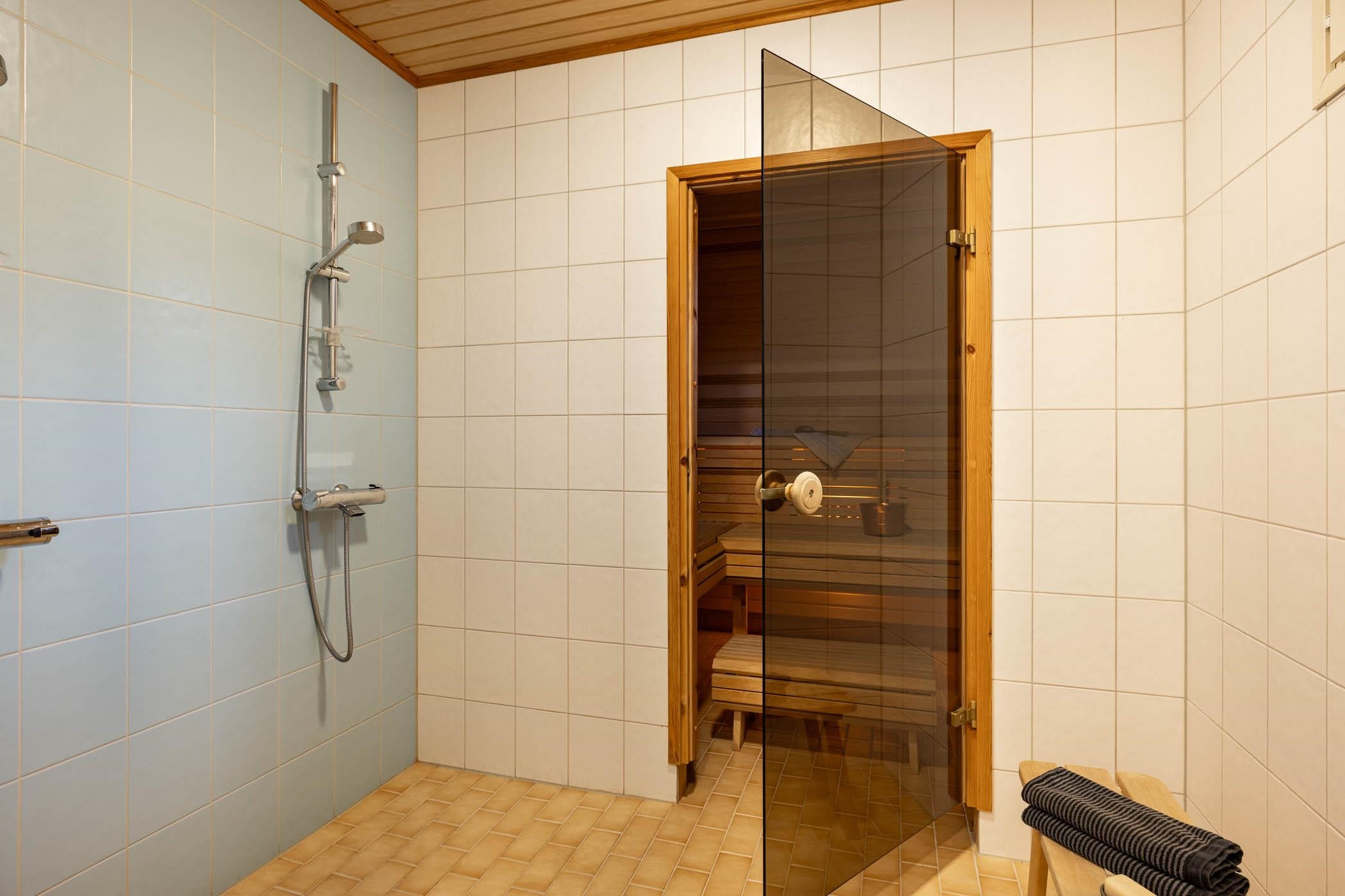 - Sauna, sähkökiuas kertaalleen vaihdettu, kylpyhuone sis 2 suihkua, erillinen wc molemmissa kerroksissa, suihku kaikkiaan kolme, suihkuseinä Alakerran suihkussa, peilit molemmissa wc, peilikaappi molemmissa wc, allaskaappi molemmissa wc, lattialämmitys sähkötoiminen, kiinteät valaisimet. Suihkusekoittajat uusittu , kodinhoitohuoneessa vesipiste/allas