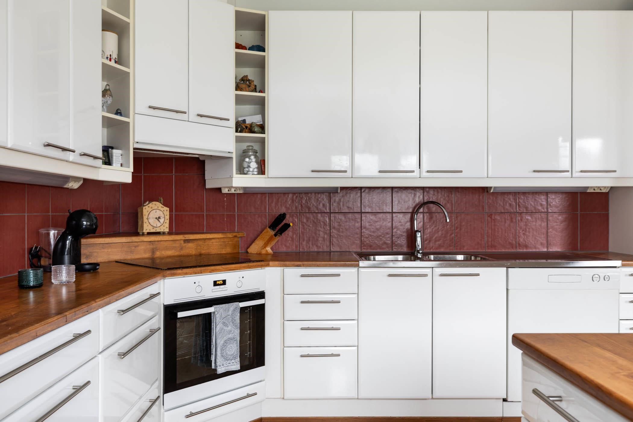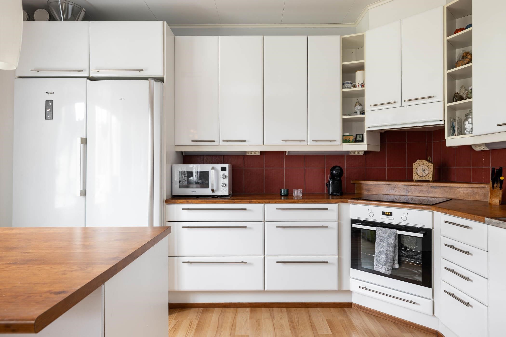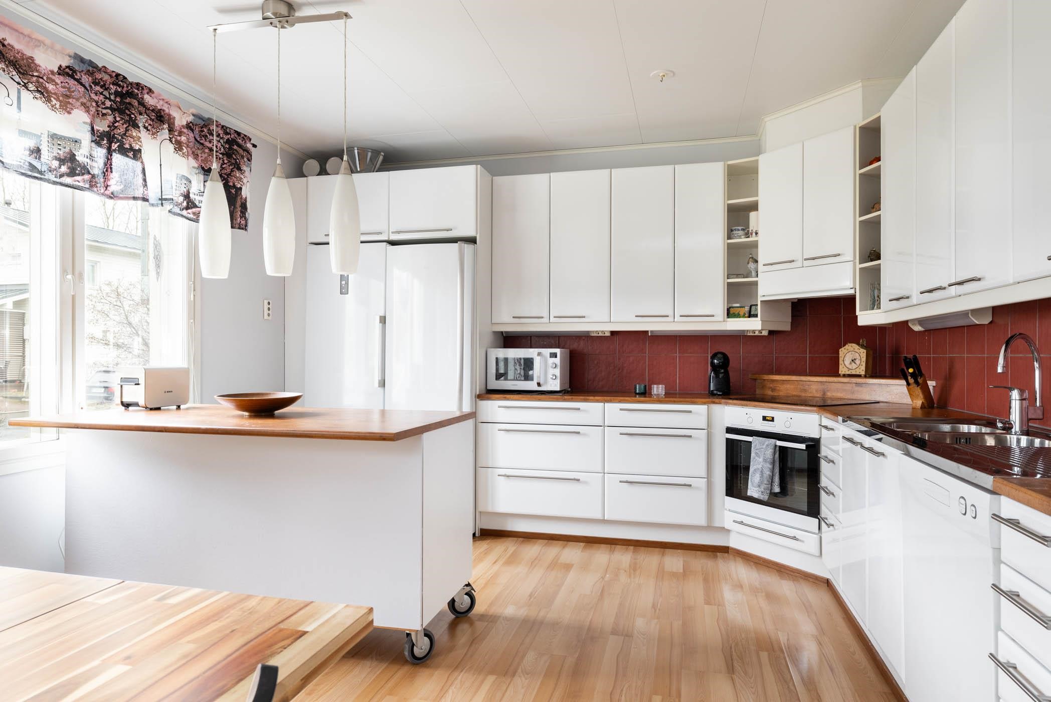 - Jääkaappi kertaalleen uusittu, pakastekaappi, erillisuuni kertaalleen uusittu, induktioliesi kertaalleen uusittu, liesituuletin, astianpesukone Alkuperäinen, kaapistot, irralliset saarekkeet, kiinteät valaisimet, pöytätasojen materiaali laminaattui. Keittiöhana uusittu