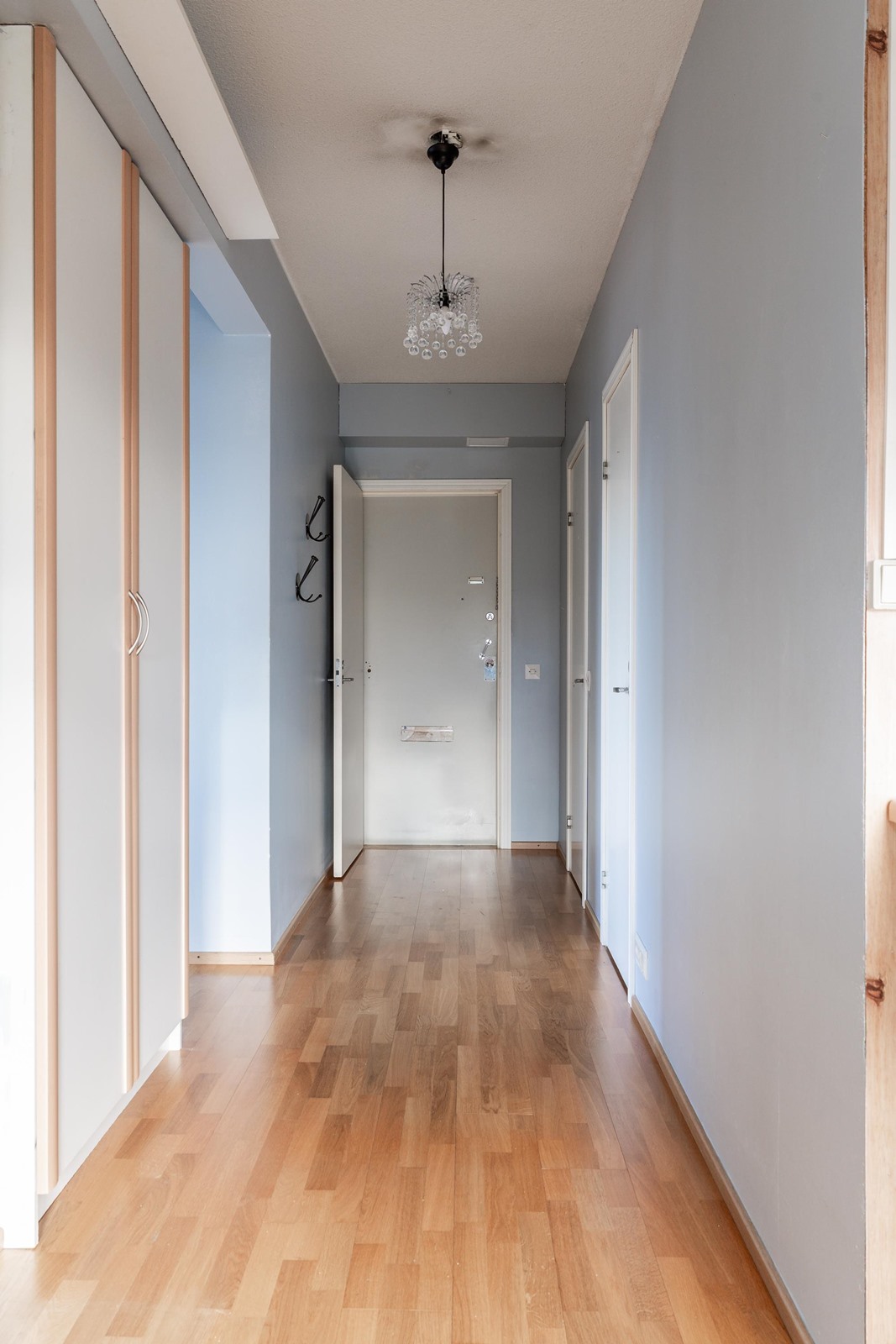 Keittiö: parketti ja maalattu seinä. Olohuone: parketti ja tapetoitu. Makuuhuone 1: muovimatto ja tapetoitu. Kylpyhuone: laatoitettu.