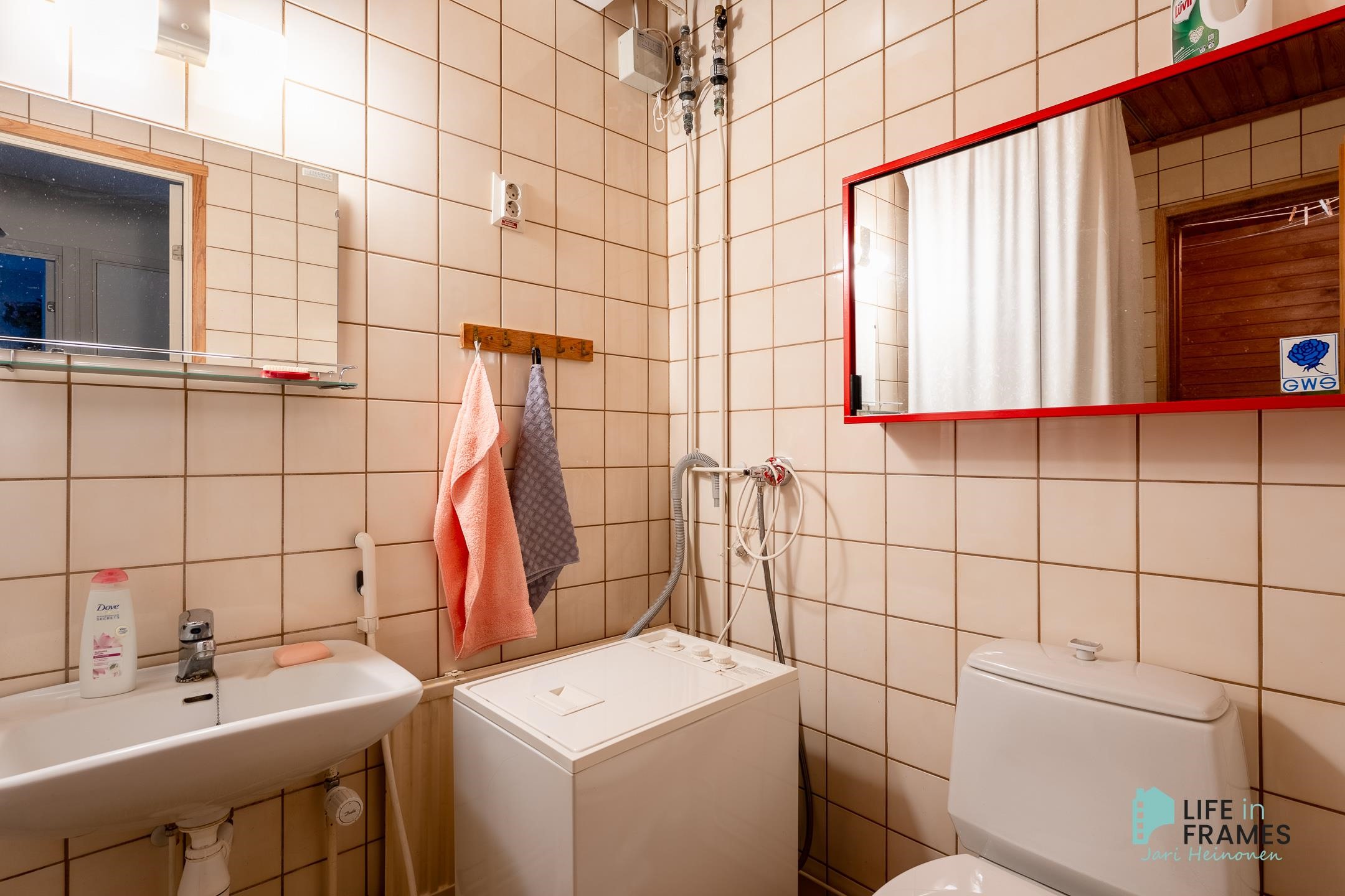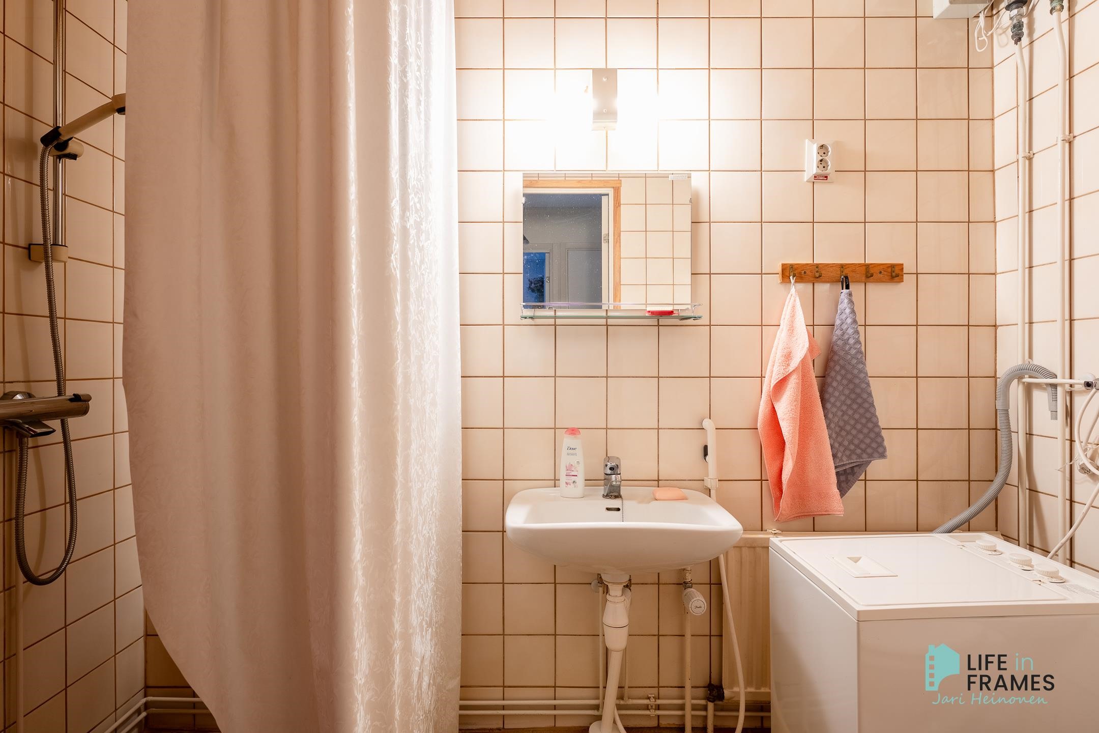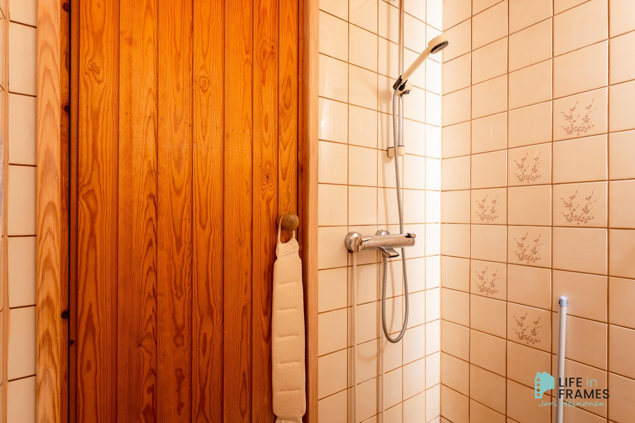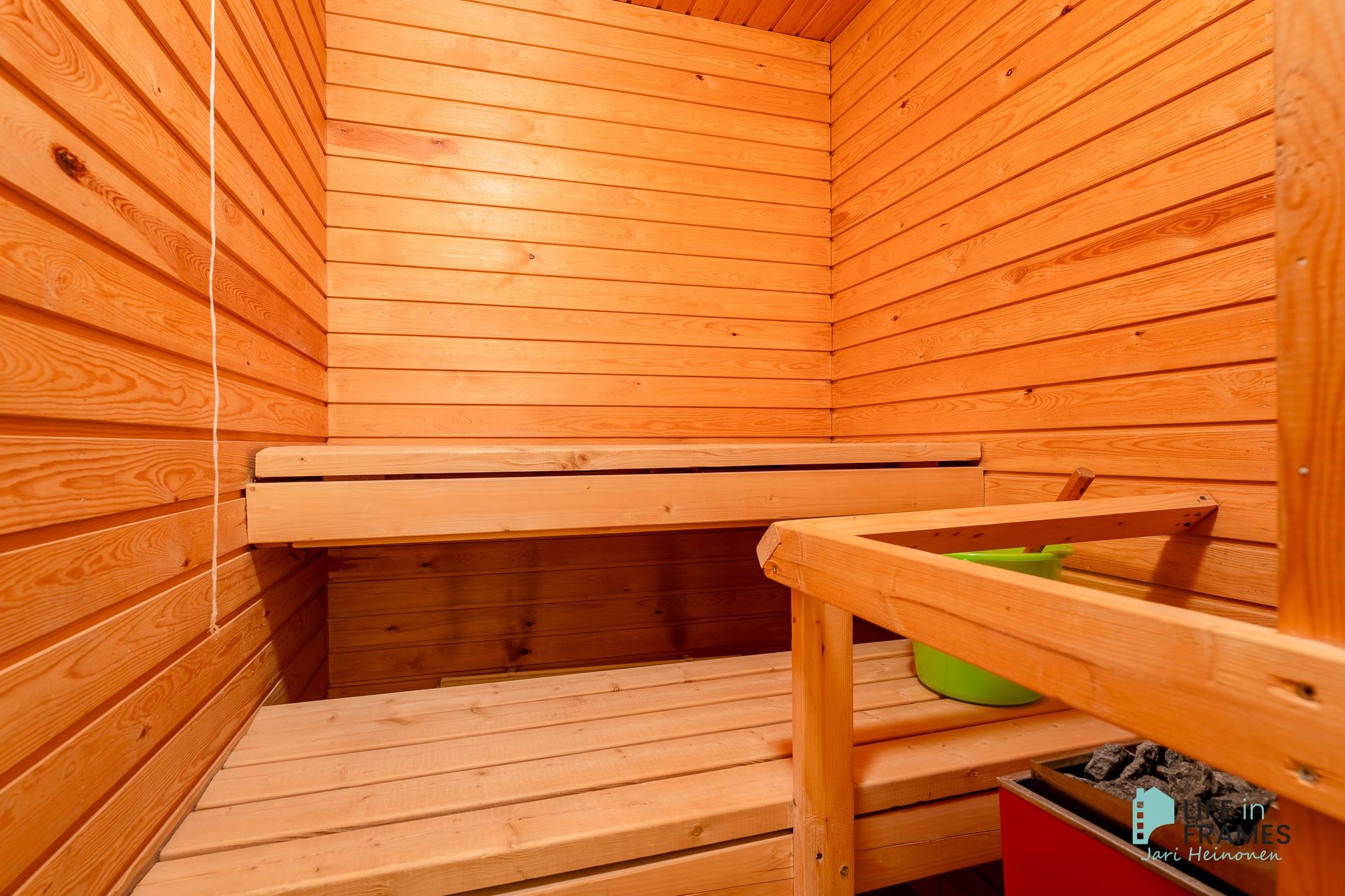 - Sauna, sähkökiuas, kylpyhuone, suihku, peilit, pesukoneliitäntä, kiinteät valaisimet.