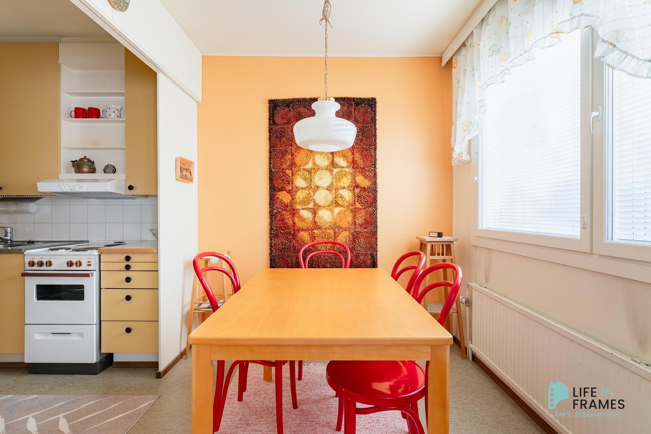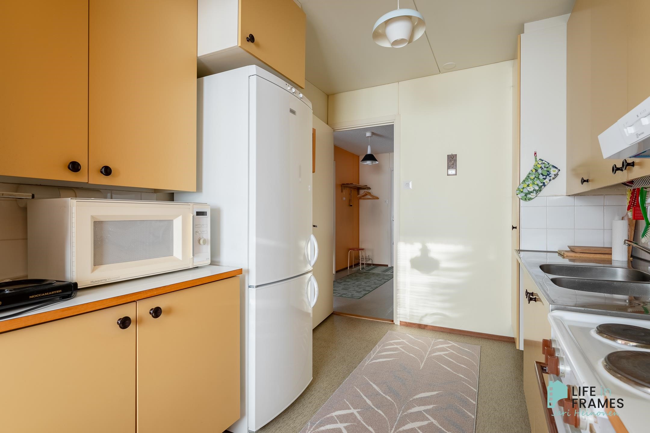 - Jääkaappipakastin, sähköliesi, liesituuletin, mikroaaltouuni, kaapistot, kiinteät valaisimet.