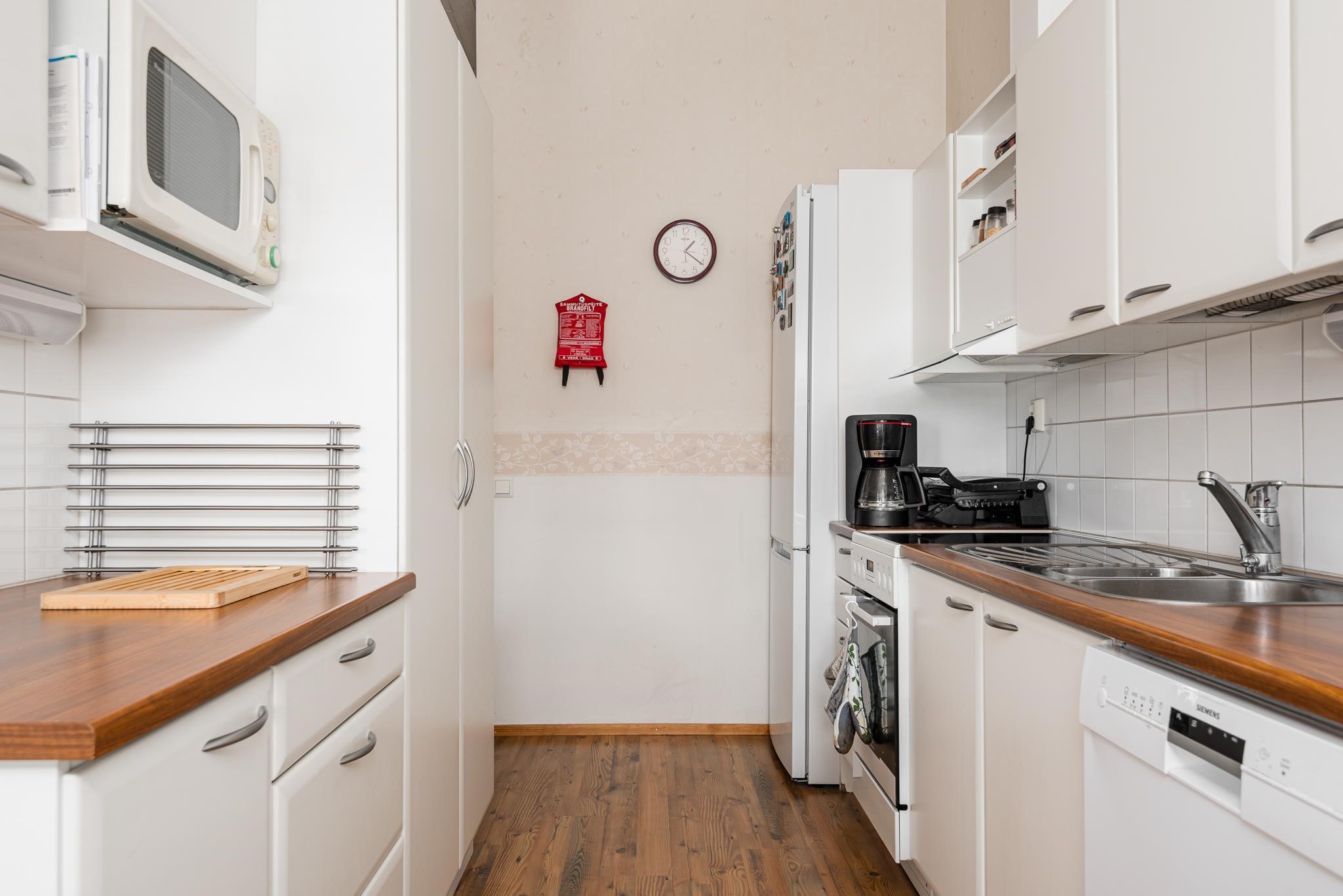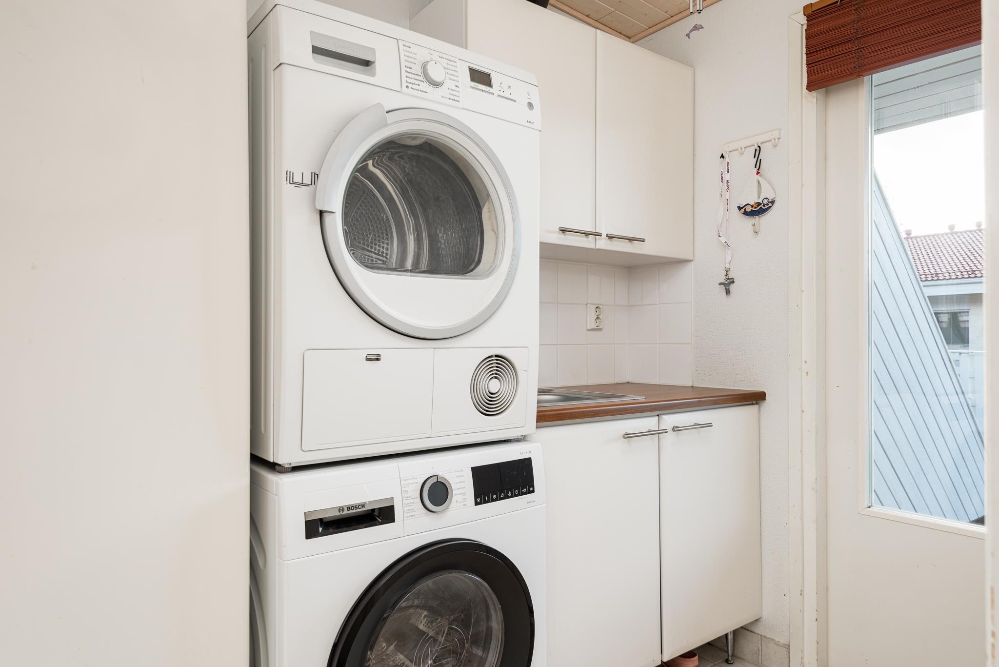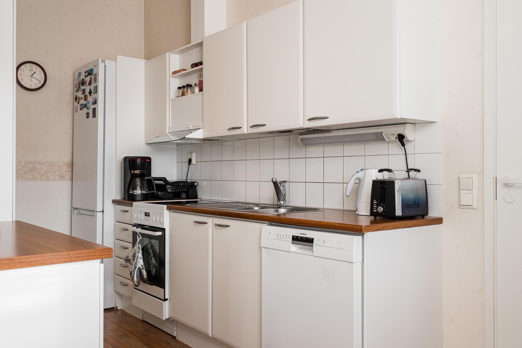 - Jääkaappipakastin, keraaminen liesi, liesituuletin, astianpesukone, kaapistot, kiinteät valaisimet.
