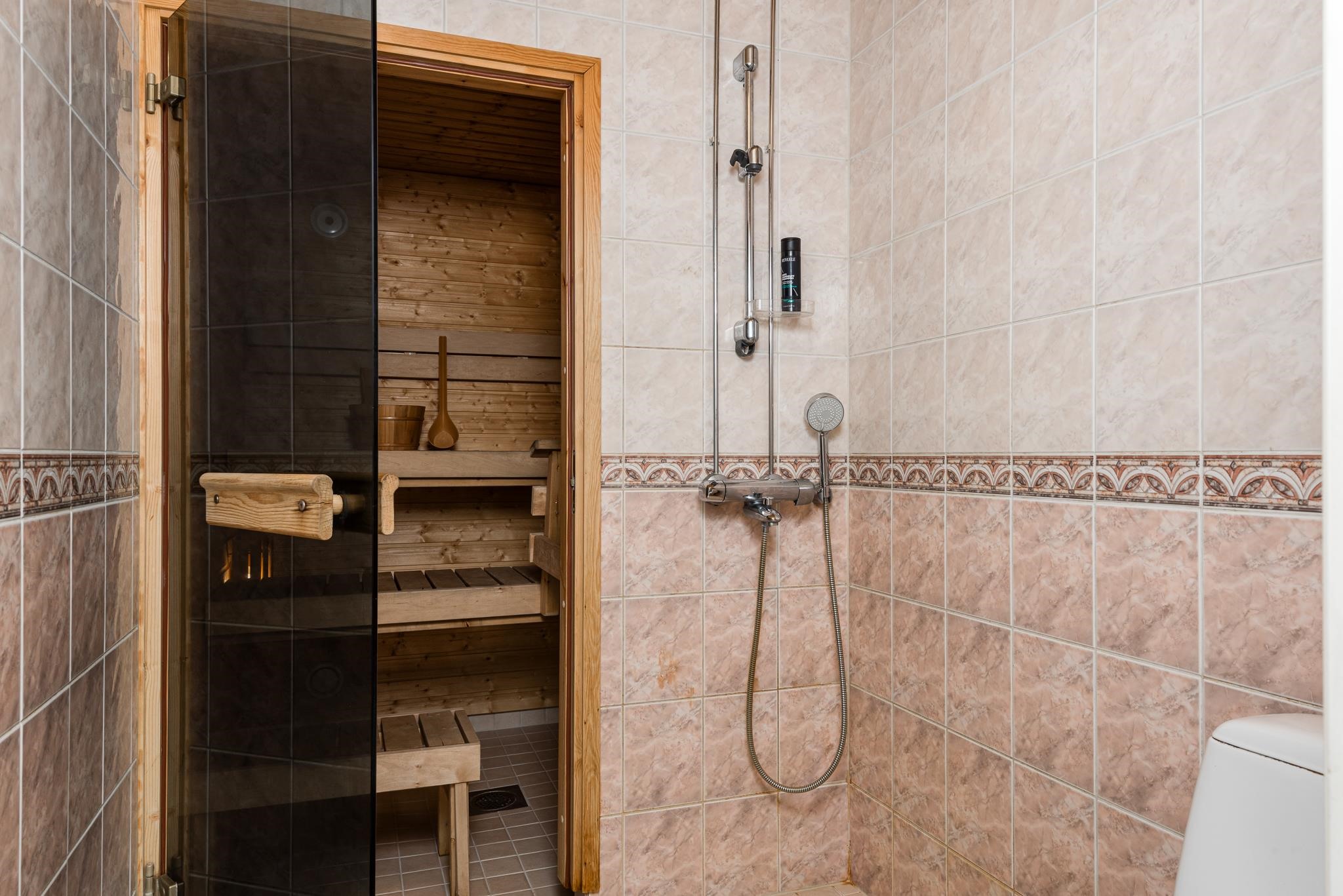 - Sauna, sähkökiuas, kylpyhuone Toinen wc-istuin, erillinen wc, suihku, peilikaappi, allaskaappi, pesukoneliitäntä, kiinteät valaisimet.