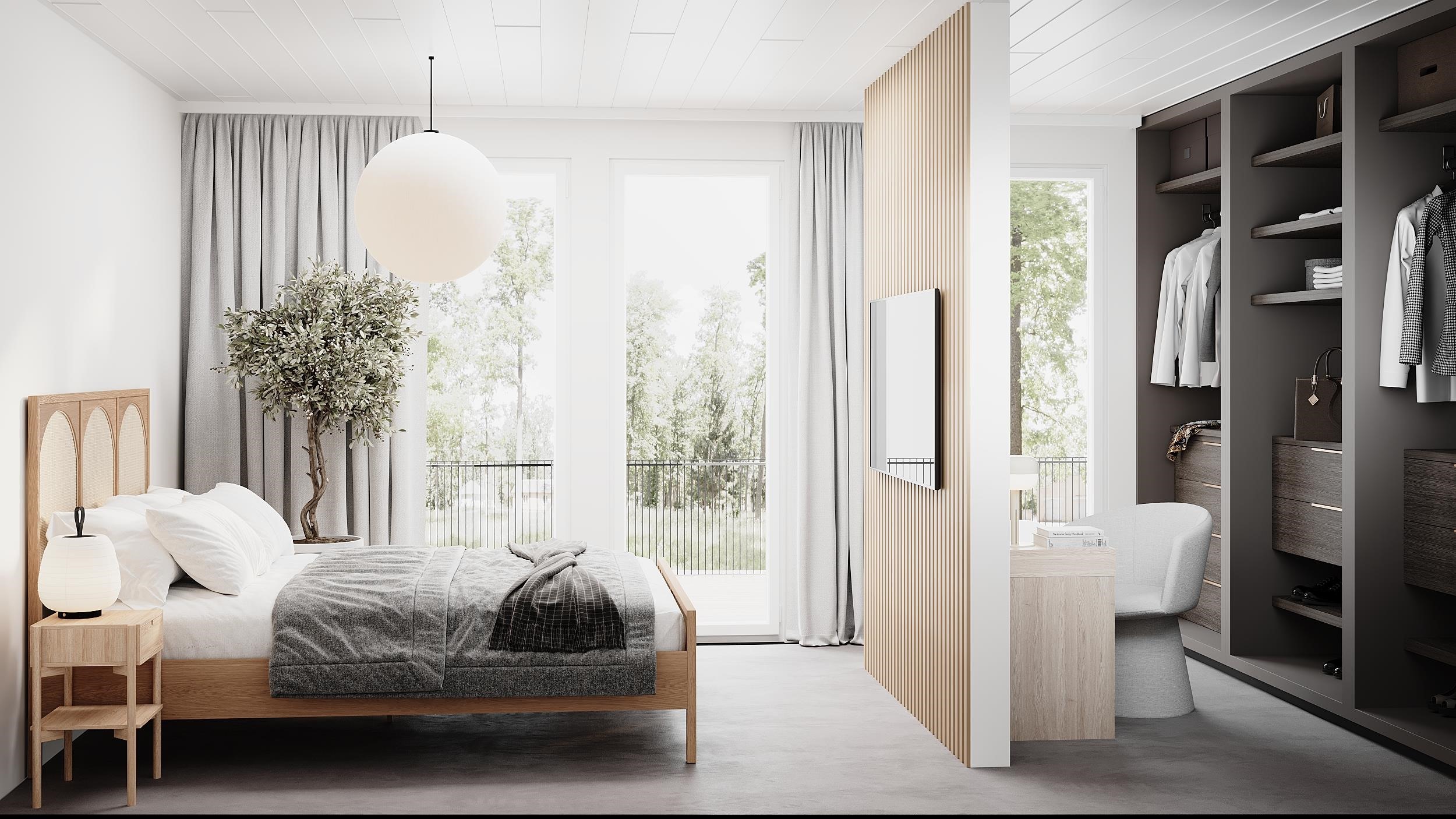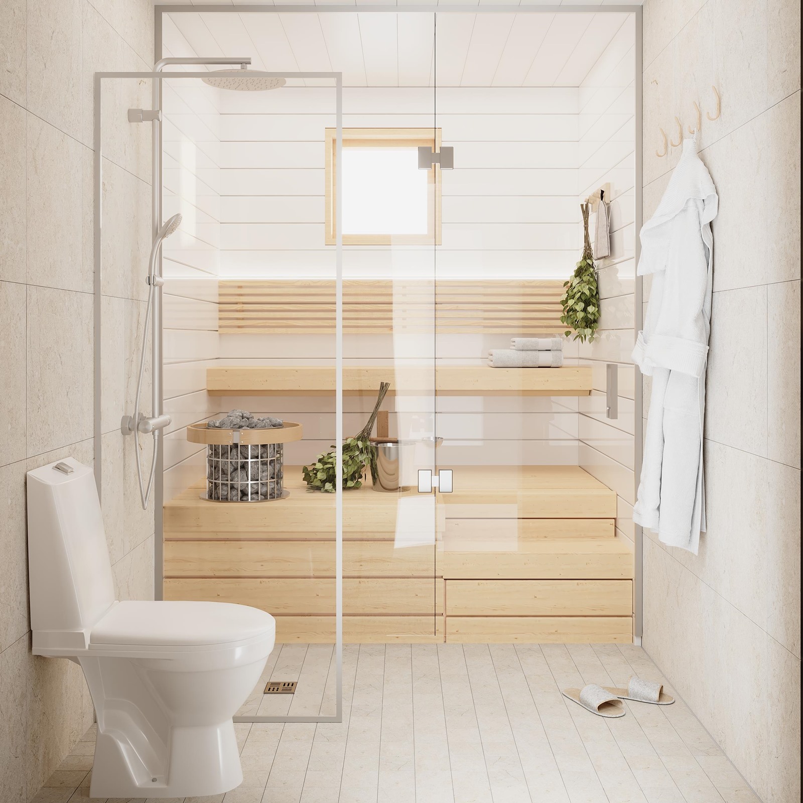 - Kylpyhuoneet ja pesutilat laatoitetaan, ja saunat paneloidaan. Saunan ja pesuhuoneen välinen lasiseinä tuo tilaan avaruutta ja modernia ilmettä. Kodinhoitotiloissa on varaukset sekä pyykinpesukoneelle että kuivausrummulle.