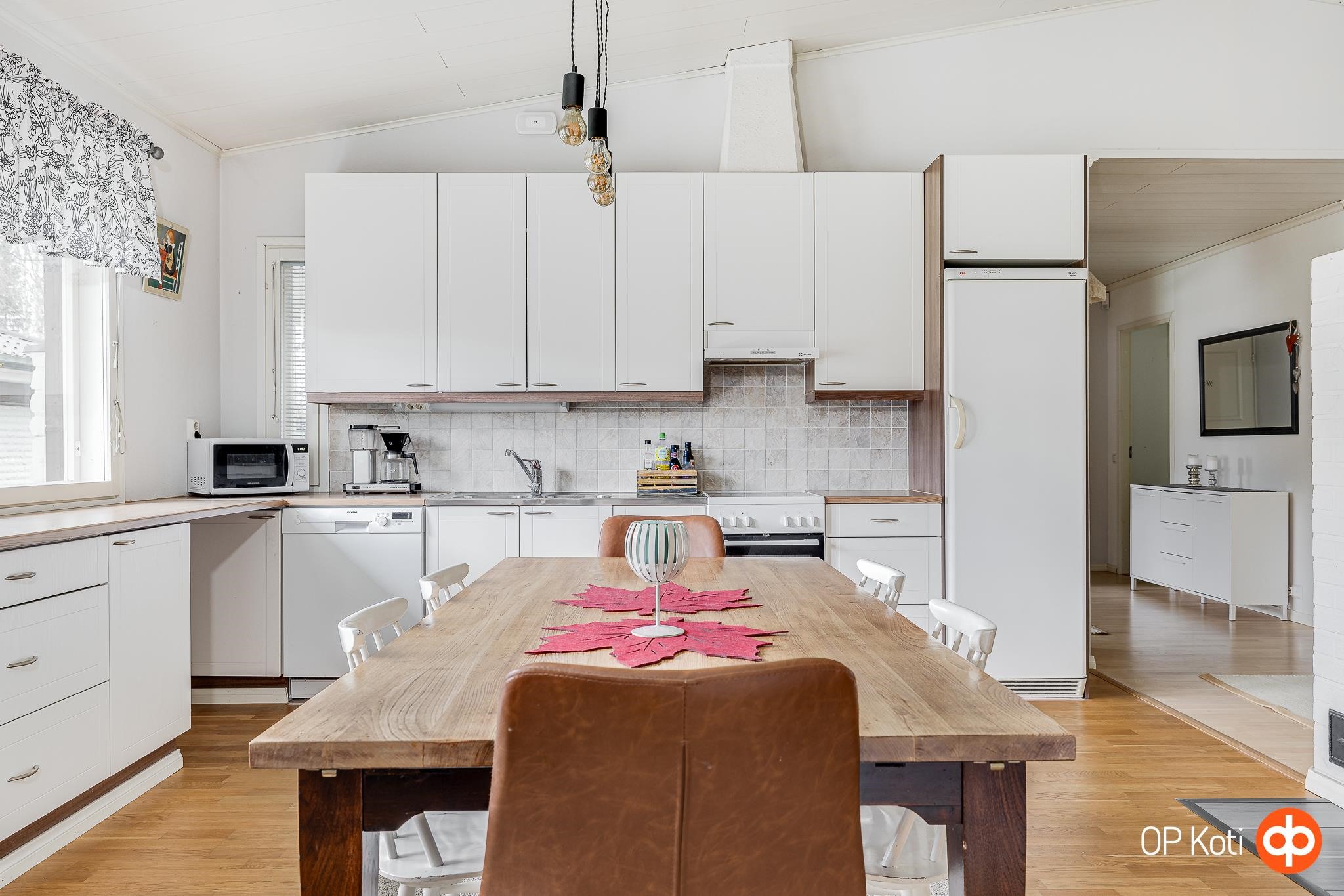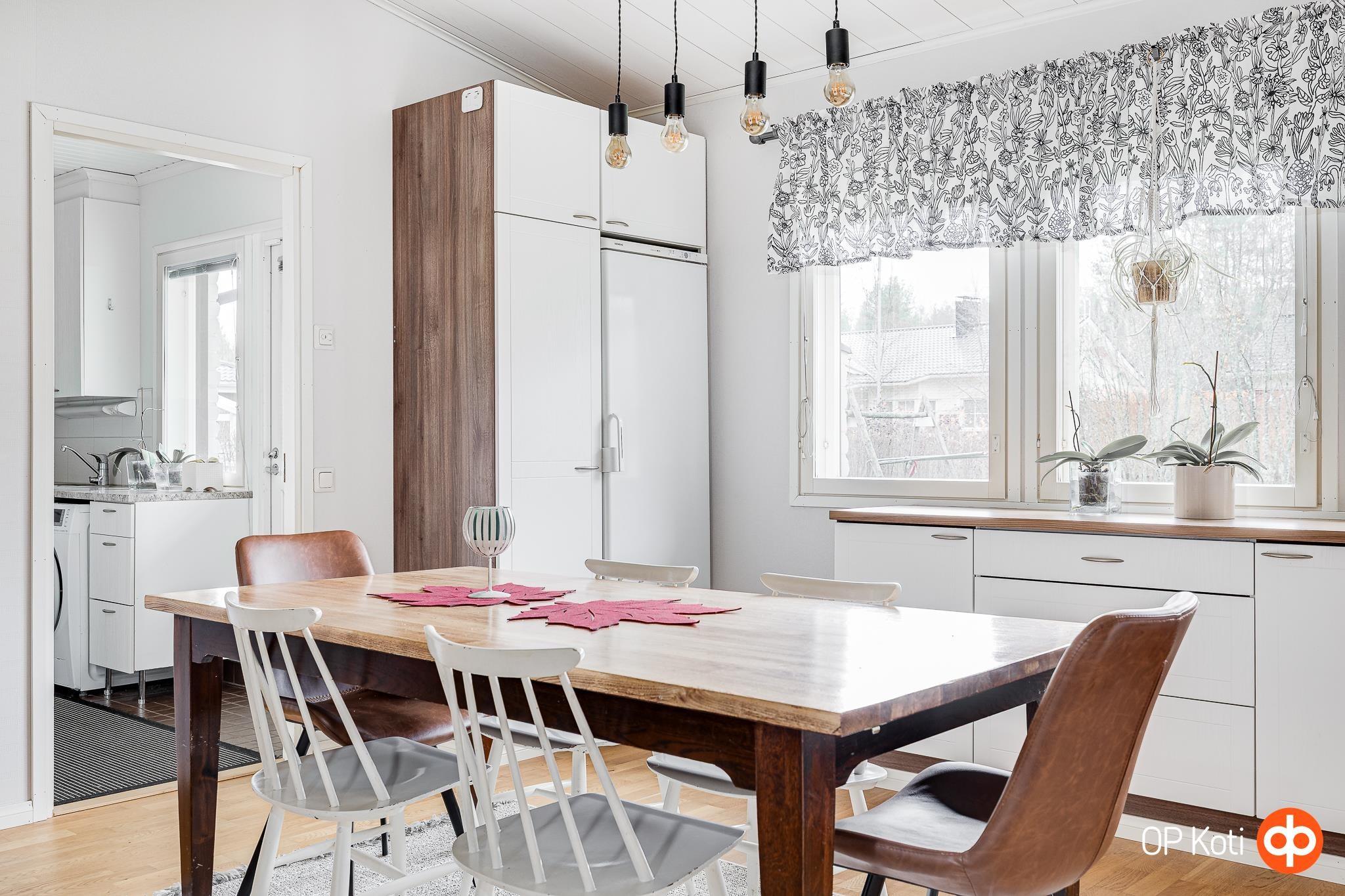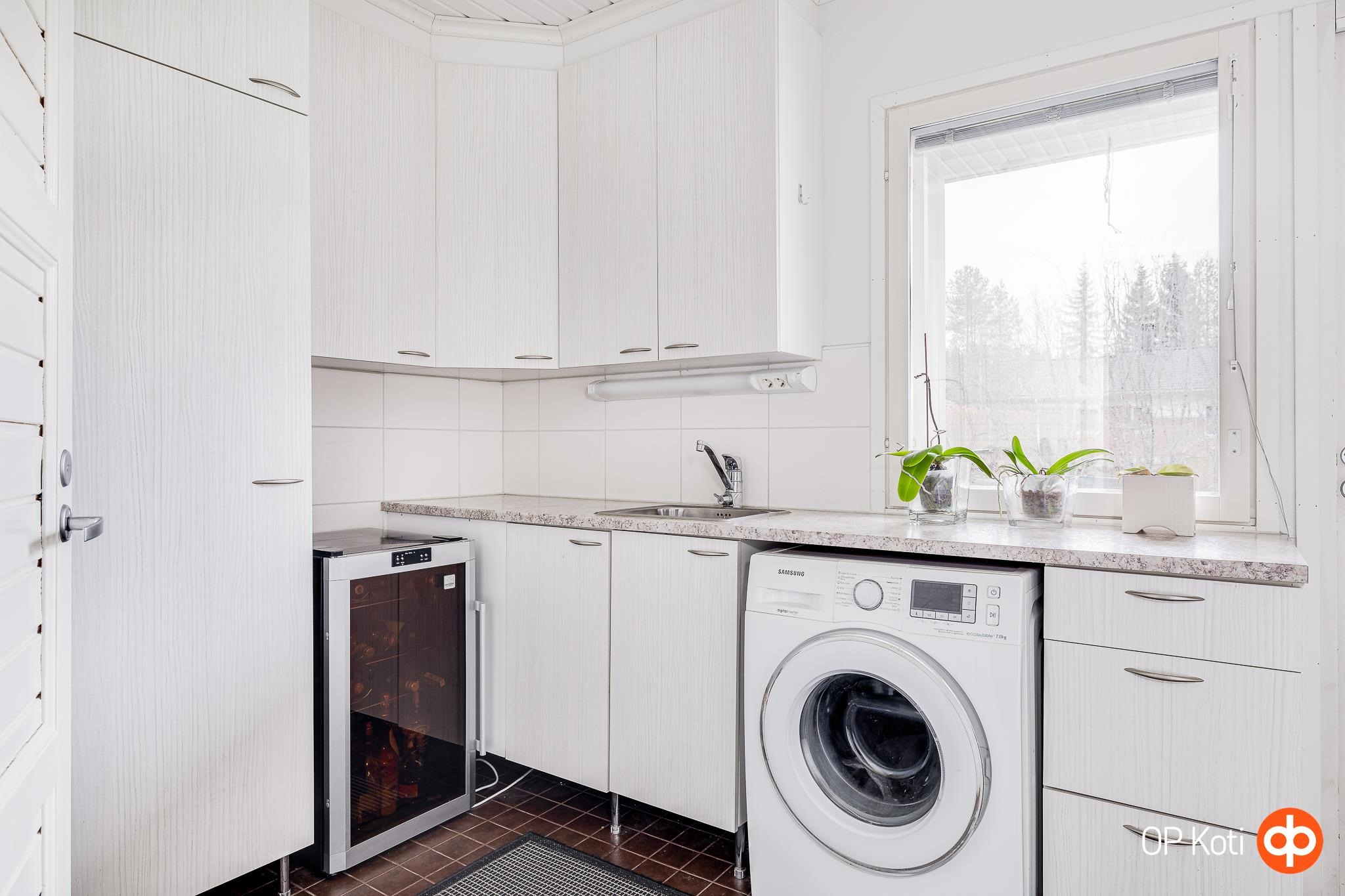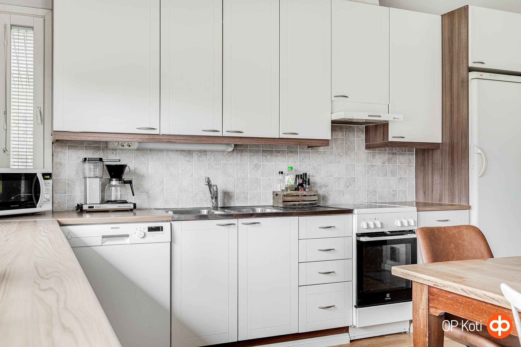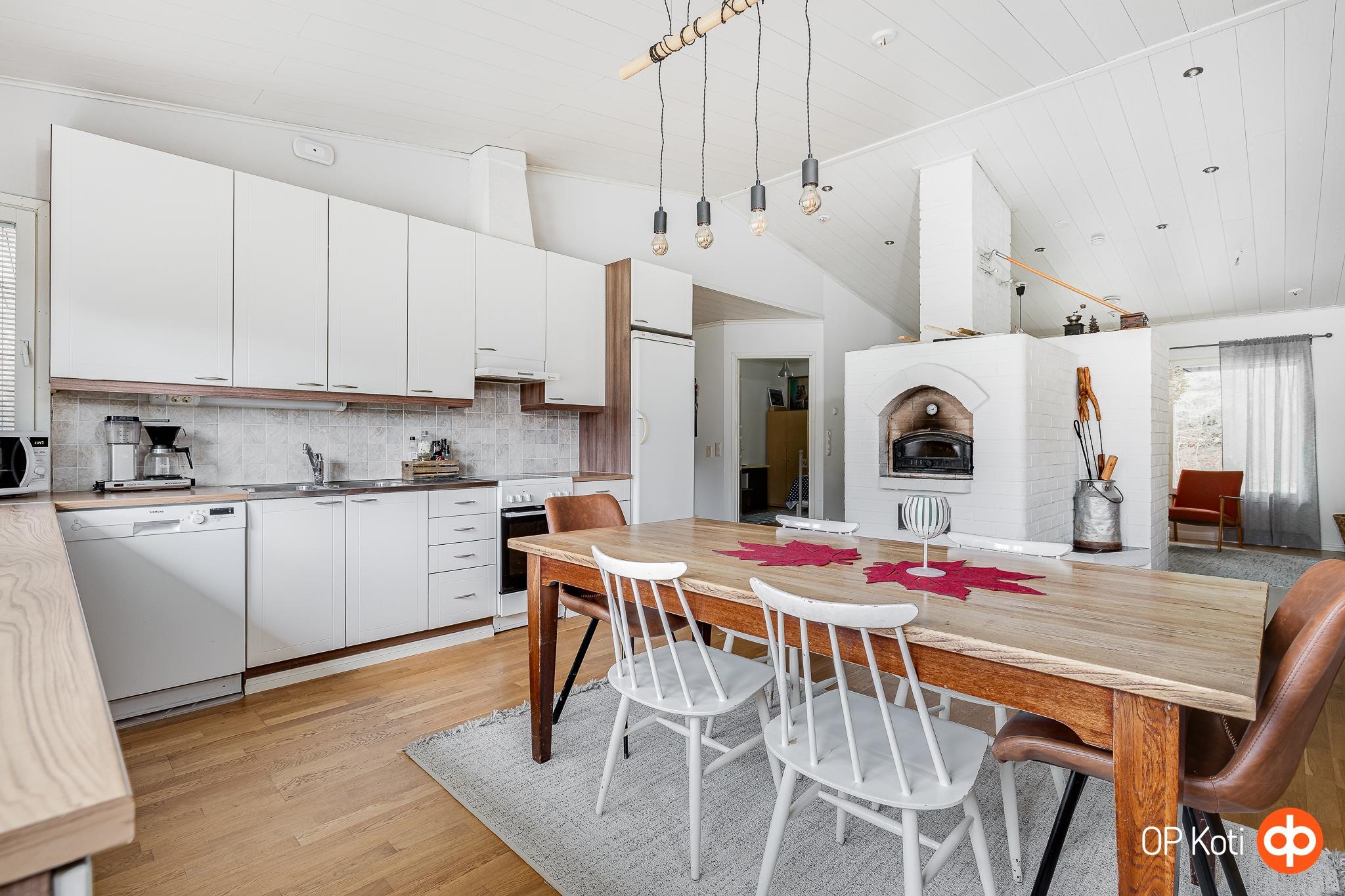 - Jääkaappi, pakastekaappi, erillisuuni kiertoilmauuni, induktioliesi, liesituuletin, leivinuuni, mikroaaltouuni, astianpesukone, kaapistot, kiinteät valaisimet, pöytätasojen materiaali laminaatti.
