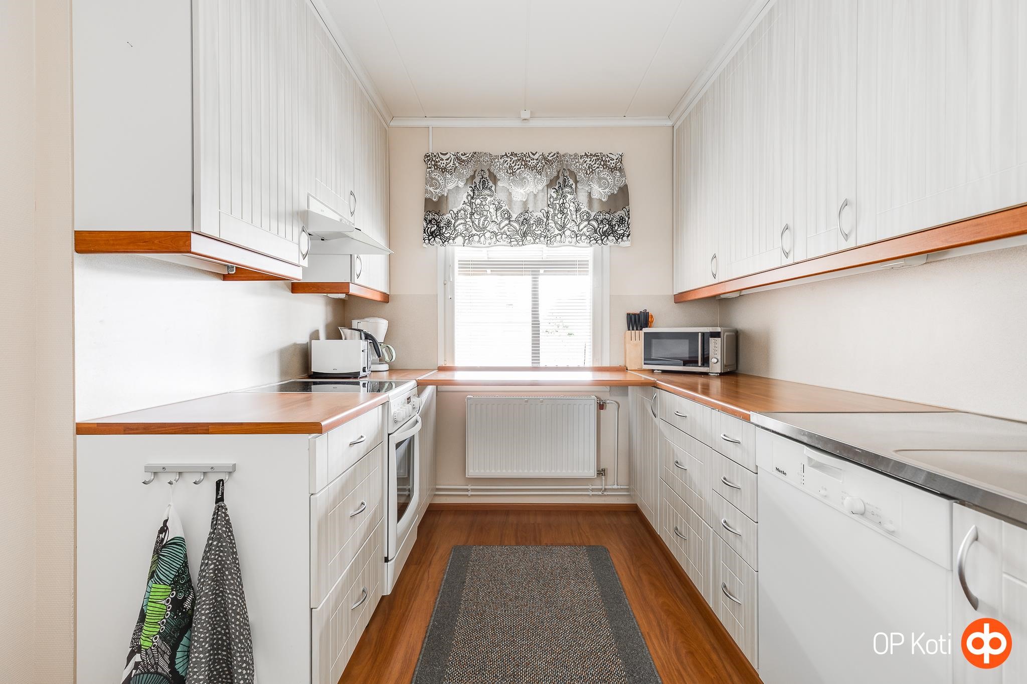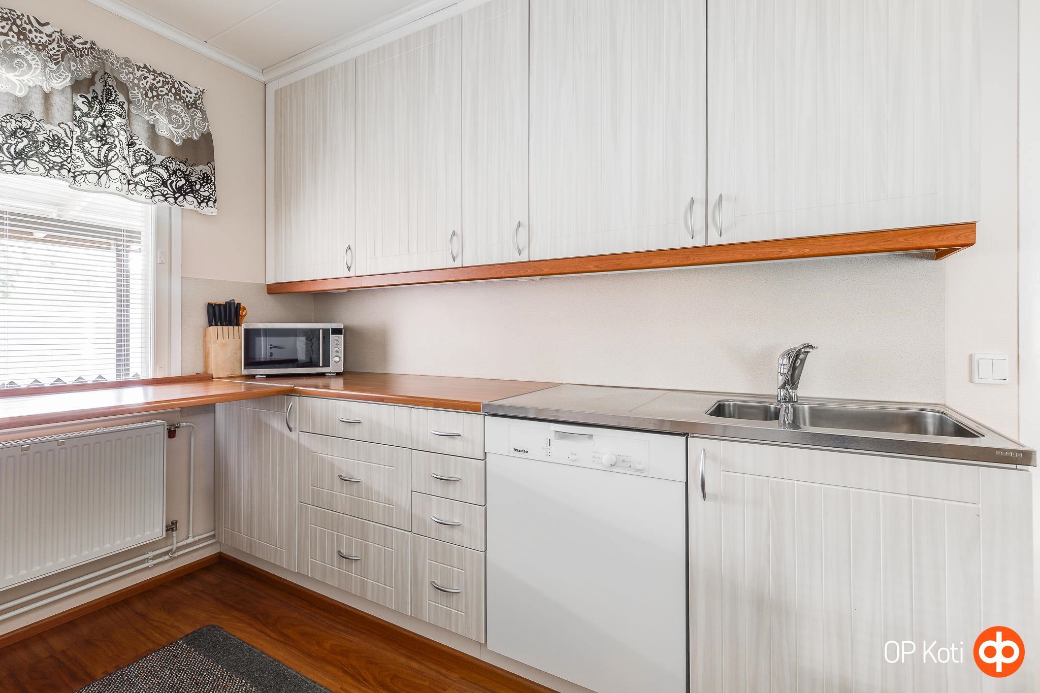 - Jääkaappipakastin, keraaminen liesi, liesituuletin Huippuimurilla, astianpesukone, kaapistot, kiinteät valaisimet, pöytätasojen materiaali Laminaattitasot. Kaapistot uusittu noin 2008