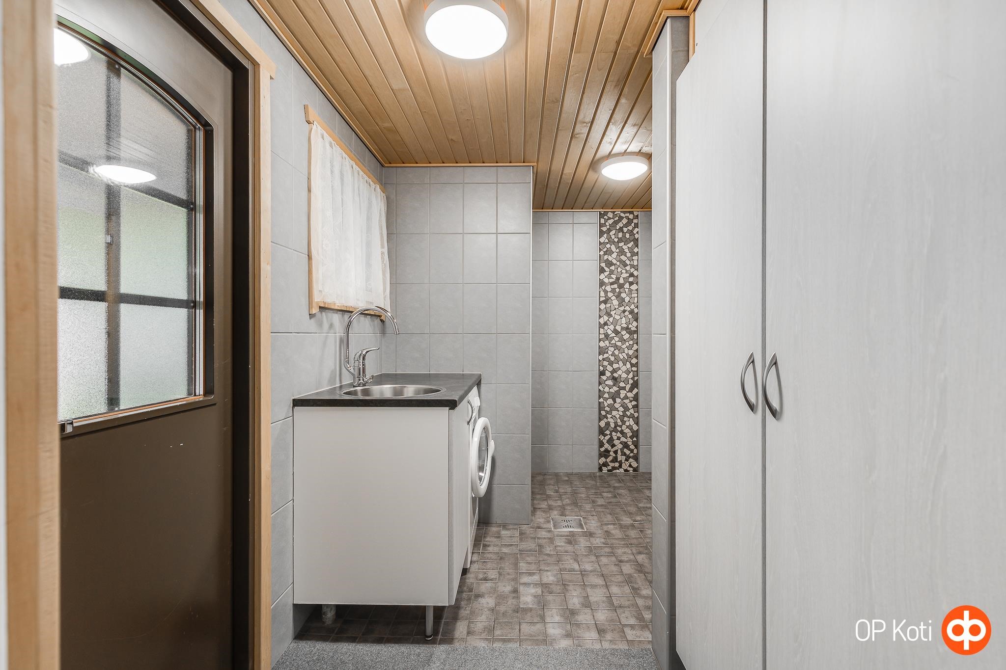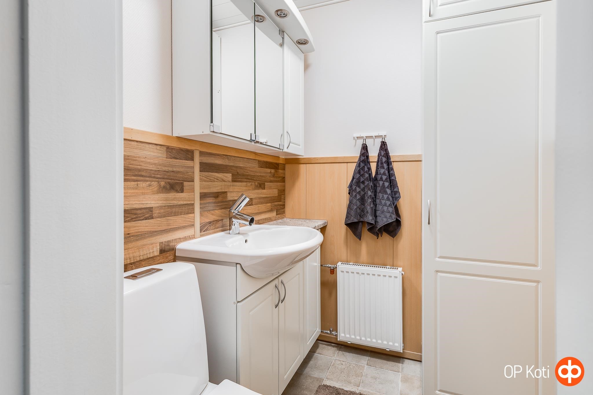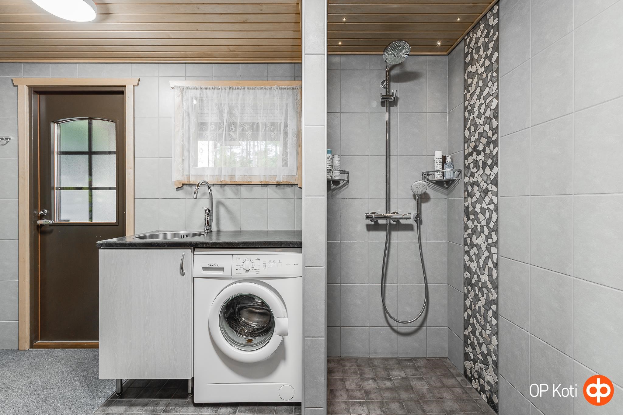 - Sauna, puukiuas, kylpyhuone, erillinen wc peilikaappi, allaskaappi, allas, wc-istuin ja kaapisto., suihku sade-suihku, suihkuseinä, kaapit, allaskaappi, pesukoneliitäntä, lattialämmitys, kiinteät valaisimet led-valaistus suihkussa. Pesuhuone/ kodinhoitohuonen ja sauna remontouitu v 2010. Lattialämmitys kph / sauna.
