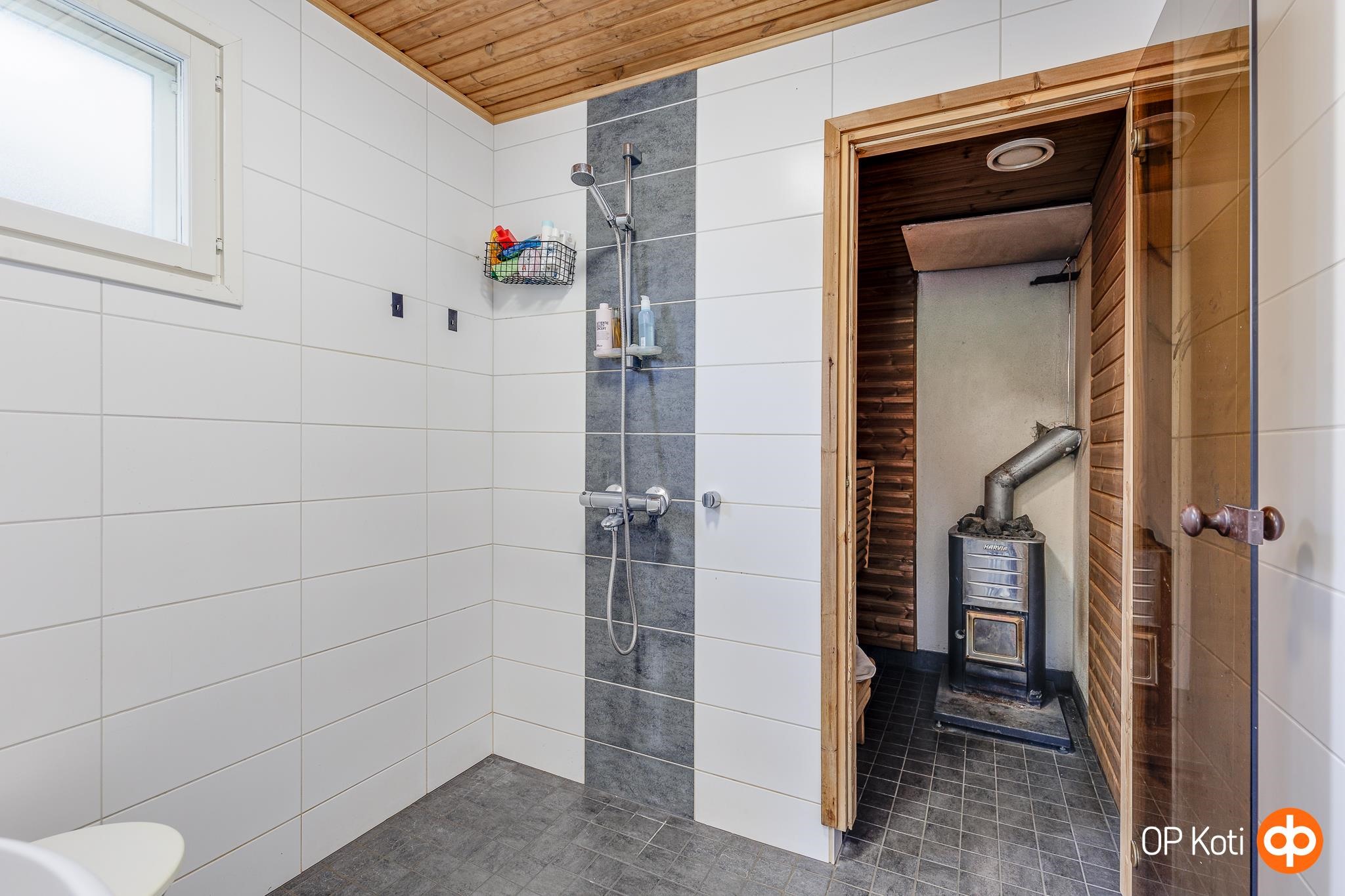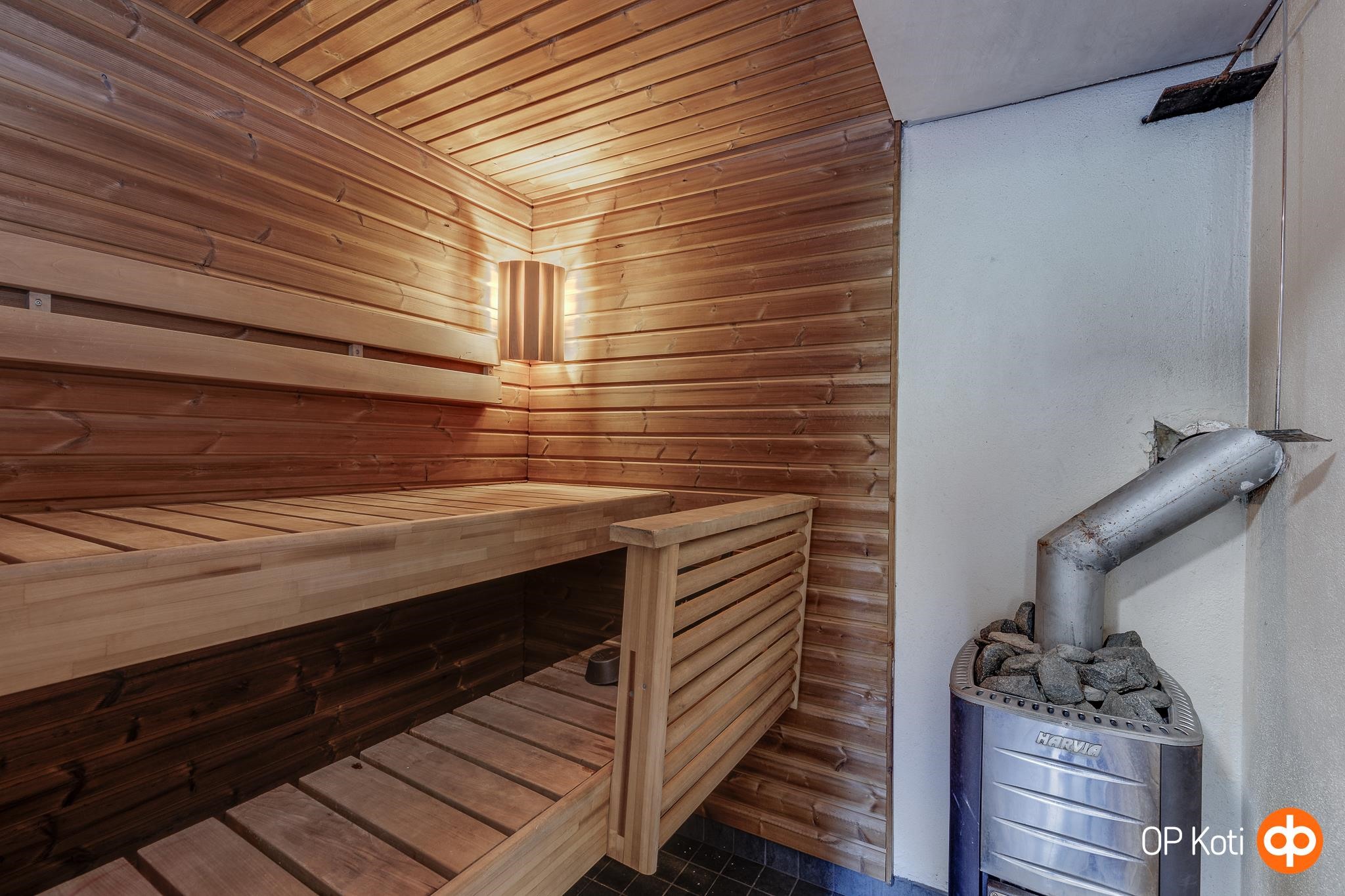 - Sauna, puukiuas, kylpyhuone, erillinen wc, suihku, peilit, peilikaappi, kaapit, allaskaappi, pesukoneliitäntä, lattialämmitys, kiinteät valaisimet.