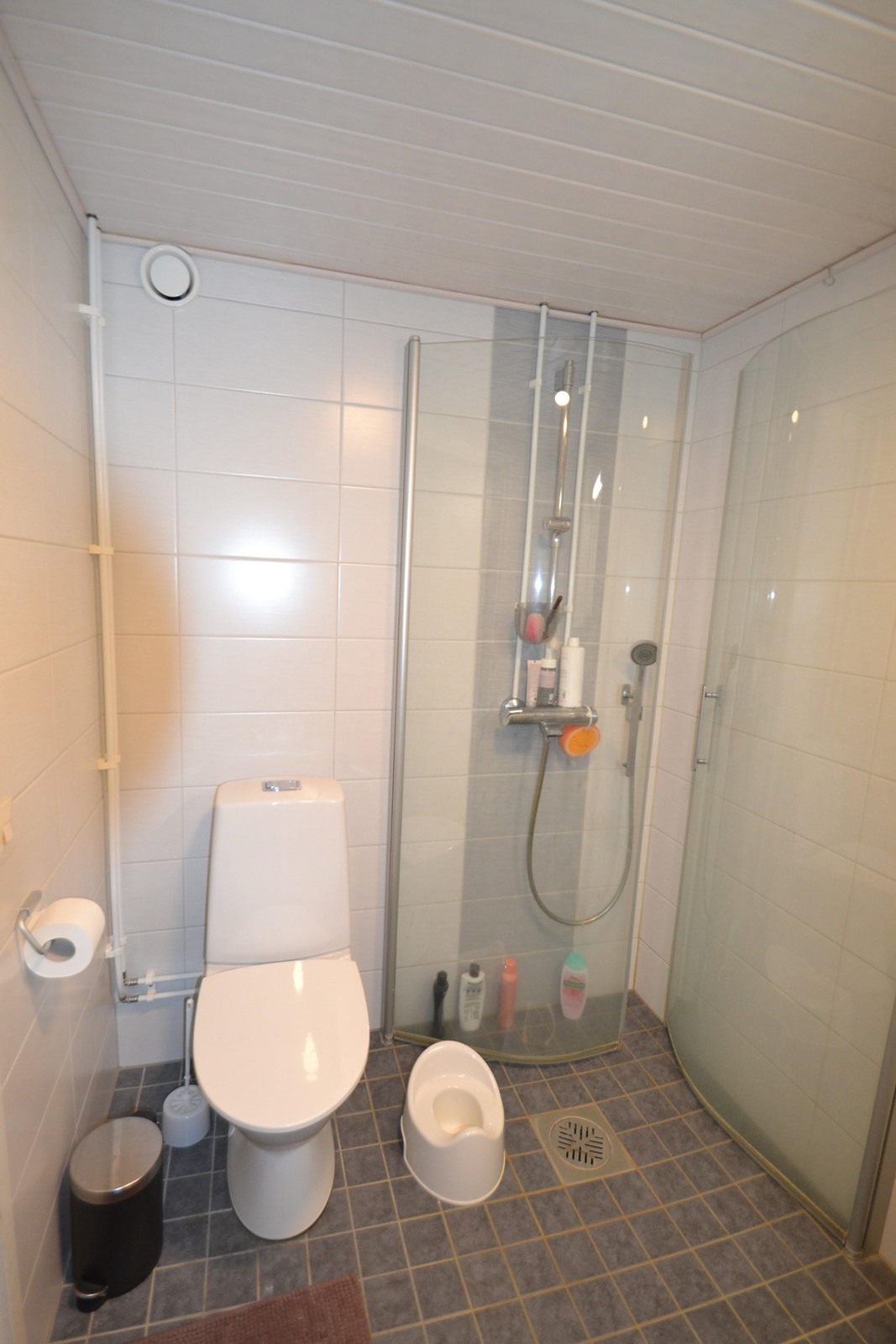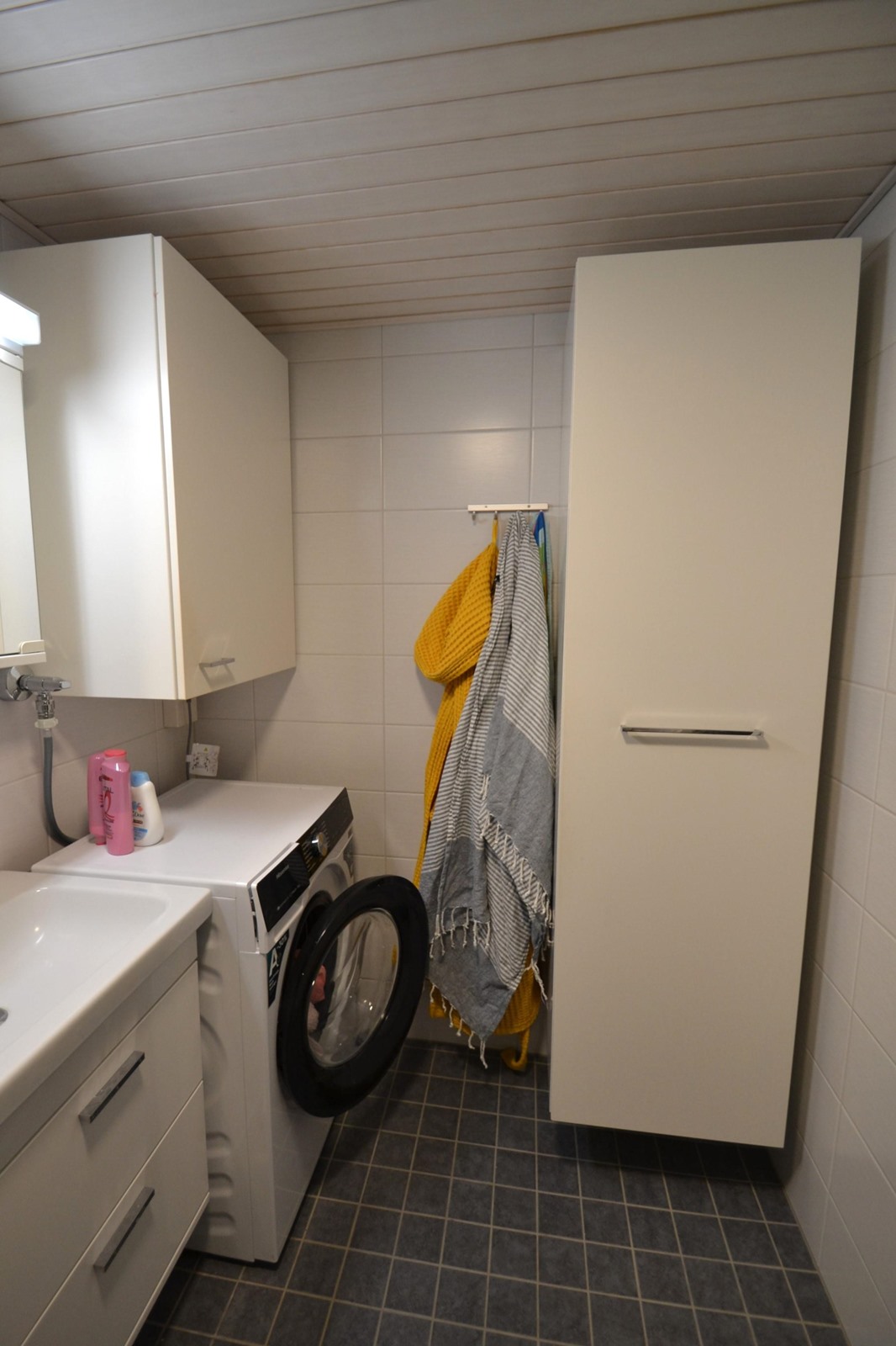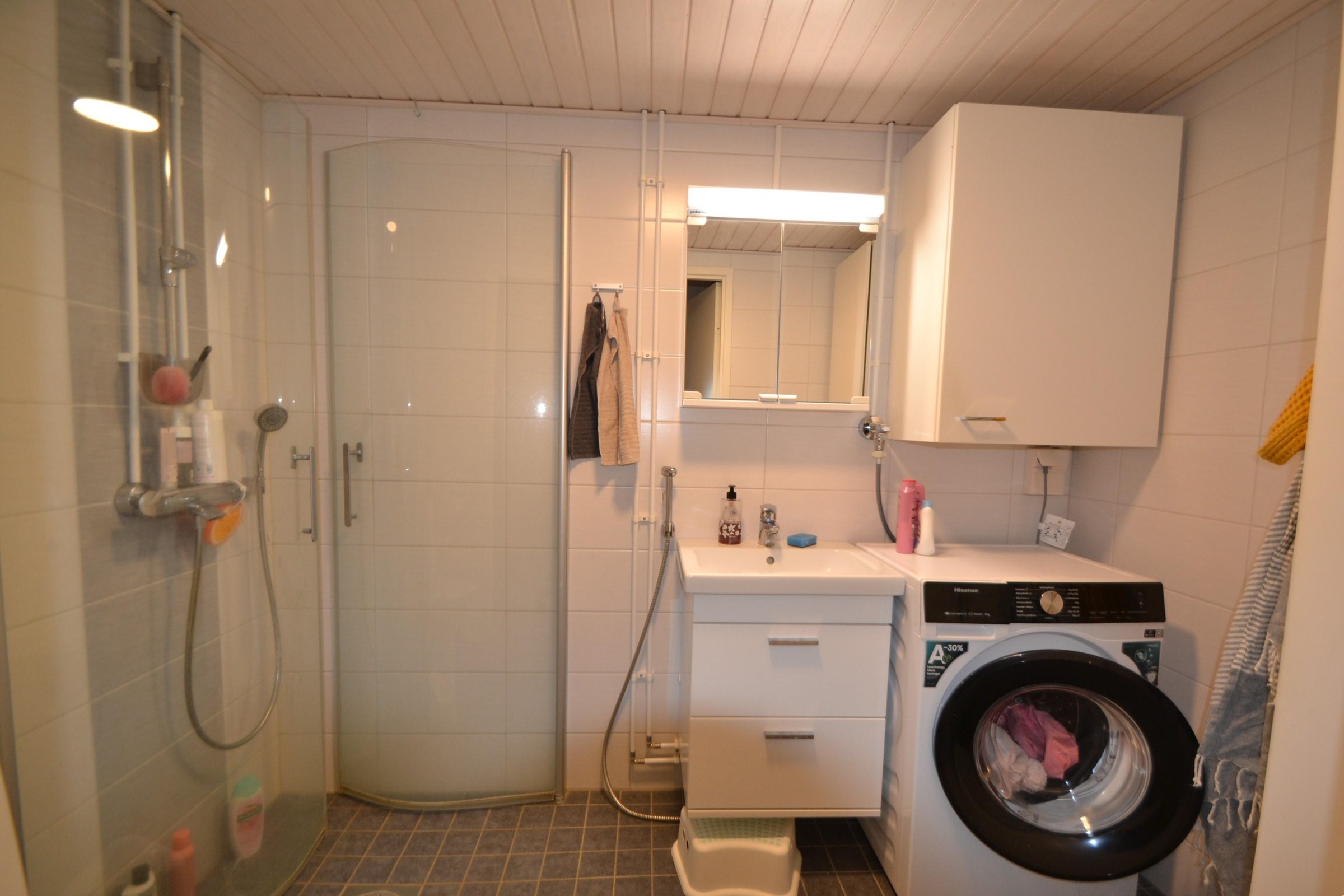 - Kylpyhuone, suihku, suihkuseinä, peilikaappi, allaskaappi, pesukoneliitäntä, kiinteät valaisimet.
