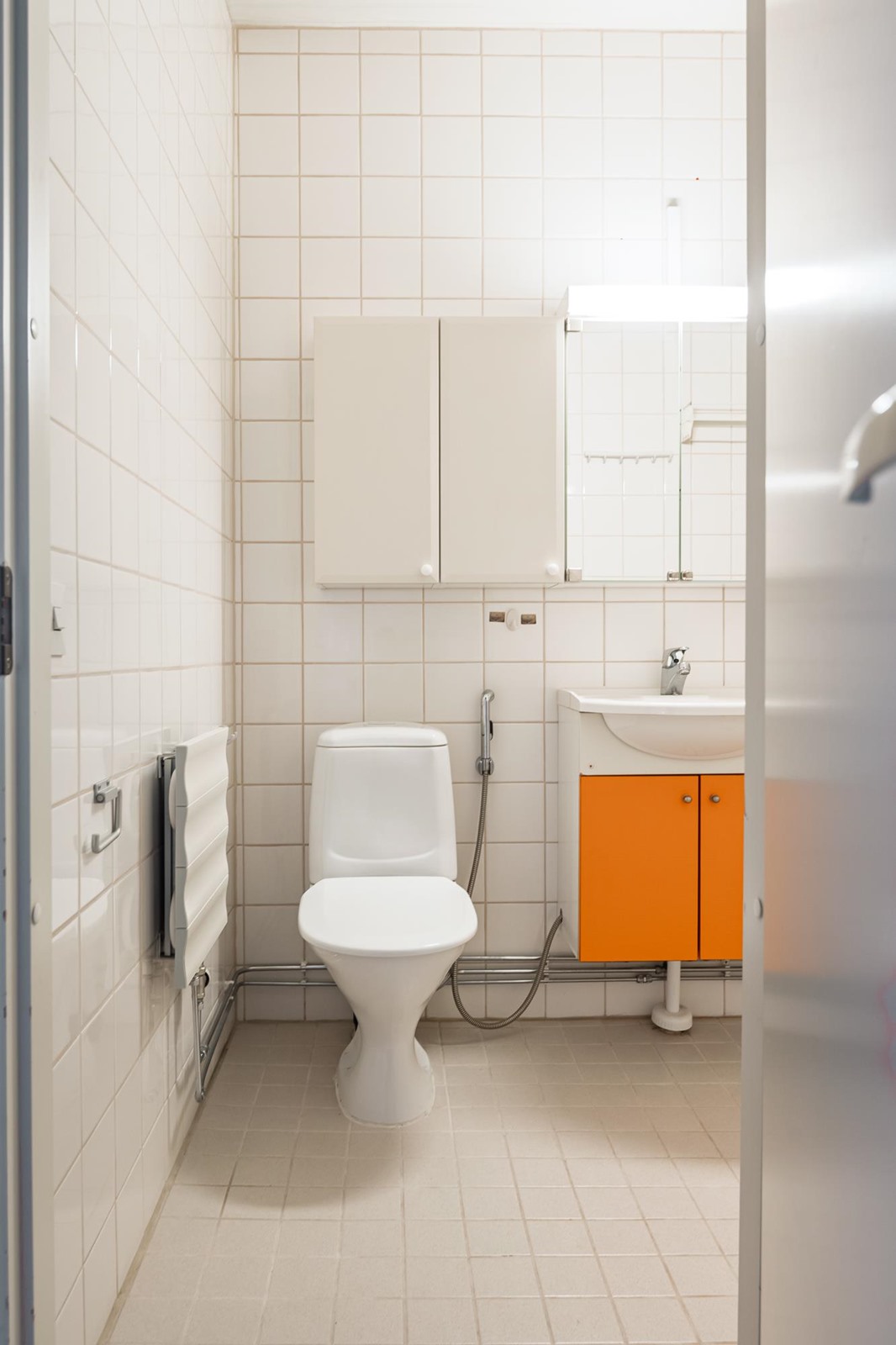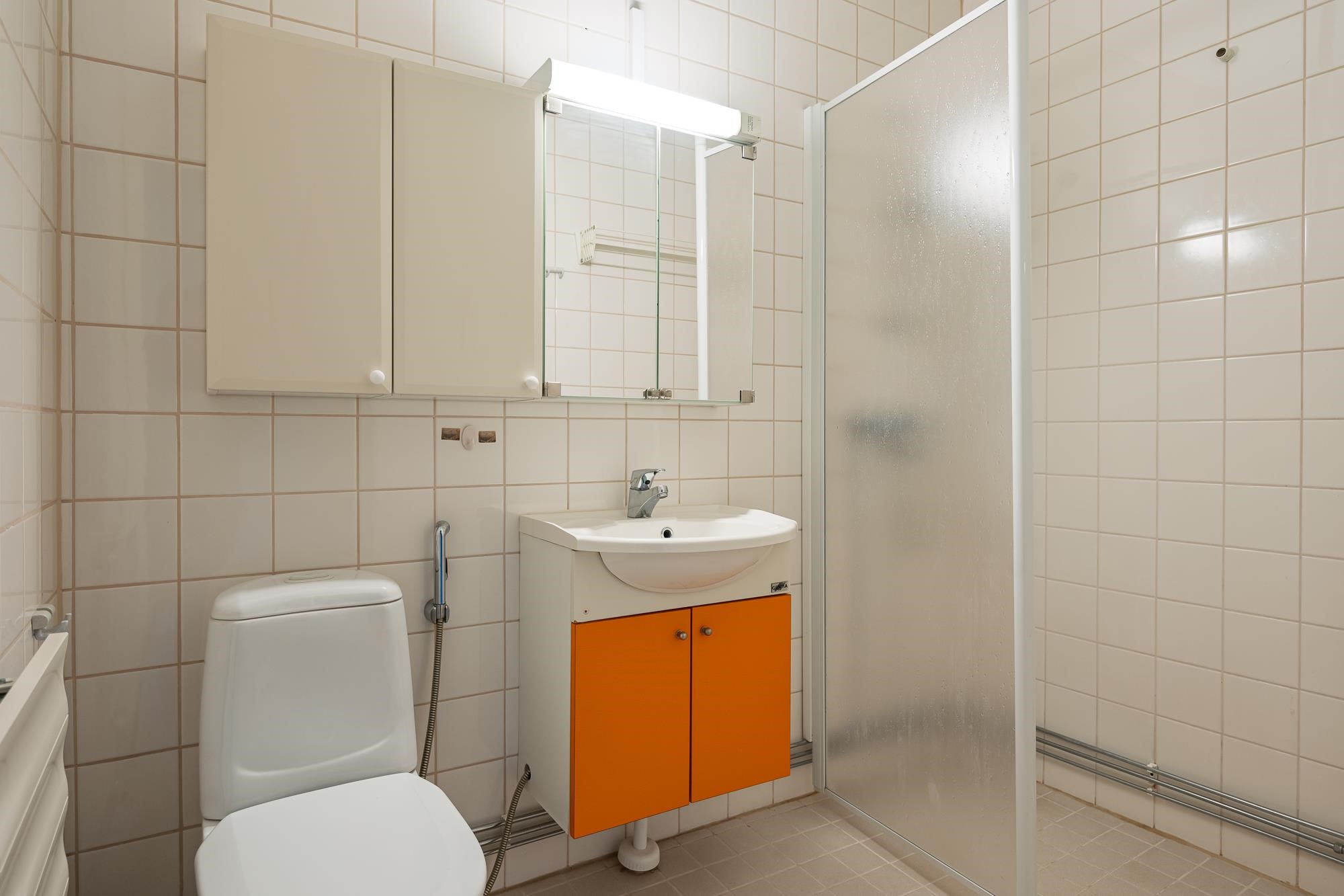 - Kylpyhuone, suihku, suihkuseinä, peilit, peilikaappi, allaskaappi, pesukoneliitäntä, kiinteät valaisimet.