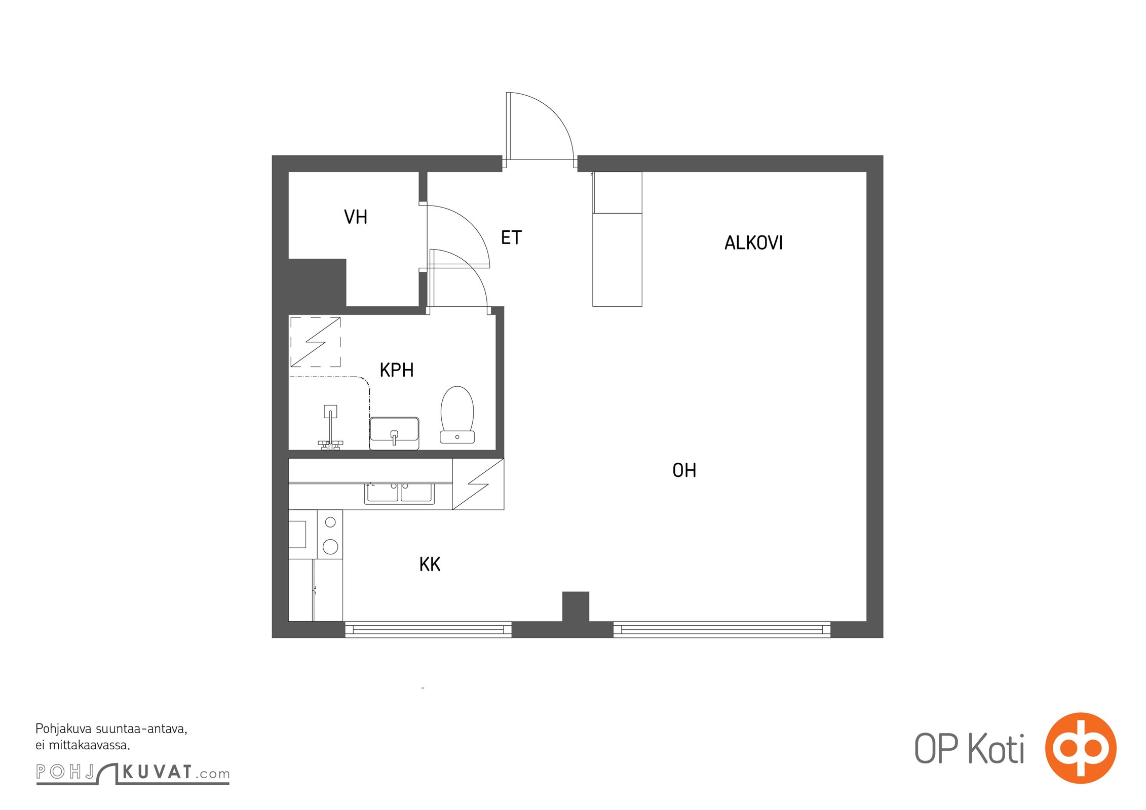 - 1h, kk, alkovi, kph, vh (yht.j. 1h + kk)