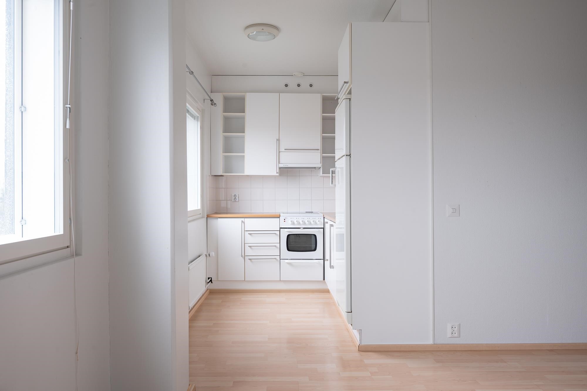 Tämä neljännen asuinkerroksen yksiökodin pohjaratkaisu sisältää kaiken tarpeellisen. Luonnonvalo tervehtii heti sisään astuttaessa. Eteisessä kiinteänä kalusteena on iso liukuovikaapisto, lisäksi tilaa on naulakolle. Asuinhuoneeseen saa mukavasti kalustettua sohvan, TV:n ja vaikka työpisteen, sillä pikkukeittiöön voi sijoittaa ruokapöydän. Makuualkovissa on nyt 120 cm levyinen vuode, jolloin paikka on myös yöpöydälle. Vuode voisi siis olla leveämpikin. Kylpyhuoneessa on tilavaraus pyykinpesukoneelle. Vaatehuone on piste i:n päälle.