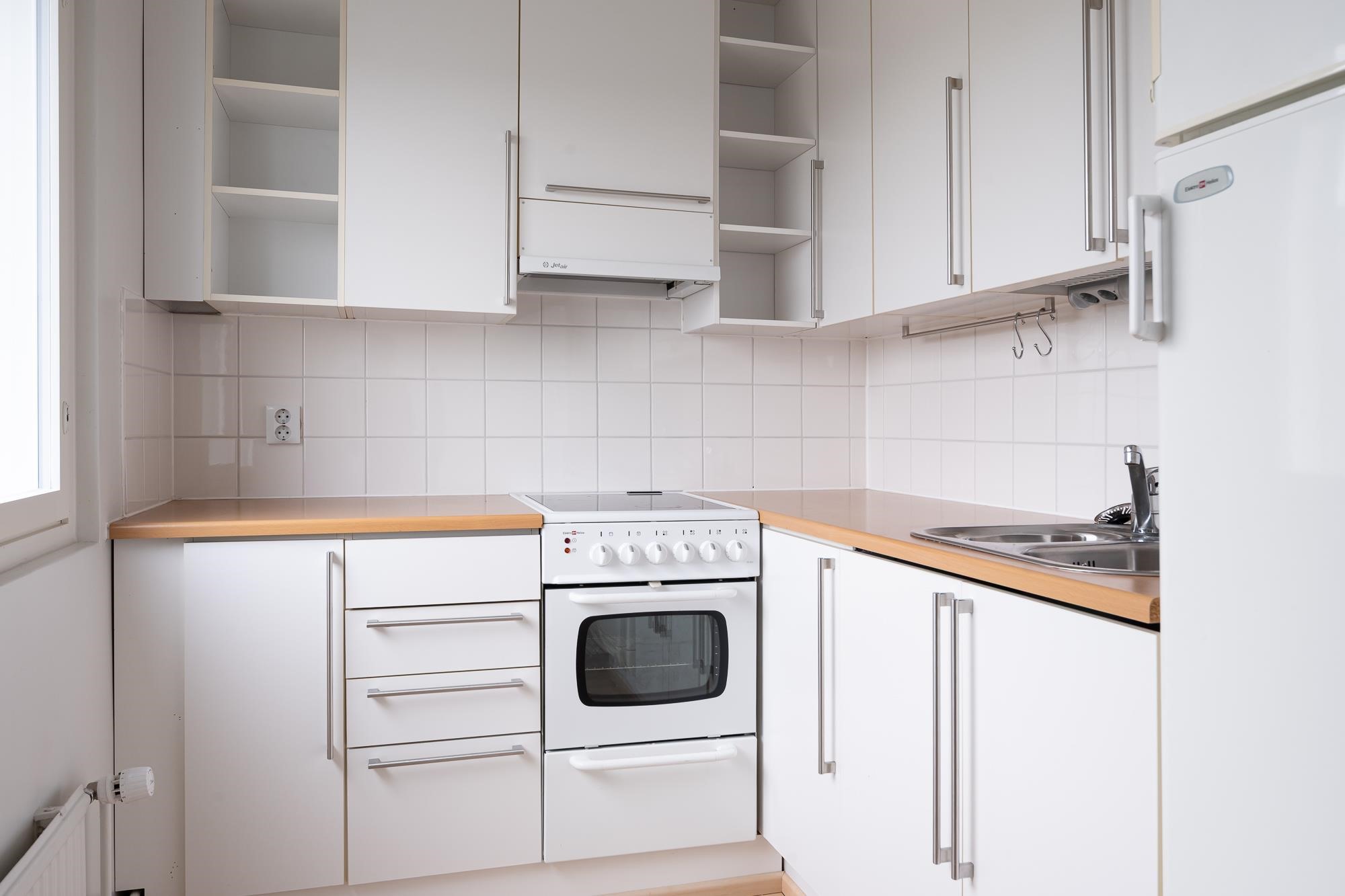 - Jääkaappipakastin, lattialiesi, liesituuletin, kaapistot, kiinteät valaisimet.