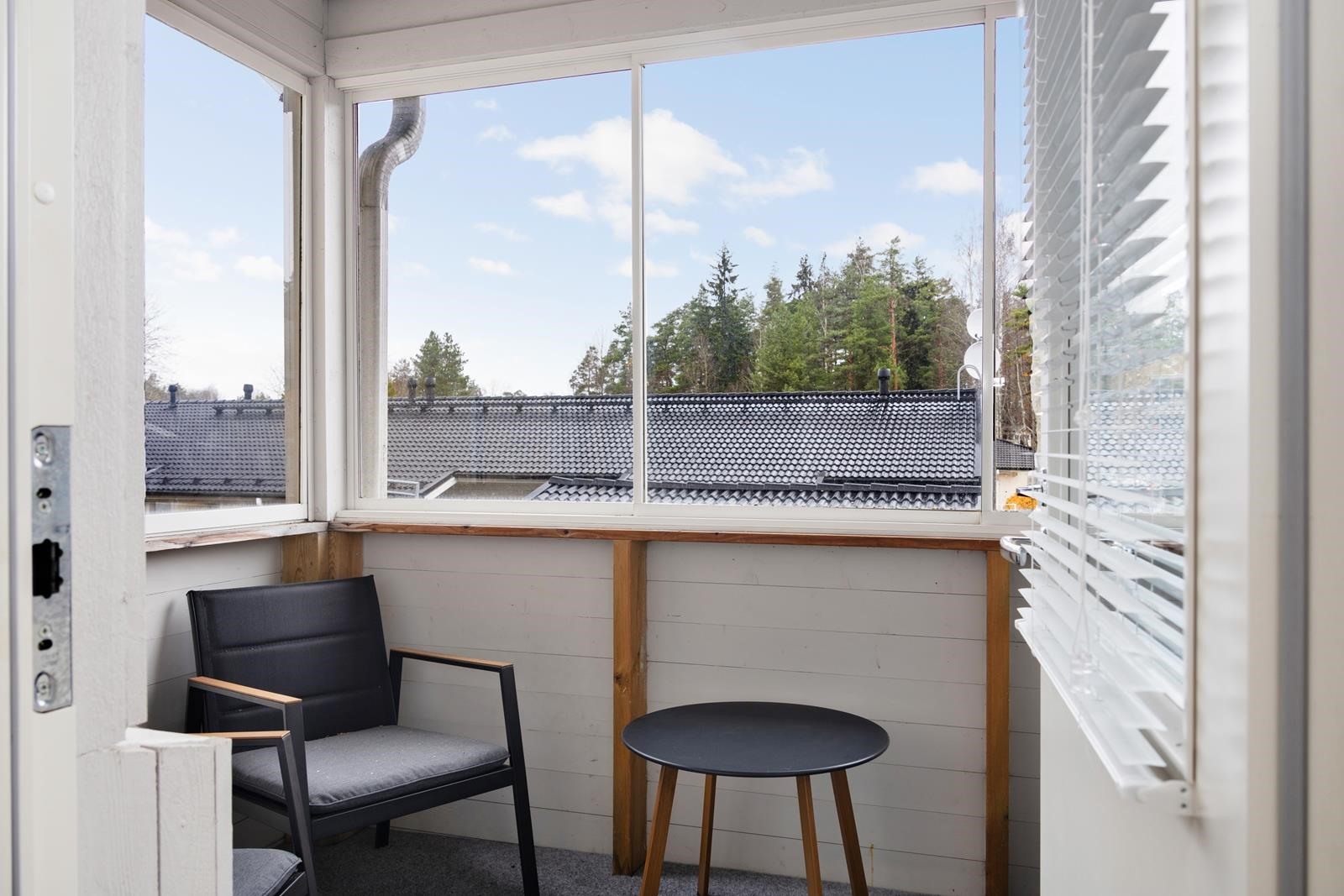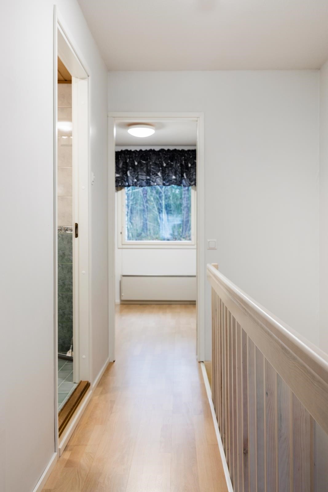 Yläkerrasta löytyvät kaksi makuuhuonetta, kylpyhuone ja lasitettu parveke. Viime vuosina asuntoa on remontoitu pala kerrallaan - lattiat on hiottu ja sävytetty, seinät maalattu ja ovet vaihdettu. Lopputulos on siisti ja ajaton.