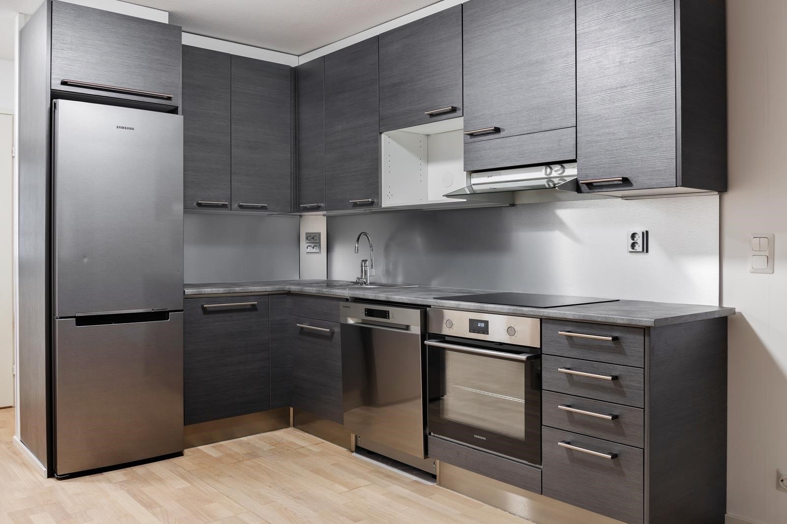 - Jääkaappipakastin, erillisuuni, induktioliesi, liesituuletin, astianpesukone, kaapistot, kiinteät valaisimet.
