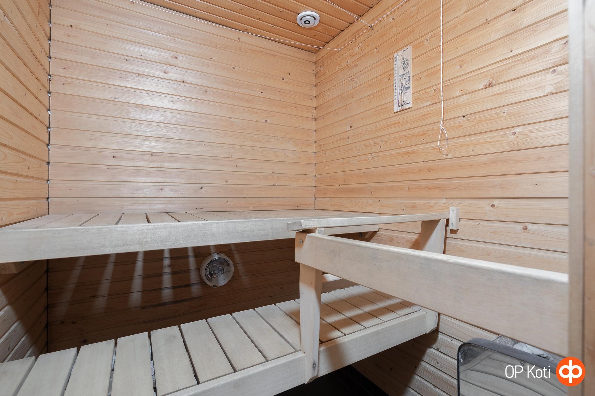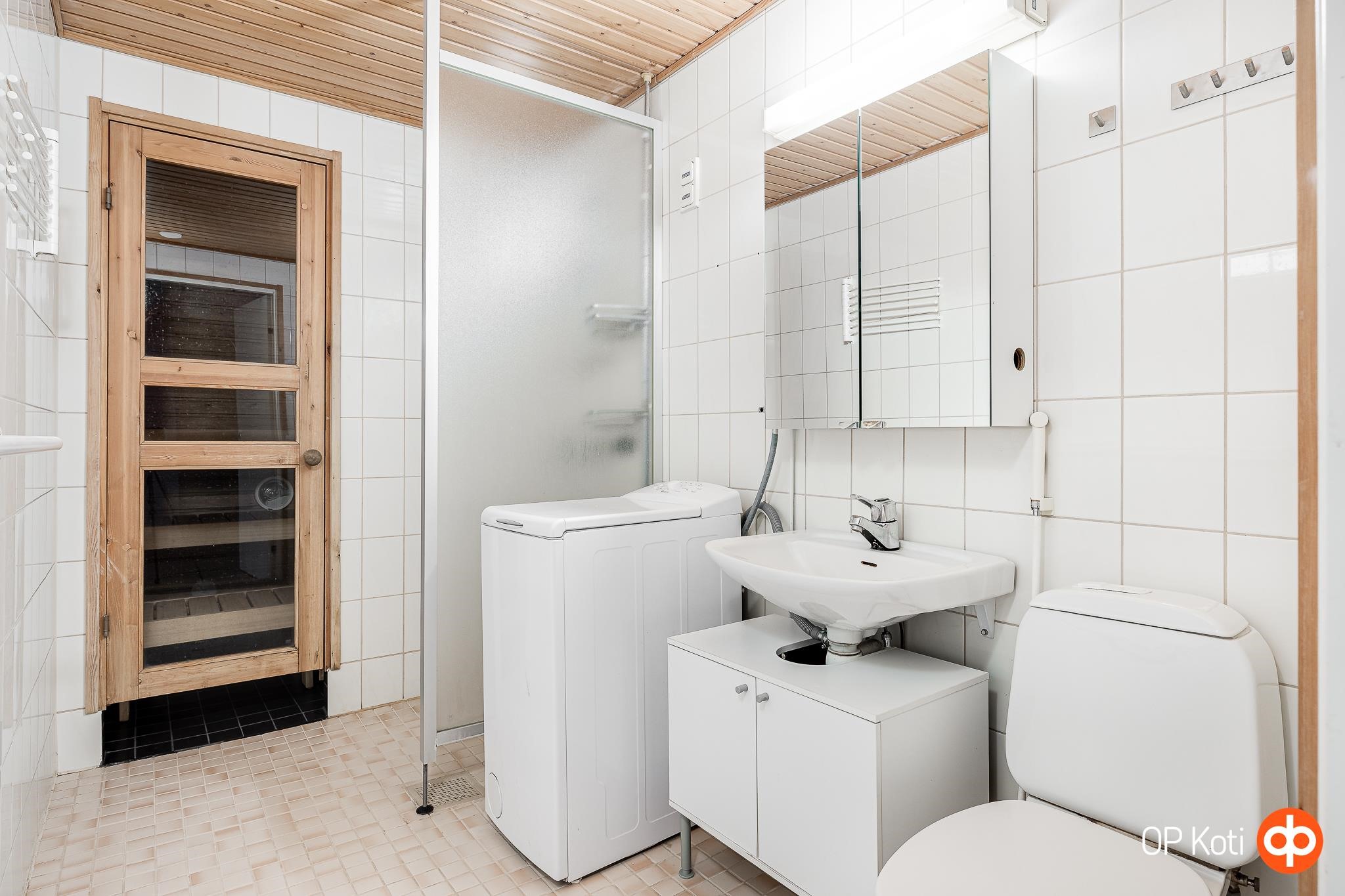 - Sauna, sähkökiuas, suihku, pesukoneliitäntä. Pyykinpesukone