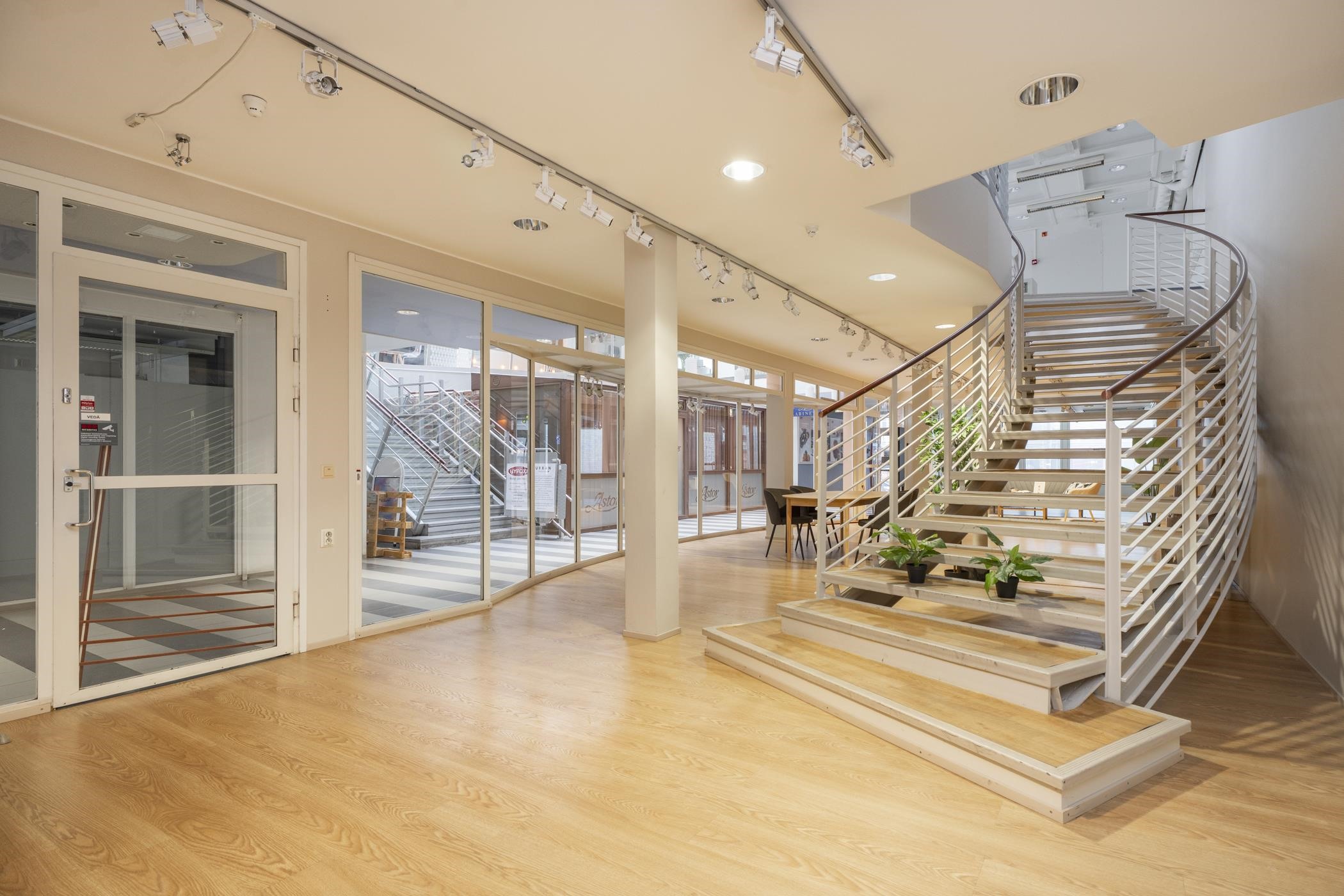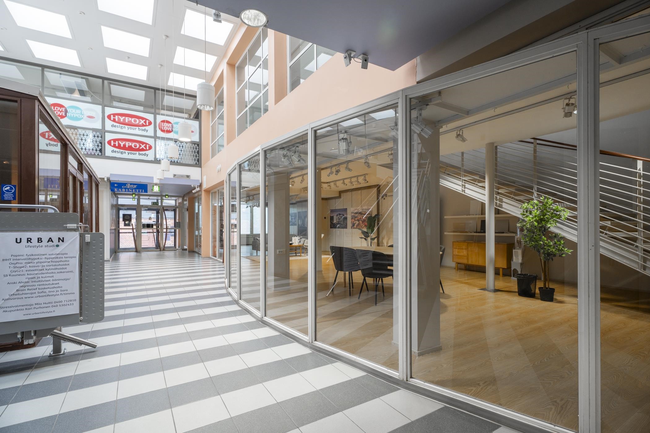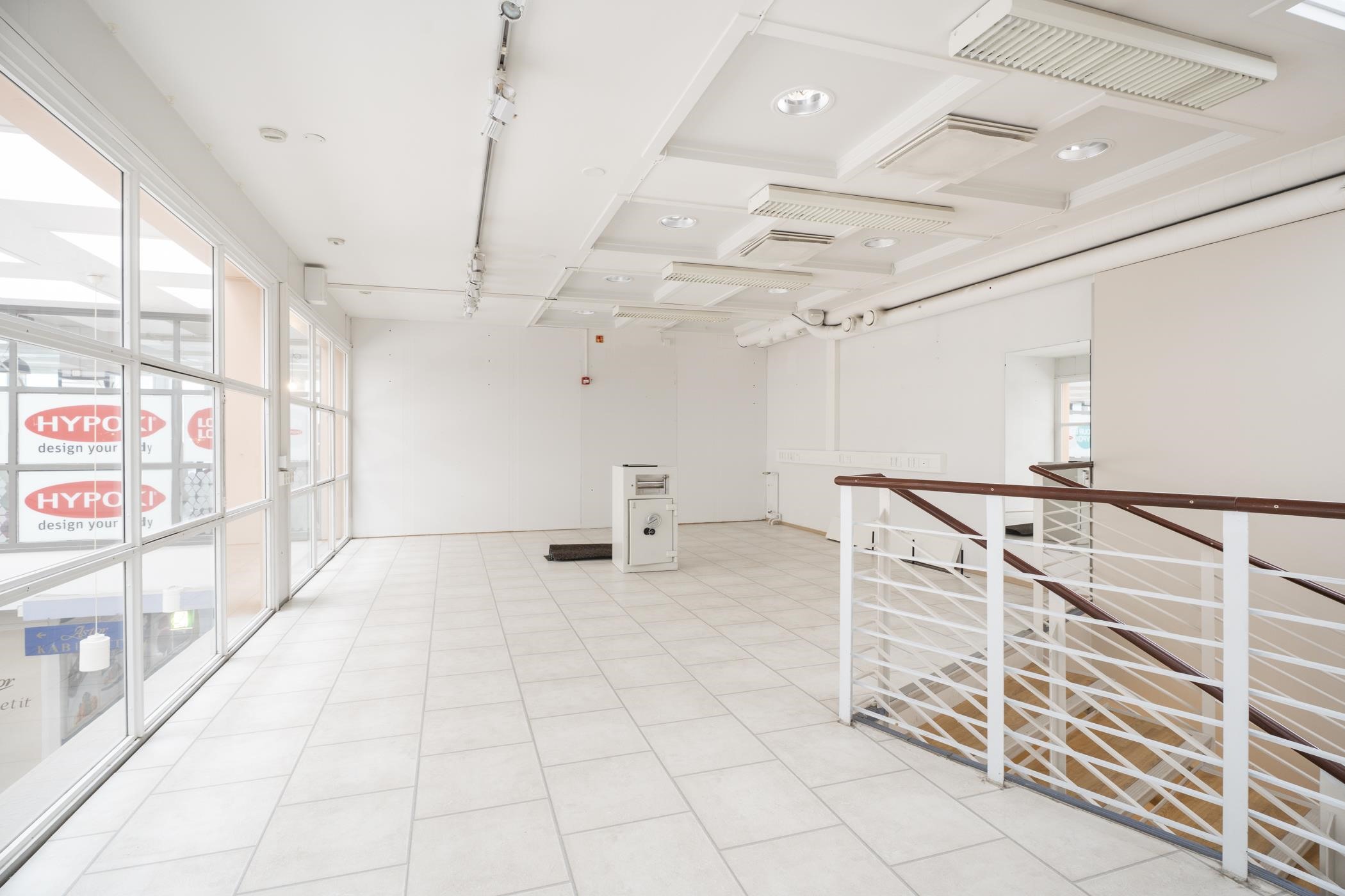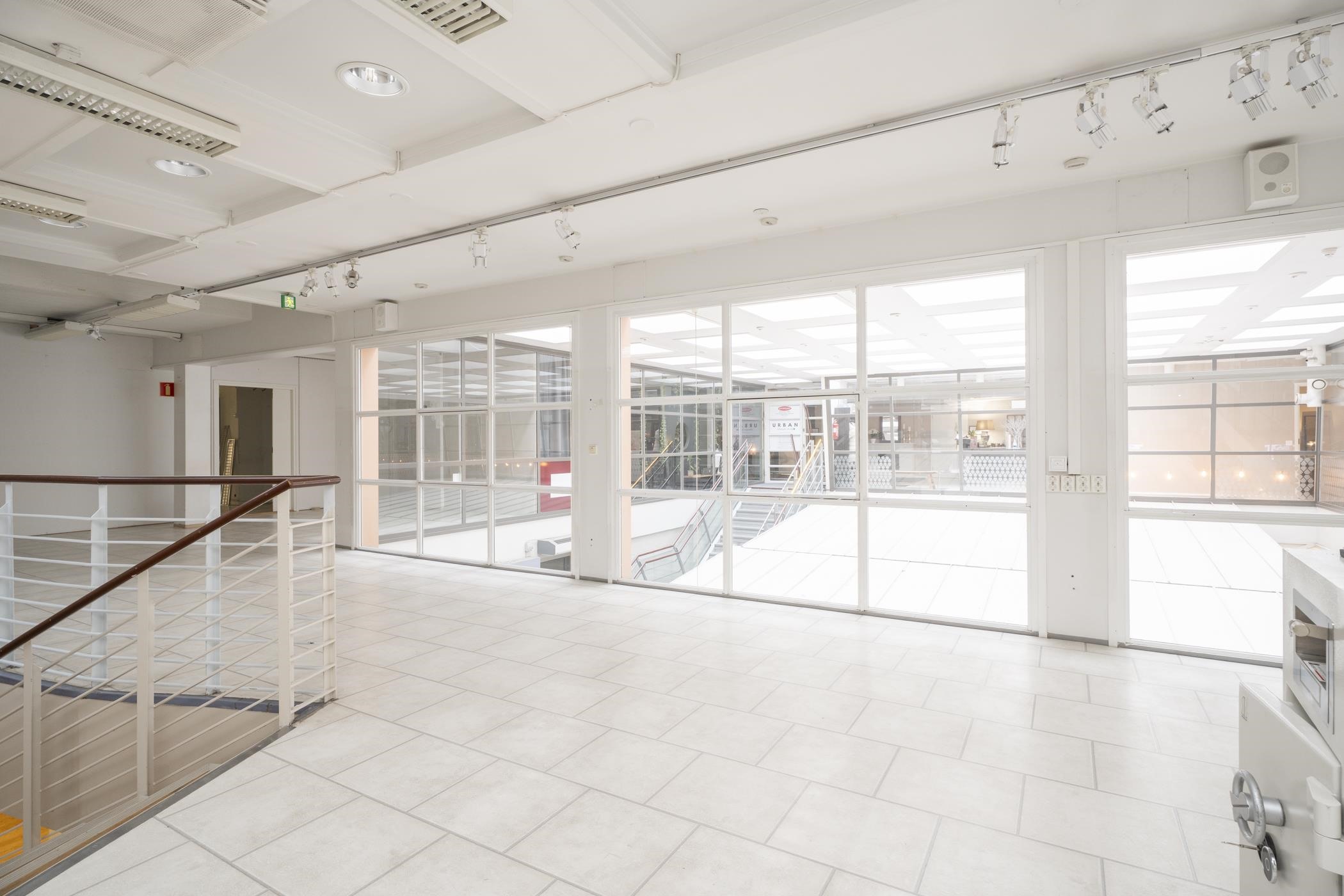 Liiketilan alakerta on avointa liiketilaa kauppakäytävän varrella, isot lasiikkunat koko käytävän mitalta. Kaarevat portaat johtavat yläkertaan jossa on yksi vessa.