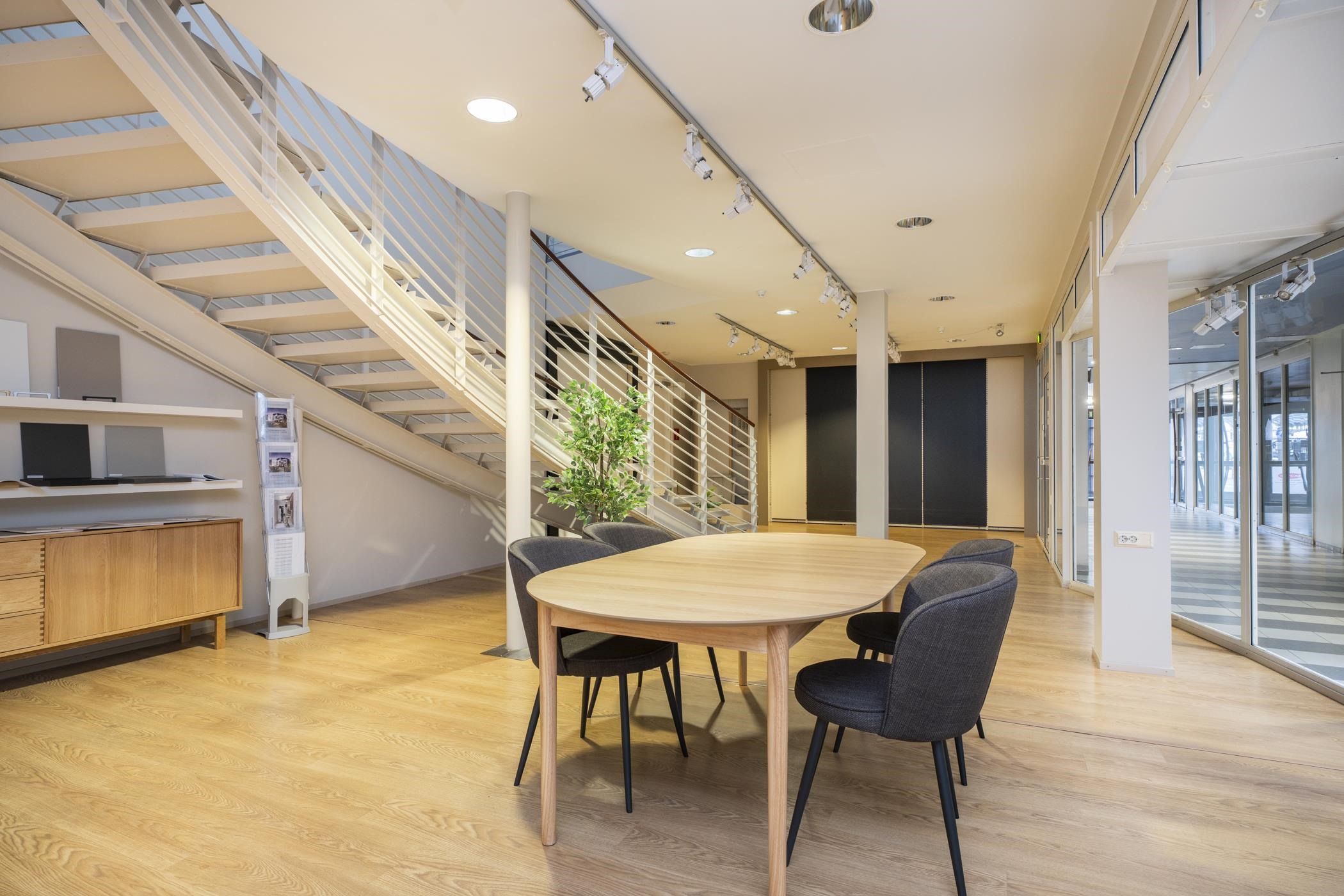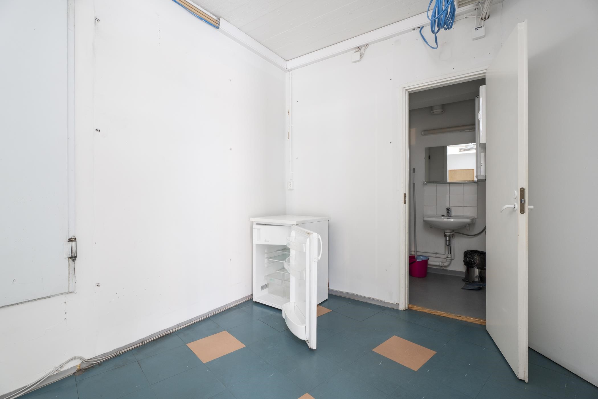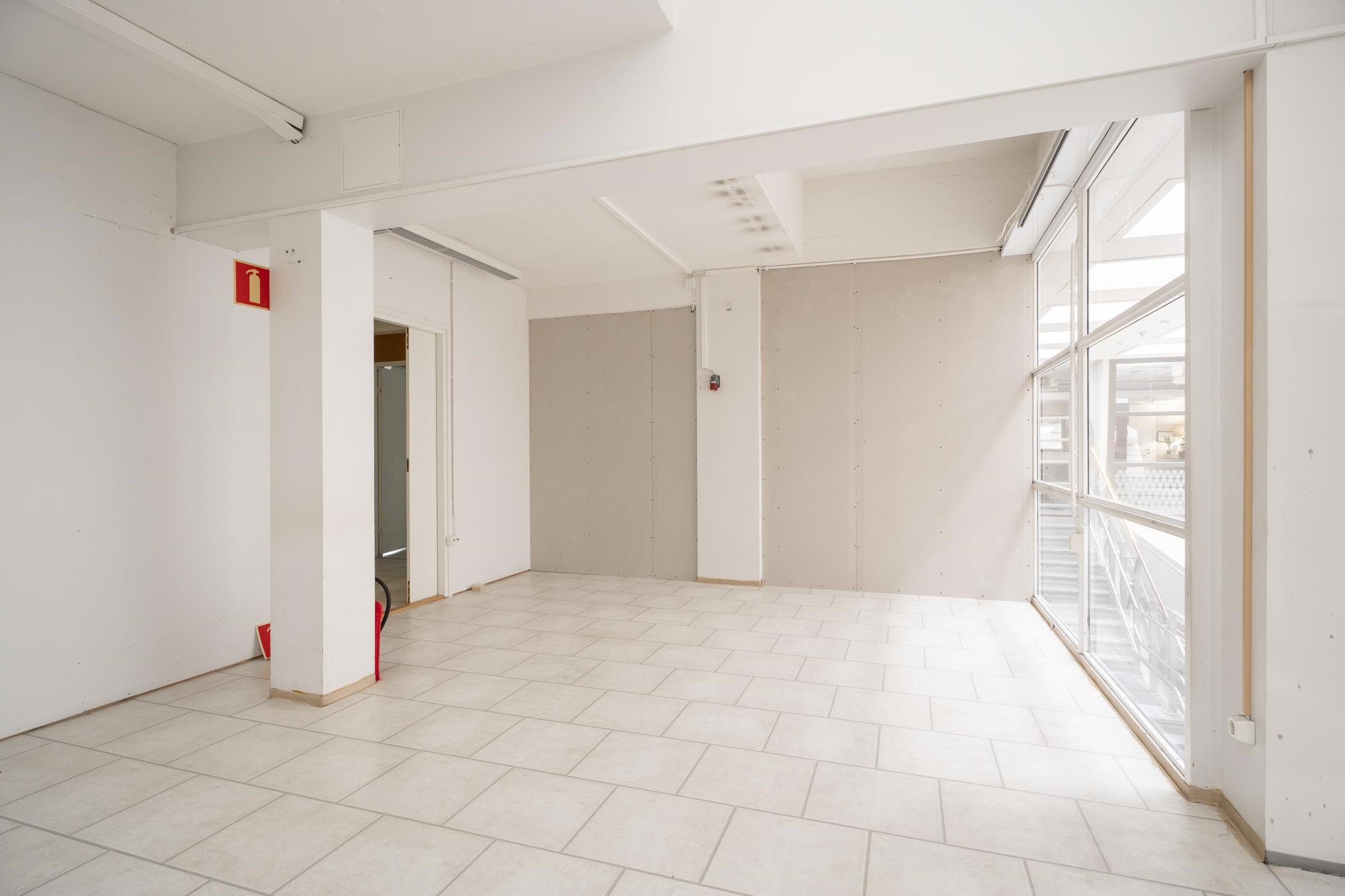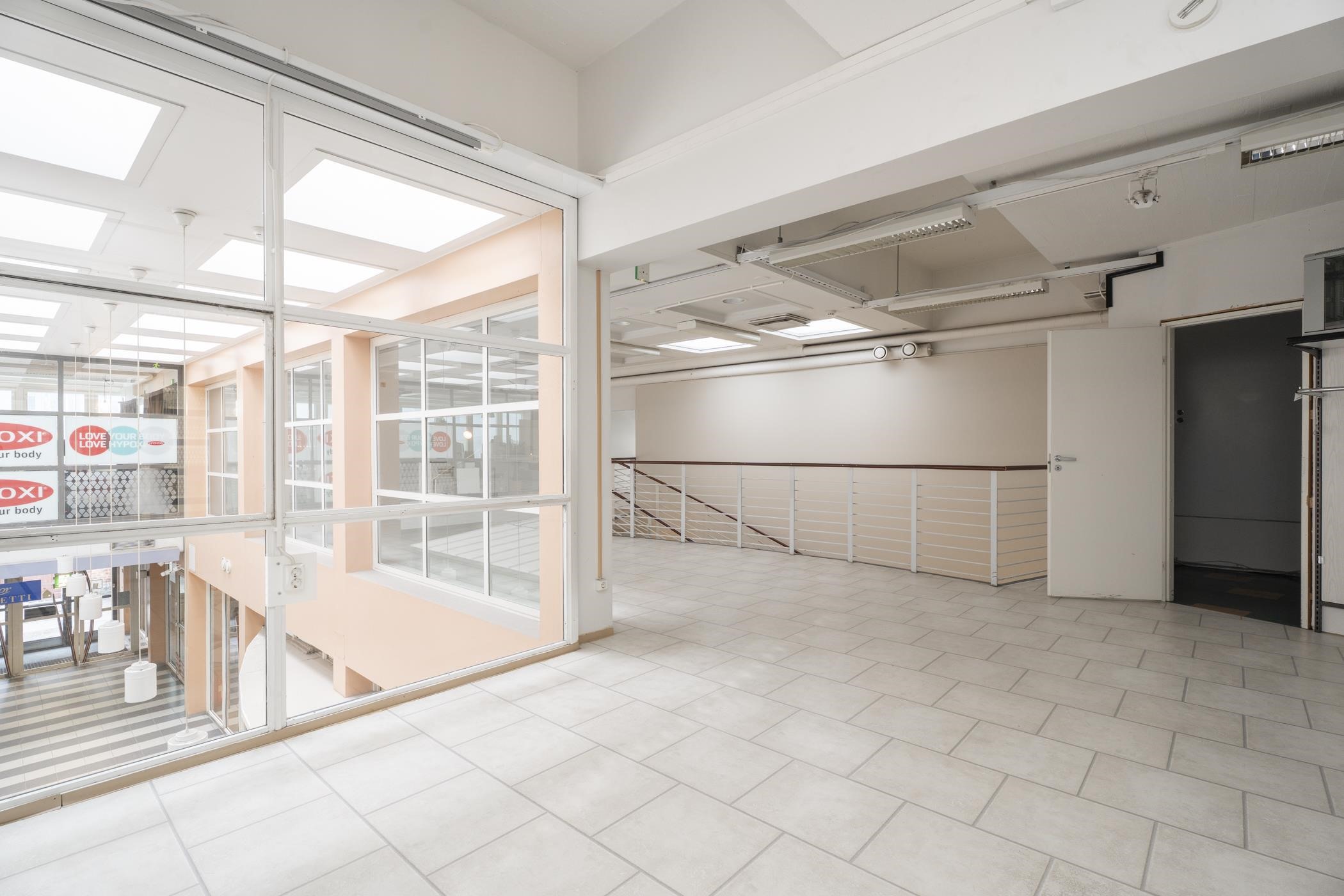 Liiketilan alakerta on avointa liiketilaa kauppakäytävän varrella, isot lasiikkunat koko käytävän mitalta. Kaarevat portaat johtavat yläkertaan jossa on yksi vessa.