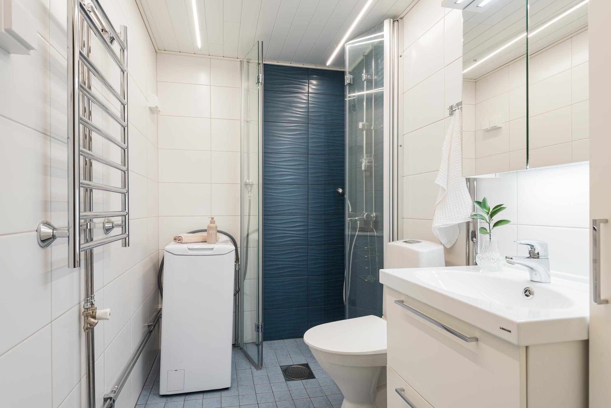- Kylpyhuoneessa suihku, peilikaappi, allaskaappi, lattialämmitys, kiinteät valaisimet, suihkutaiteovi , kaappi, pyyhekuivain. Kylpyhuone remontoitu LVI-remontin yhteydessä.