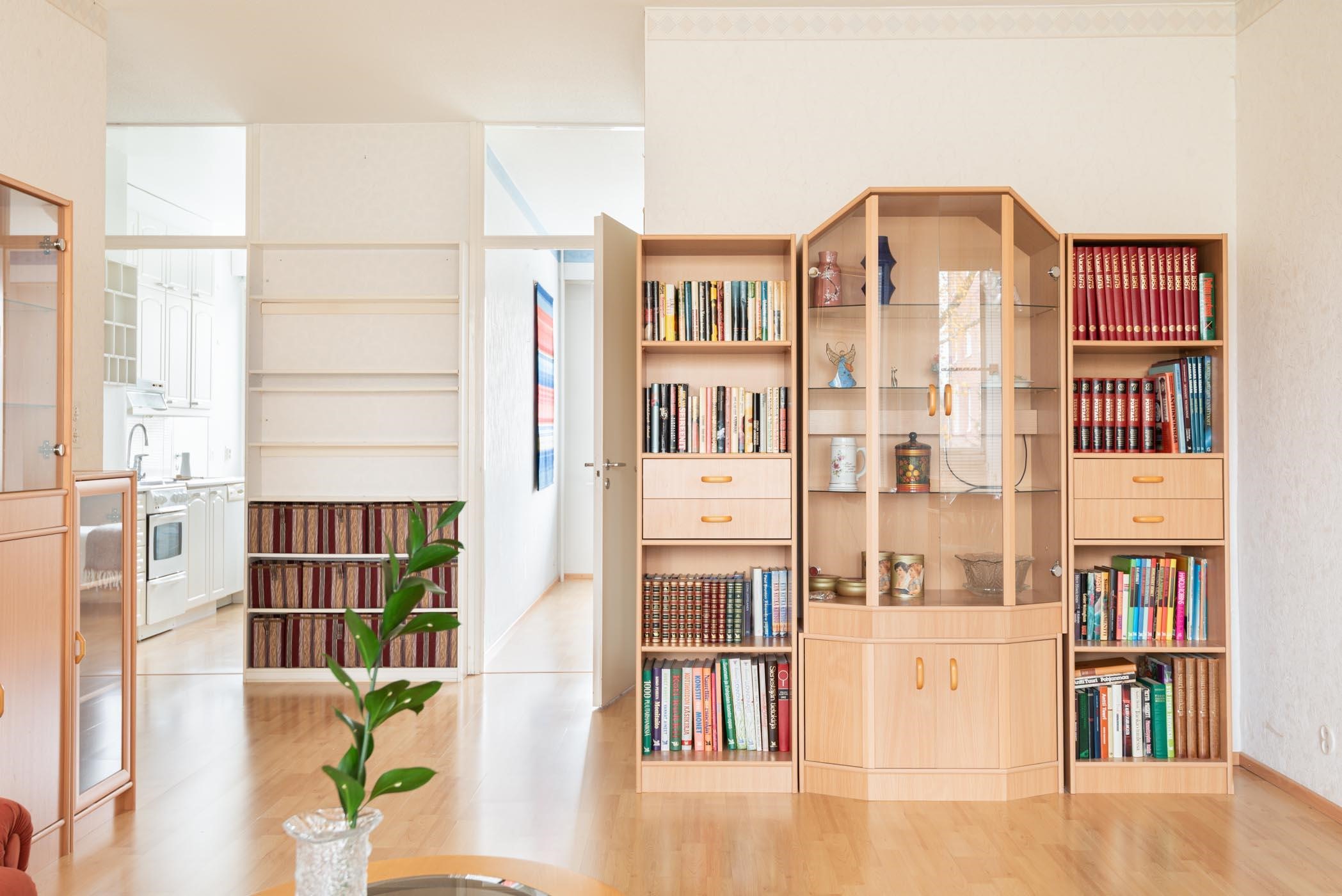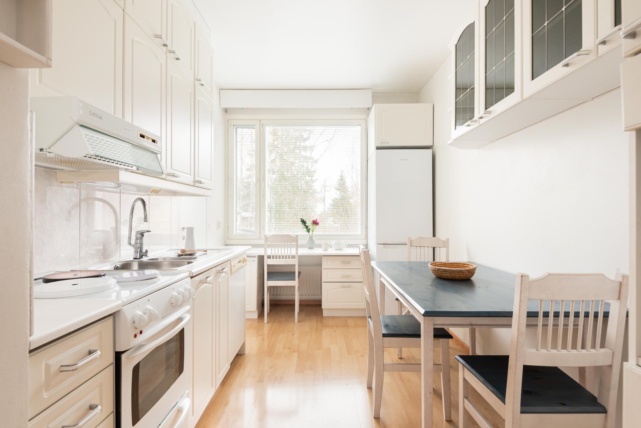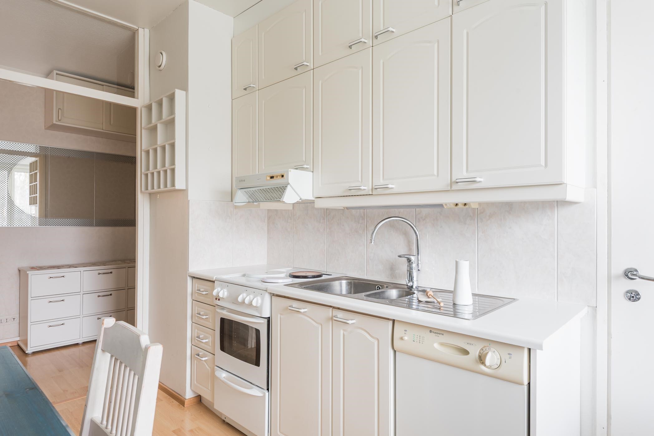 - Jääkaappipakastin, sähköliesi, liesikupu, astianpesukone (ei käytetty, ei tietoa toimivuudesta), kaapistot, kiinteät valaisimet.