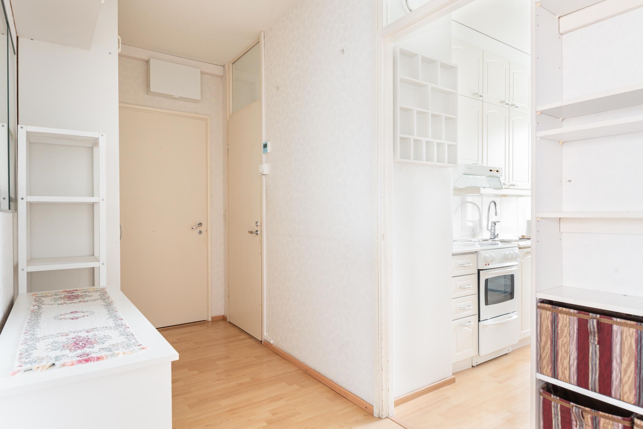 Keittiö: laminaatti, maali/tapetti (laminaatin alla vanha muovimatto). Olohuone: laminaatti, maali/tapetti (laminaatin alla vanha muovimatto). Makuuhuone: laminaatti, maali/tapetti (laminaatin alla vanha muovimatto). Kylpyhuone: laatta, laatta. Eteinen: laminaatti, maali/tapetti (laminaatin alla vanha muovimatto).