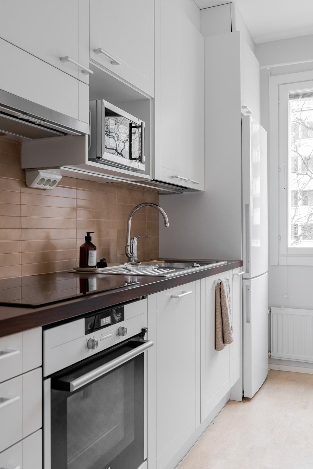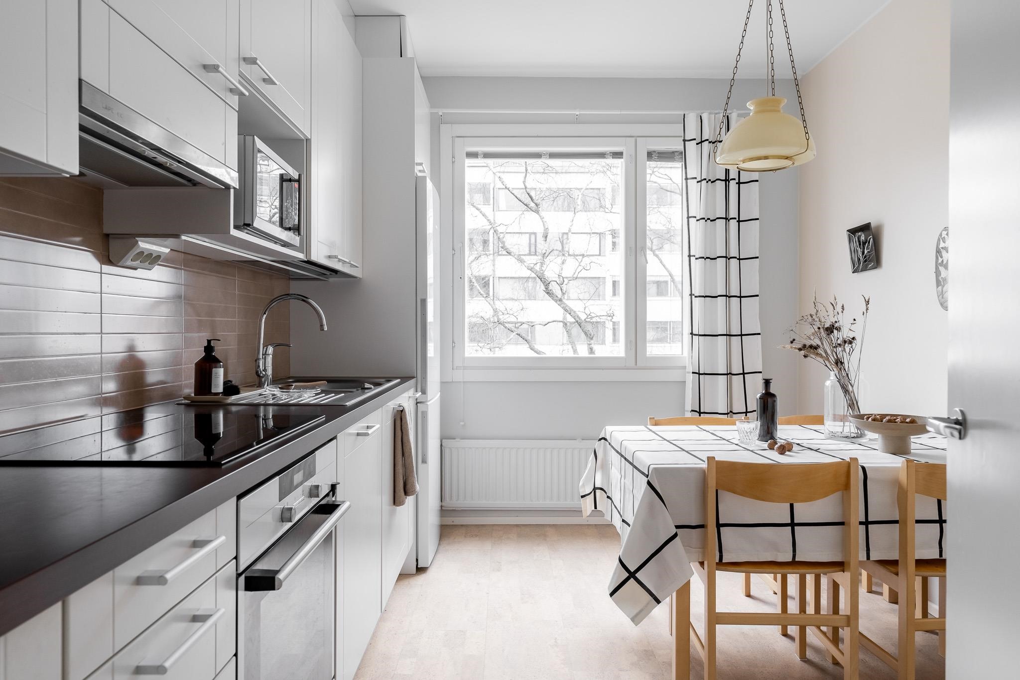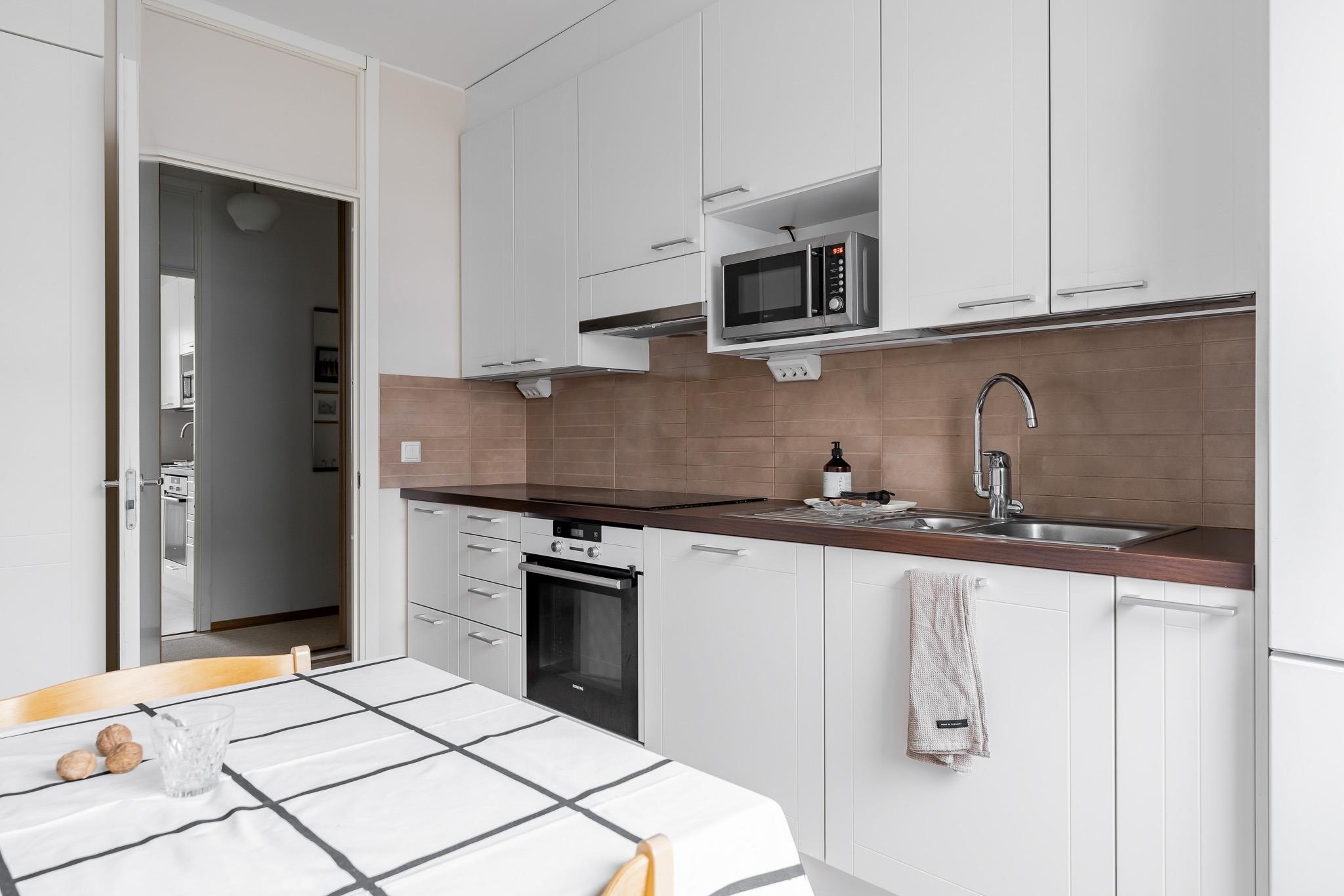 - Jääkaappipakastin, erillisuuni, induktioliesi, liesituuletin, astianpesukone, kaapistot Puustellin, kiinteät valaisimet.