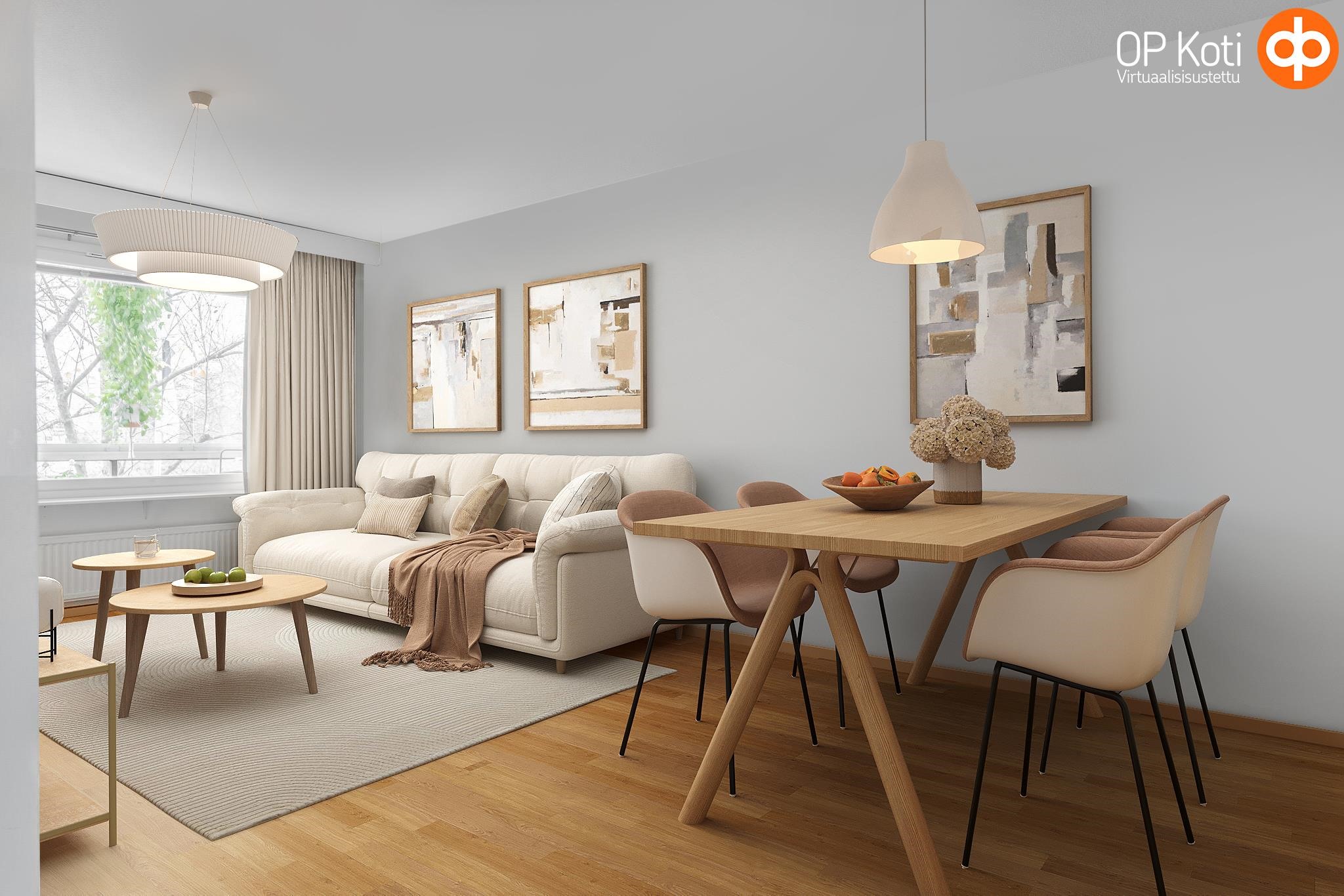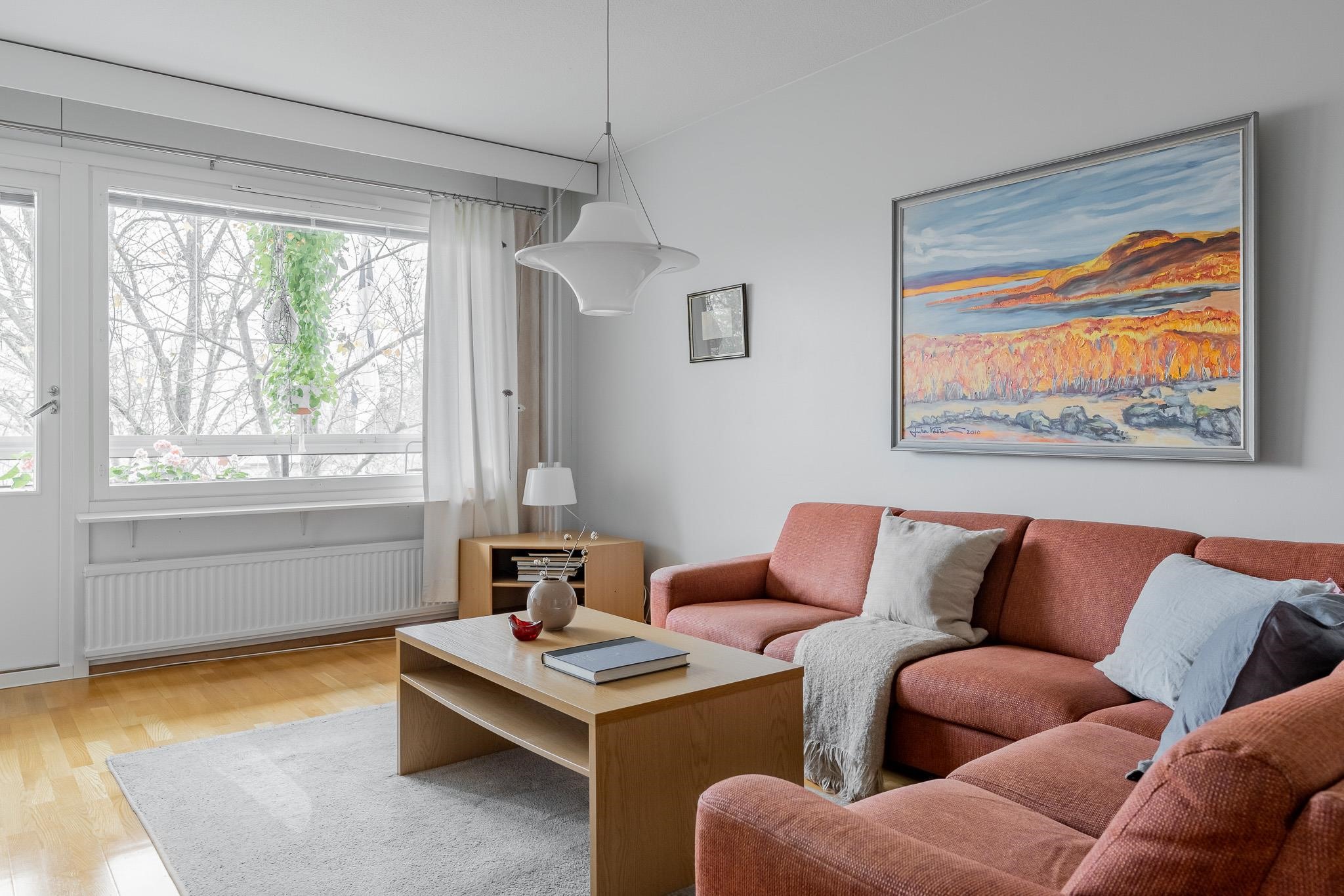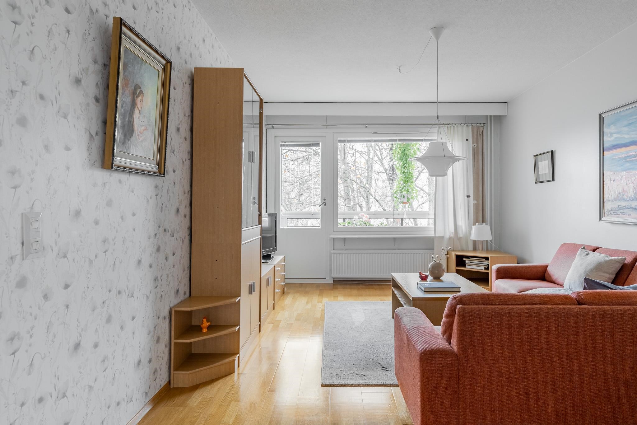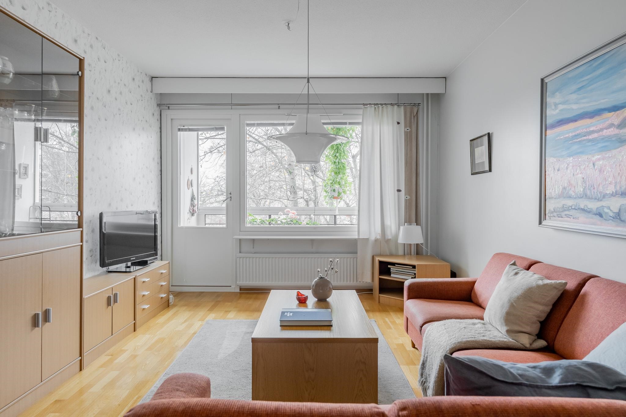 Tähän 55,5m2:n kotiin tullaan eteiseen, jossa on mukavasti säilytystilaa liukuovikaappien muodossa. Keittiö on erillinen ja remontoitu 2011. Sekä keittöön että tilavaan olohuoneeseen mahtuu hyvin ruokaryhmä. Olohuoneen jatkeena on koko huoneen levyinen lasitettu parveke. Näkymät ovat kaakkoon.