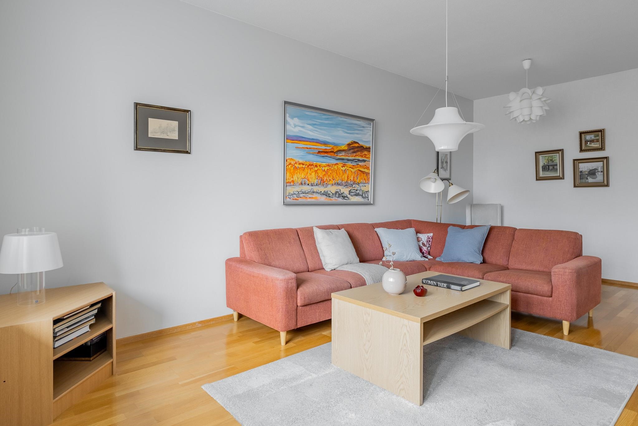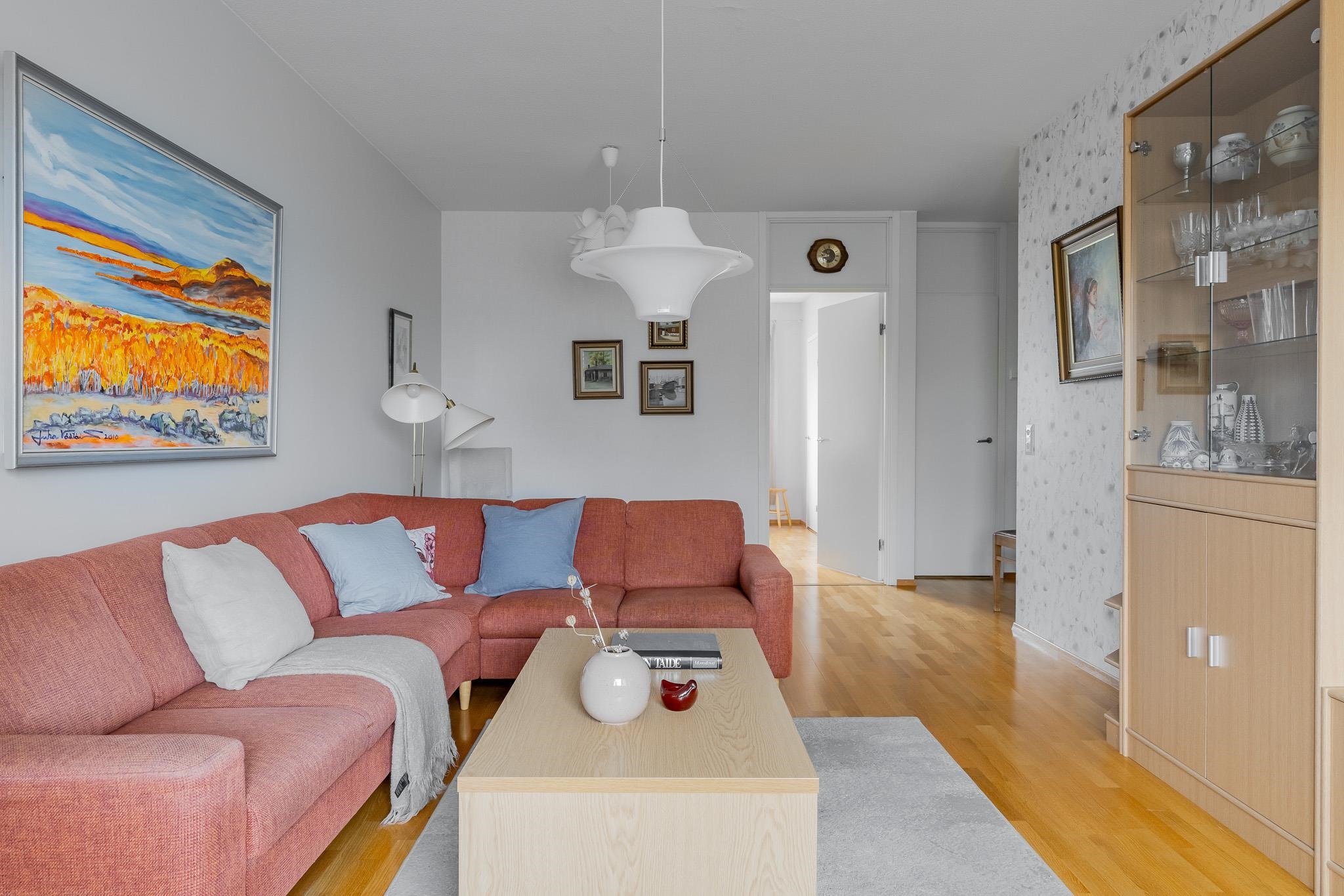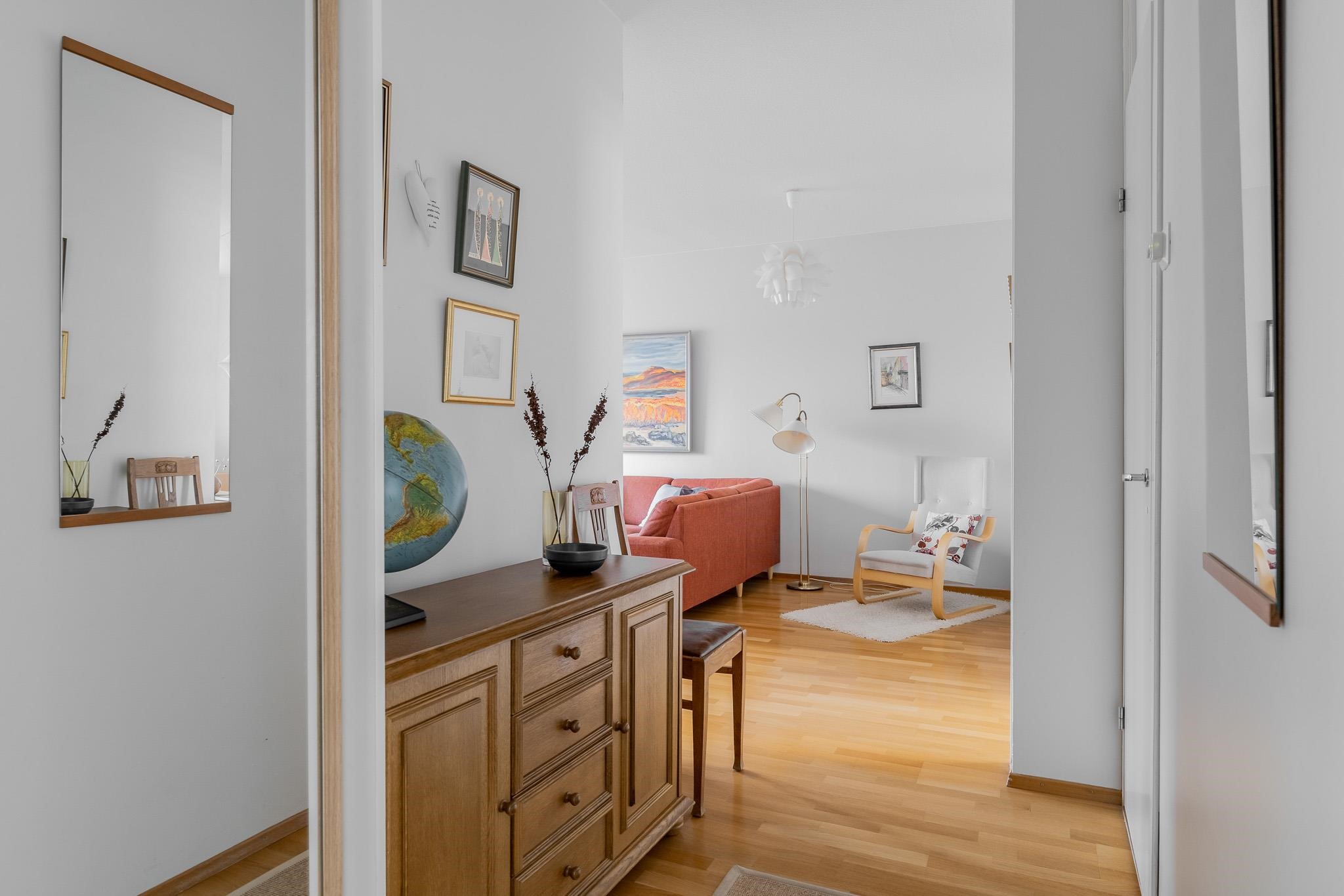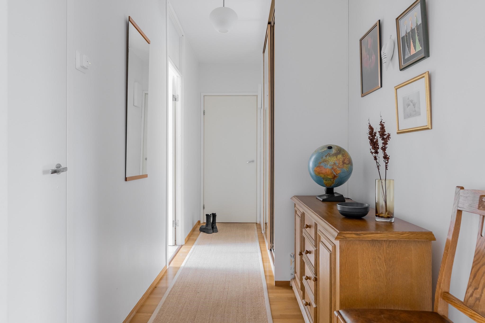 Tähän 55,5m2:n kotiin tullaan eteiseen, jossa on mukavasti säilytystilaa liukuovikaappien muodossa. Keittiö on erillinen ja remontoitu 2011. Sekä keittöön että tilavaan olohuoneeseen mahtuu hyvin ruokaryhmä. Olohuoneen jatkeena on koko huoneen levyinen lasitettu parveke. Näkymät ovat kaakkoon.