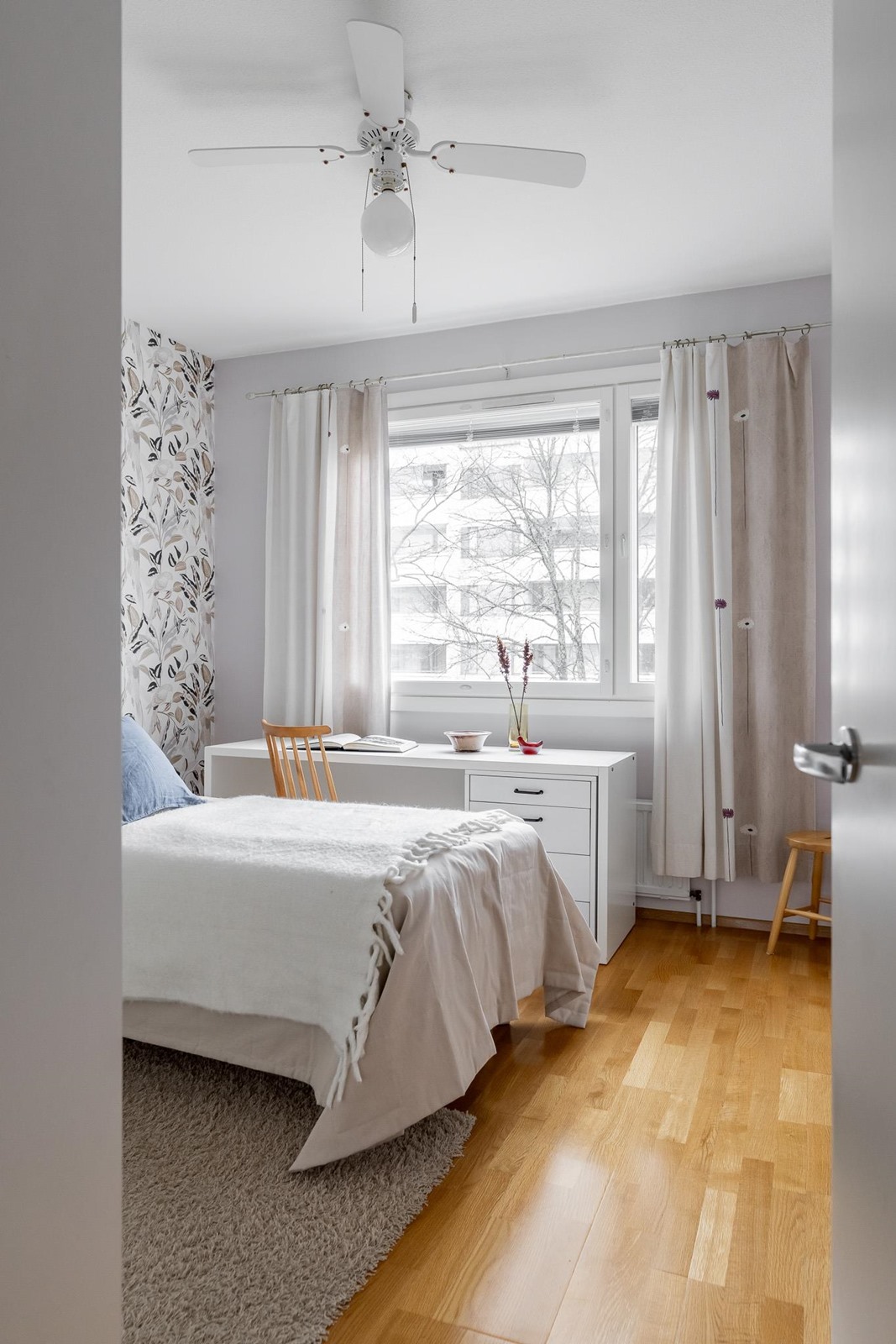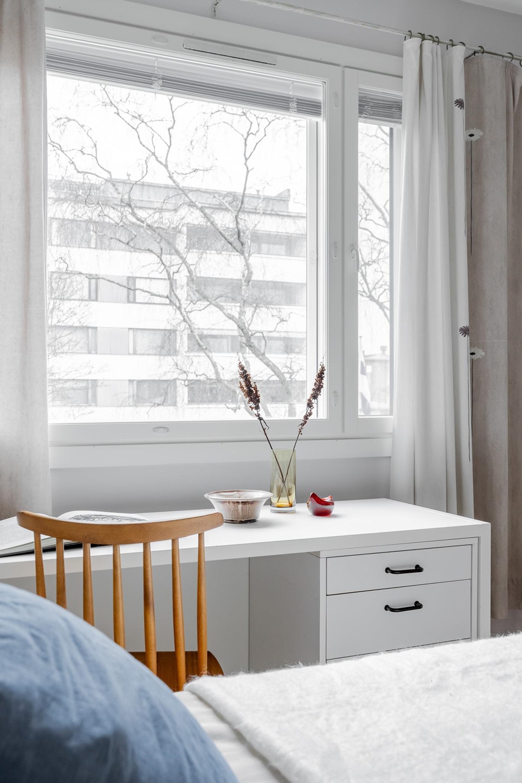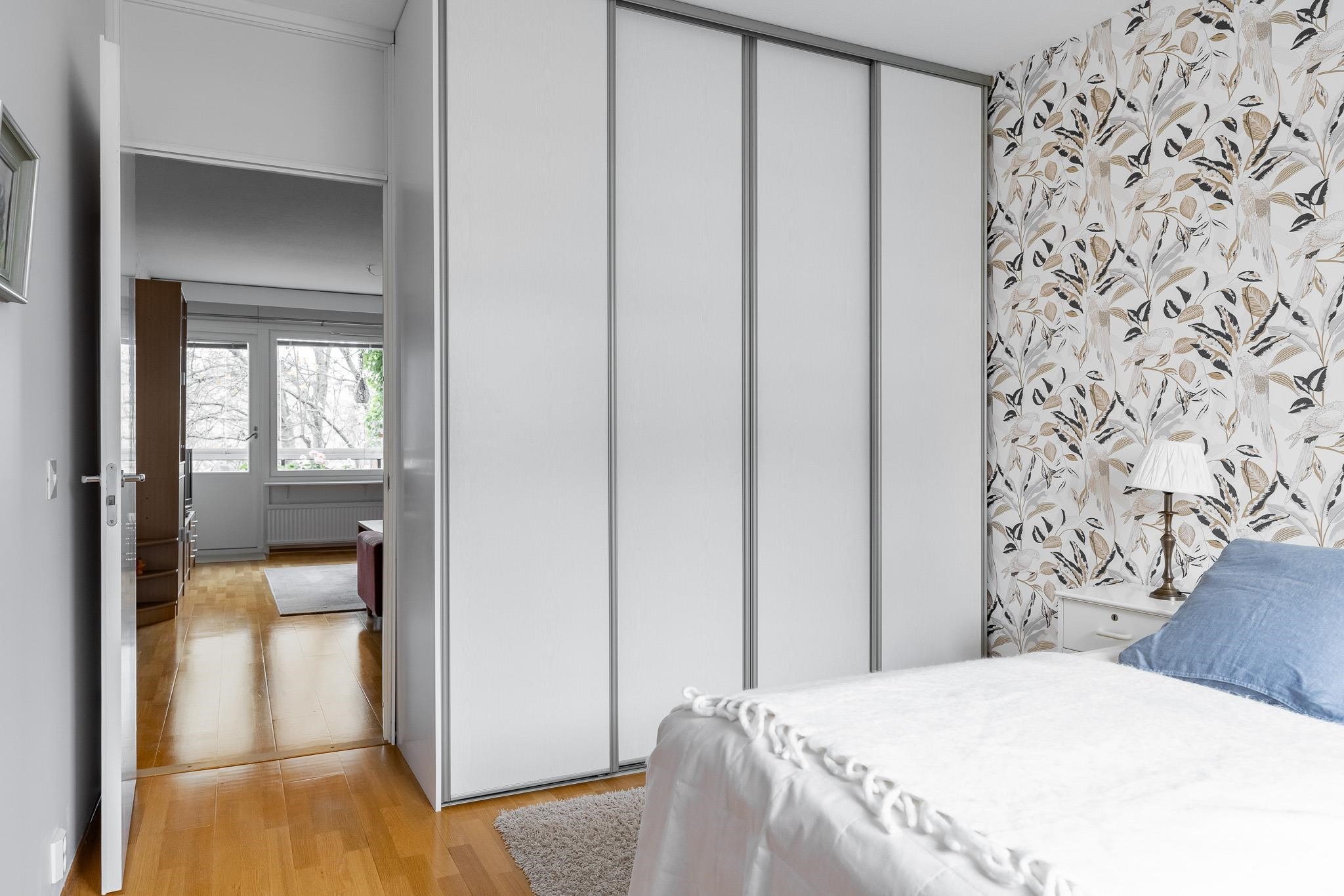Makuuhuoneesta löytyy kaappeja ja lisää säilytystilaa yhtiön kellarista.