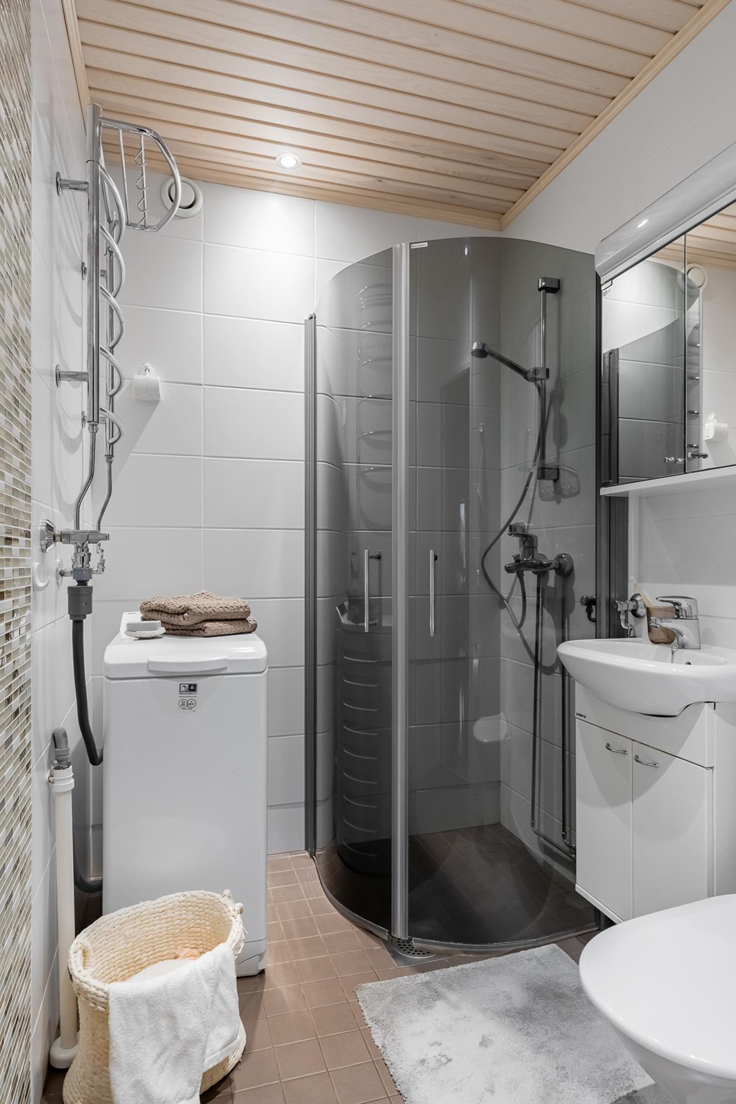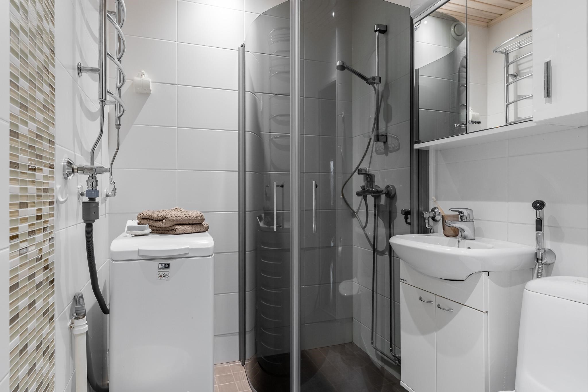 - Kylpyhuone, suihku, suihkuseinä, peilikaappi, kaapit, allaskaappi, pesukoneliitäntä, lattialämmitys, kiinteät valaisimet. Pyyhekuivain vesikiertoinen