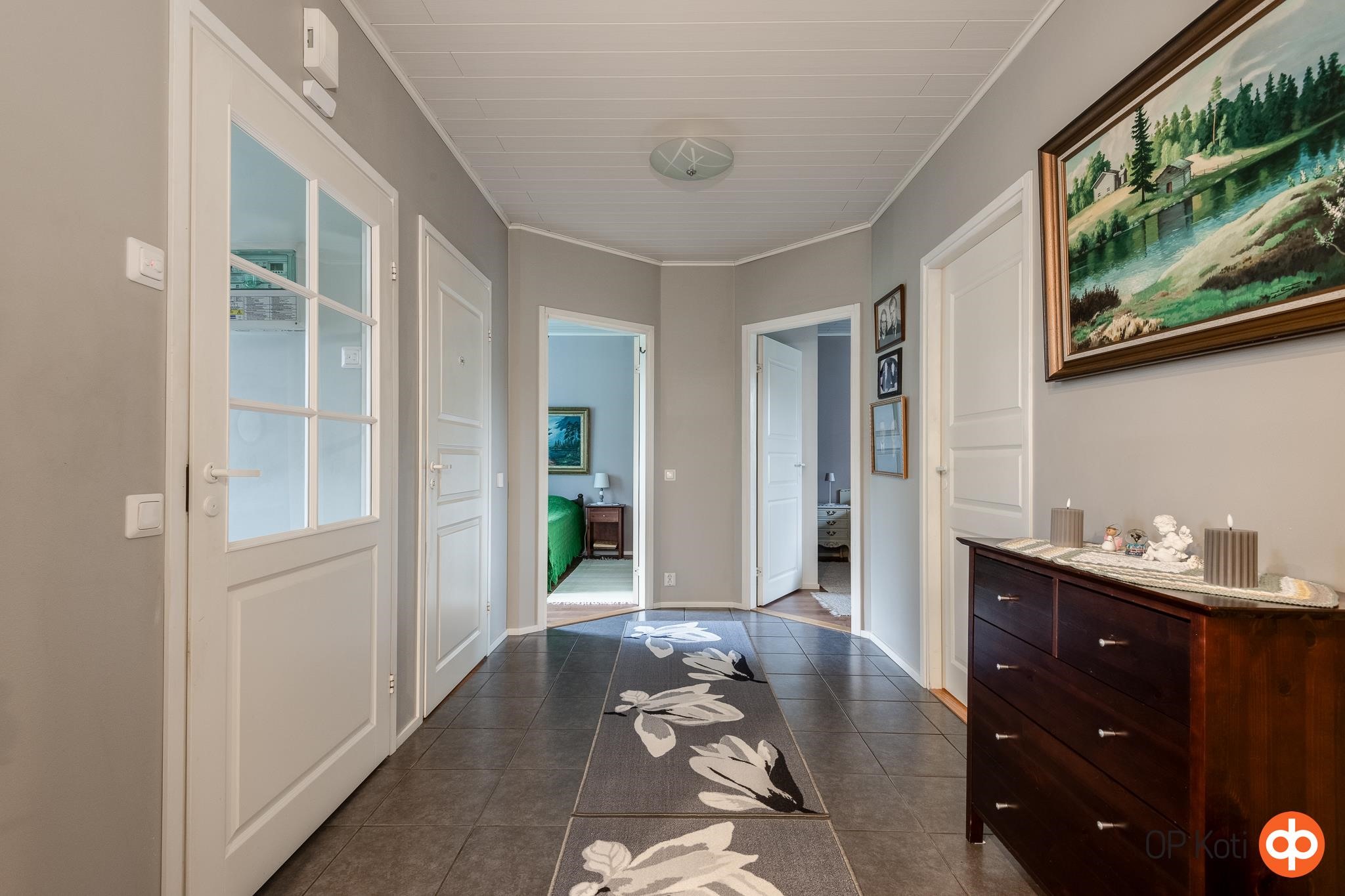 Keittiö: laatta, maali, mdf. Olohuone: laatta, tapetti/maali, mdf. Makuuhuone 1: laatta, maali, mdf. Makuuhuone 2: laatta, maali, mdf. Kodinhoitohuone: laatta, laatta, paneli. Sauna: laatta, paneli, paneli. Kylpyhuone: laatta, laatta, paneli. Eteinen: laatta, maali, mdf. Wc: laatta, maali/tapetti, mdf.