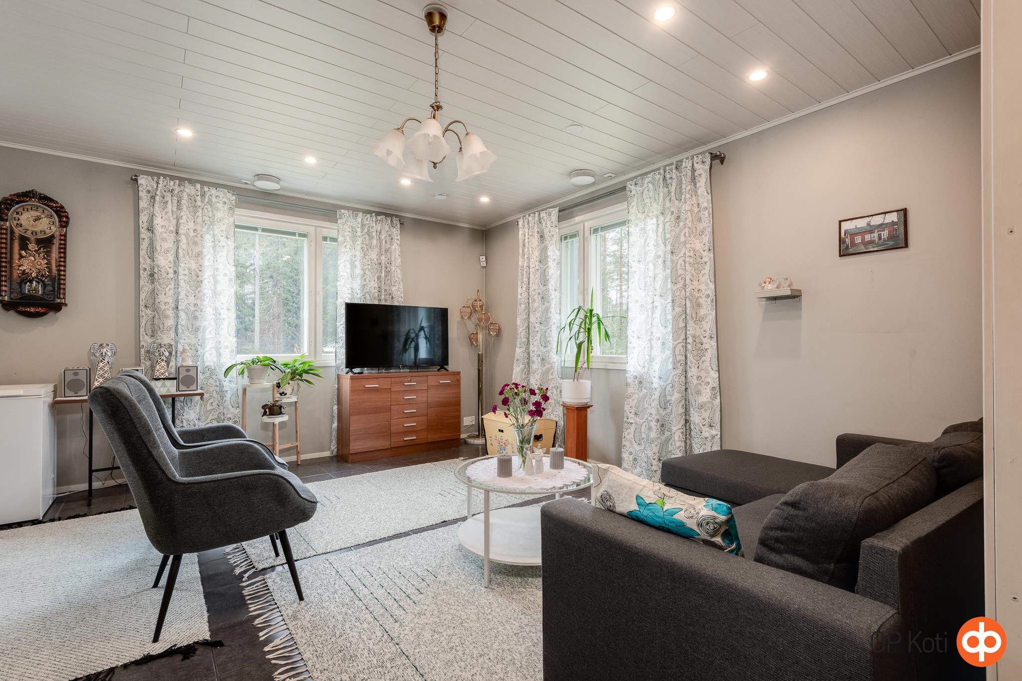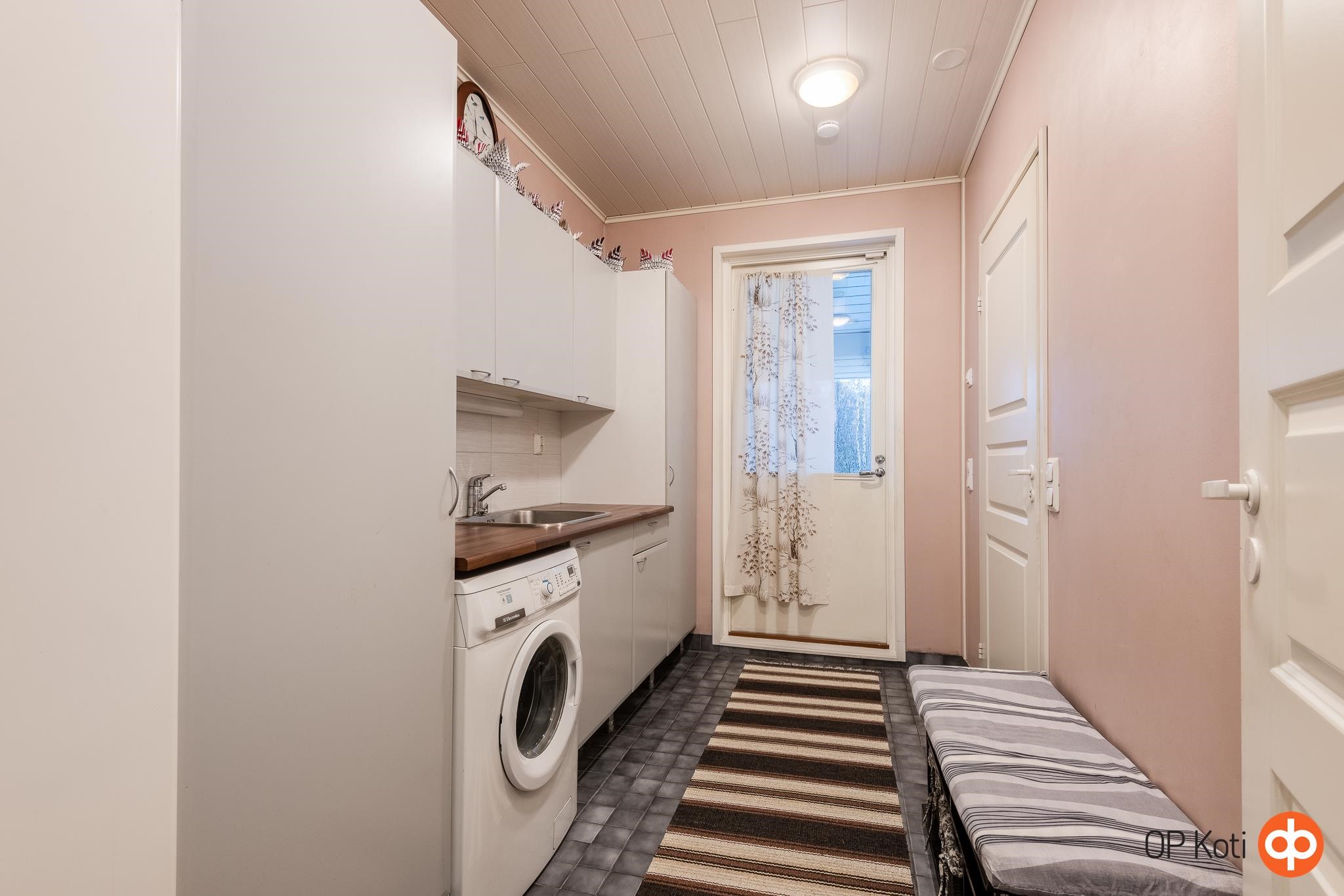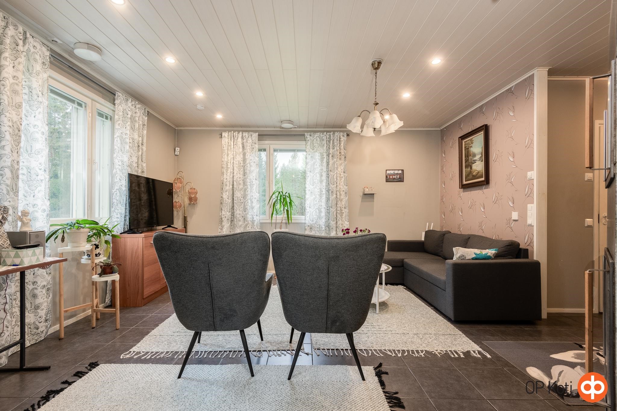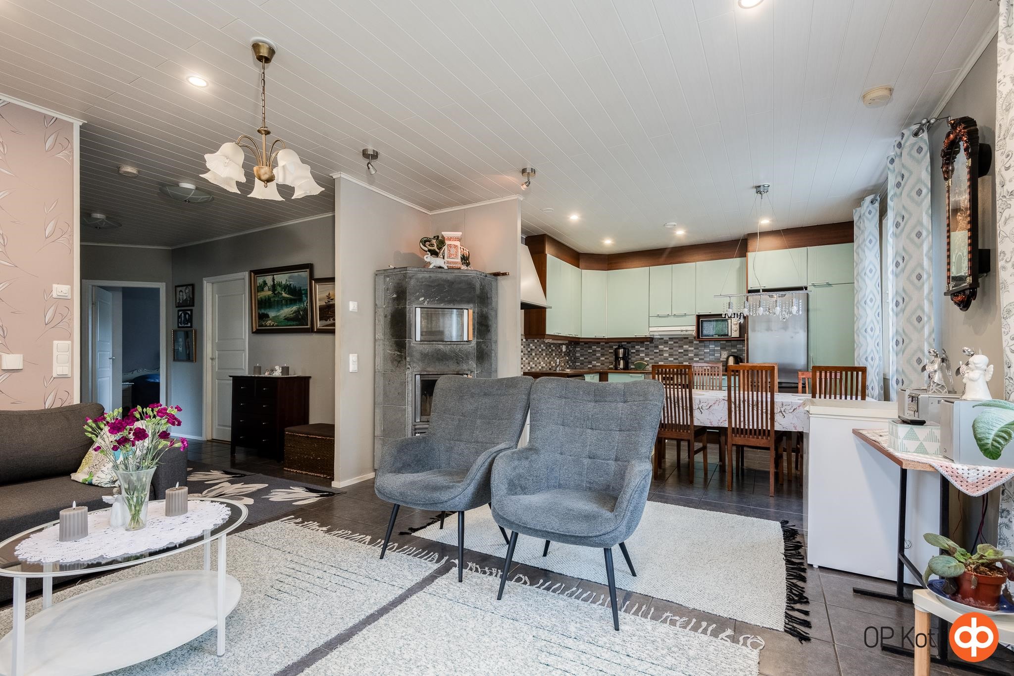 Asuintilat jakautuvat käytännöllisesti kolmeen huoneeseen, keittiöön, kodinhoitohuoneeseen, kylpyhuoneeseen, saunaan sekä erilliseen wc:hen. Keittiö on varustettu modernisti, ja varaava takka tuo lämpöä ja tunnelmaa olohuoneeseen. Saunassa on puukiuas, joka takaa rentouttavan saunaelämyksen. Kodinhoitohuone ja erillinen wc tuovat arkeen helppoutta ja toimivuutta.