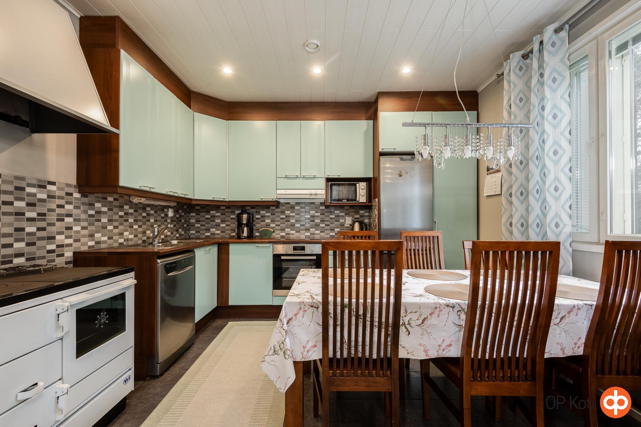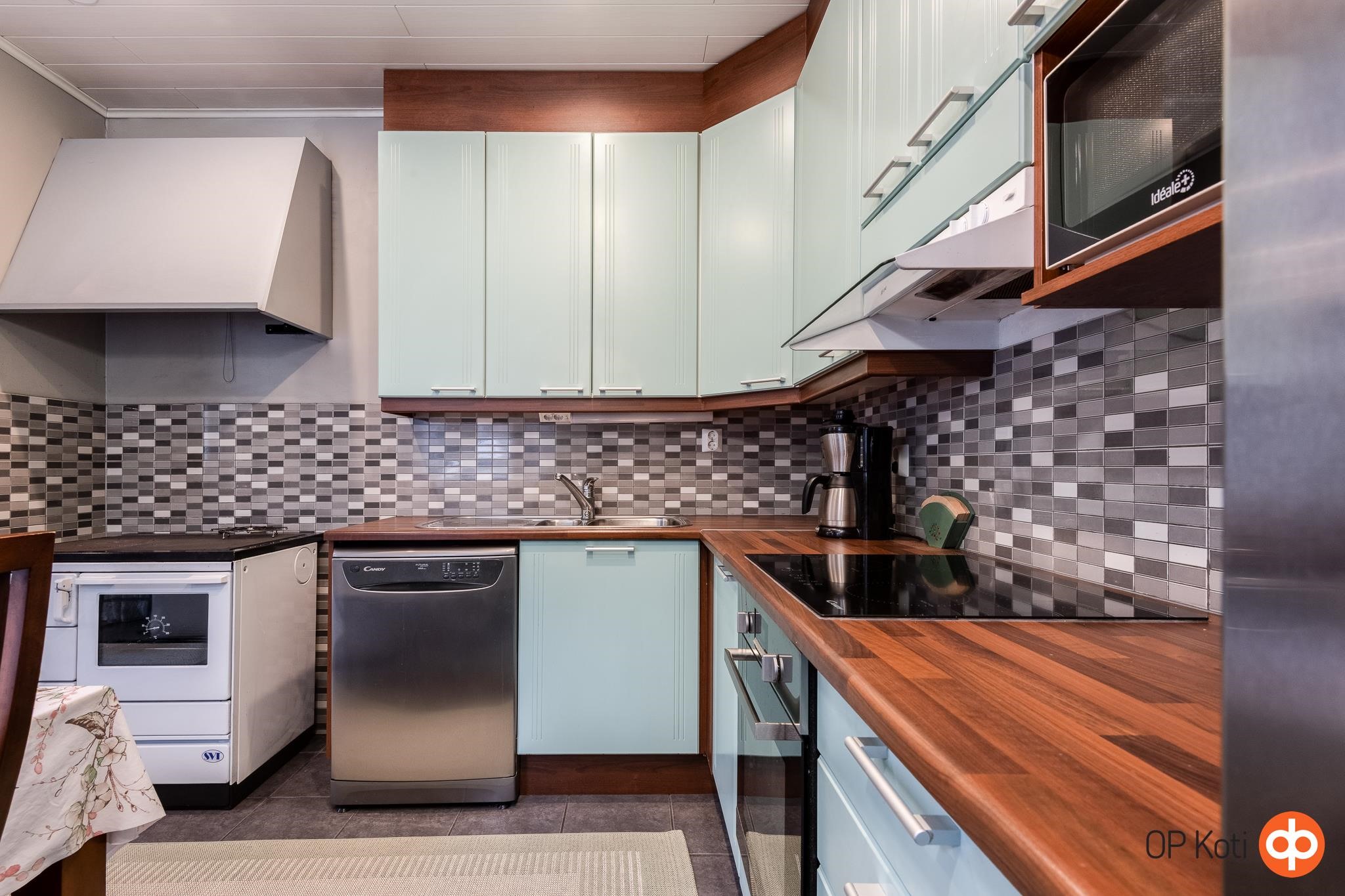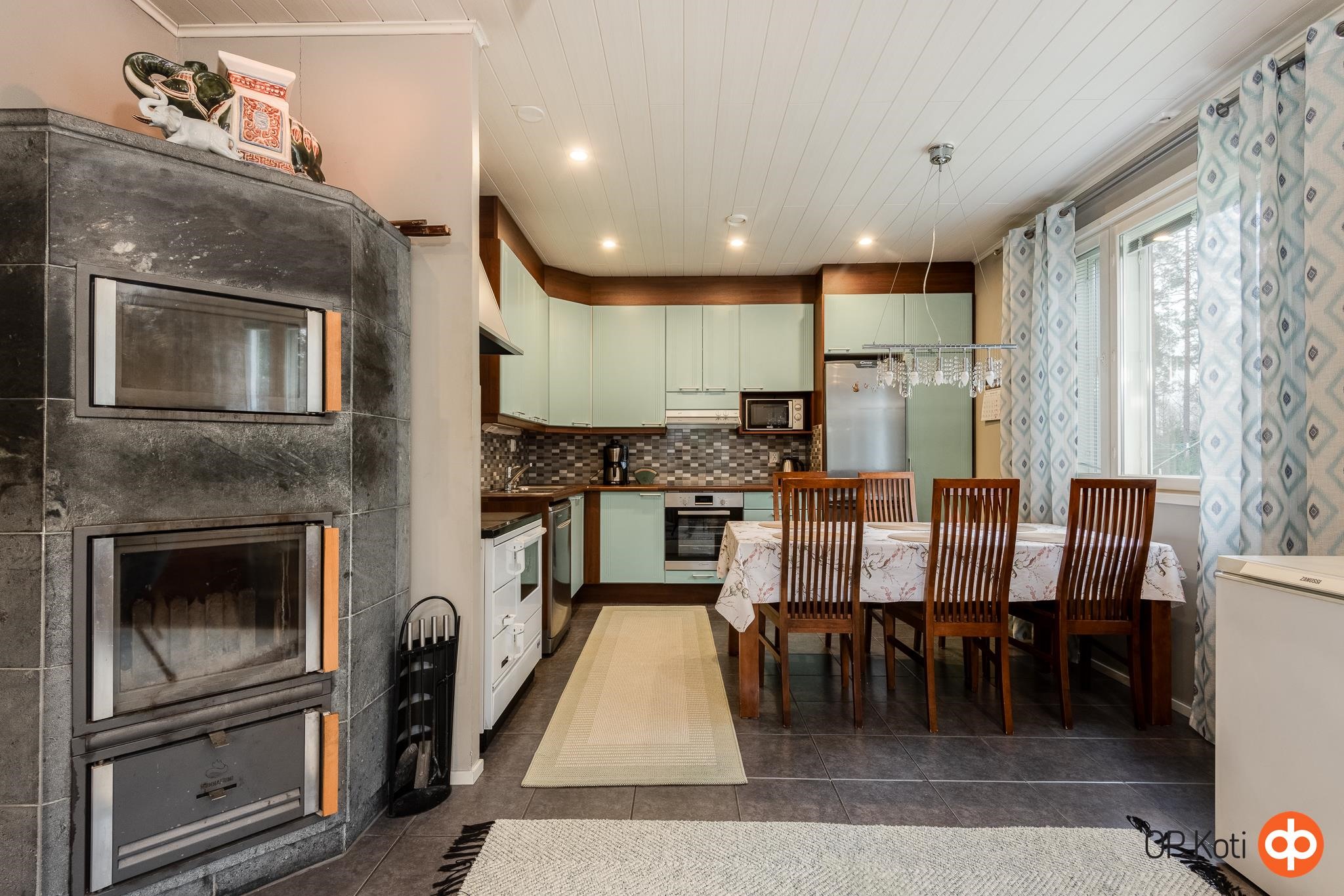 - Jääkaappipakastin, erillisuuni, induktioliesi, liesituuletin, leivinuuni Nunna takka, astianpesukone, kaapistot, kiinteät valaisimet, Puuhella.