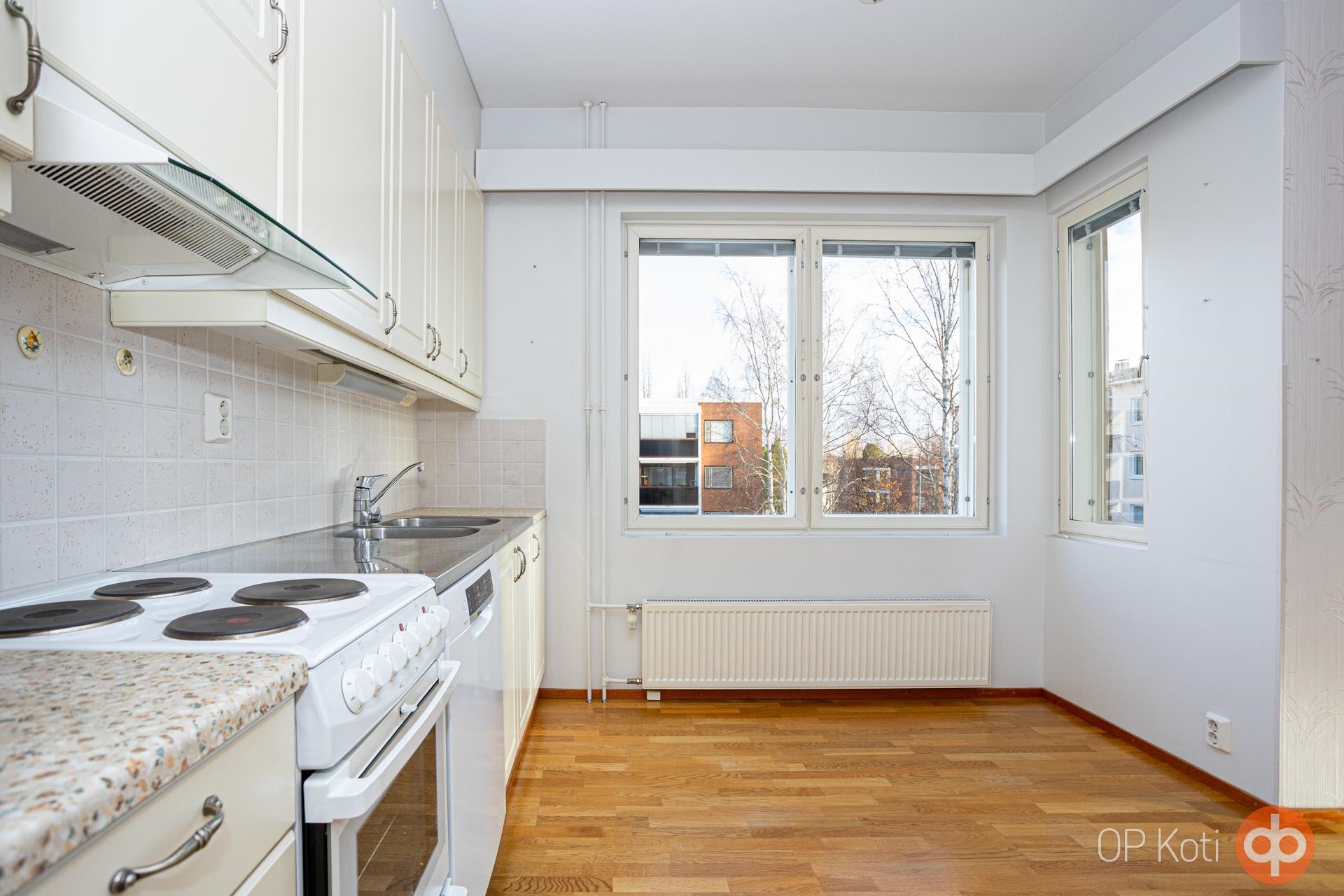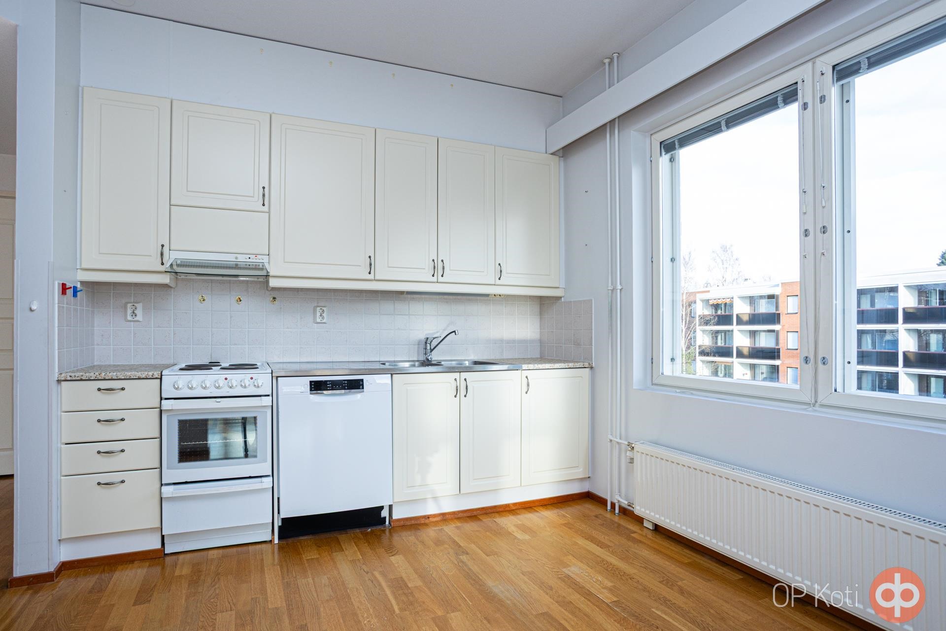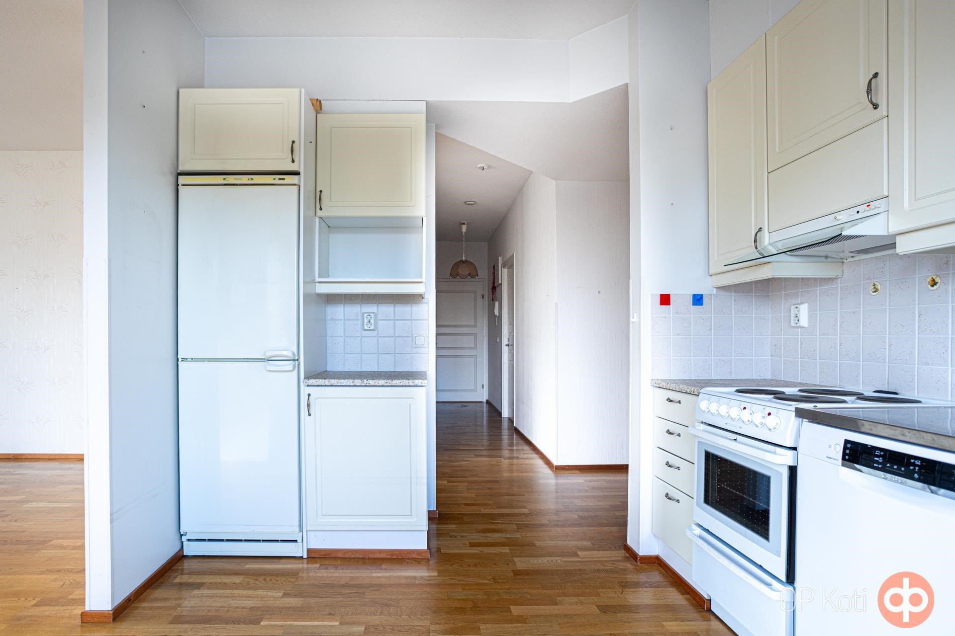 - Jääkaappipakastin, sähköliesi, liesituuletin, astianpesukone, kaapistot, kiinteät valaisimet.