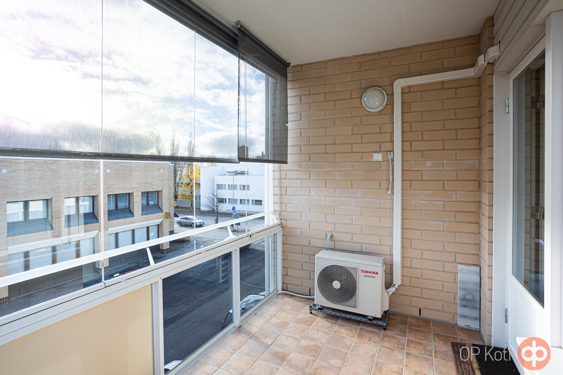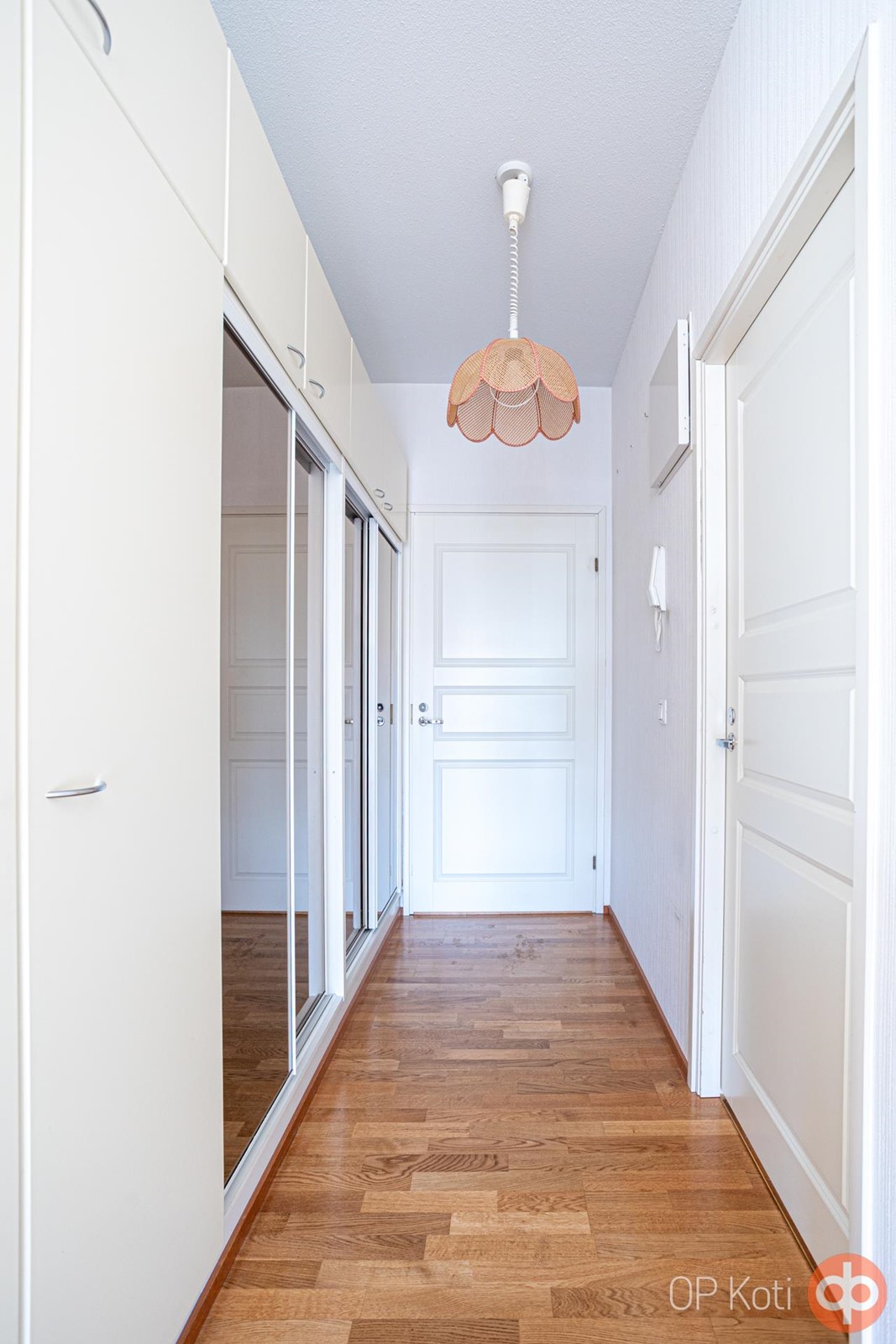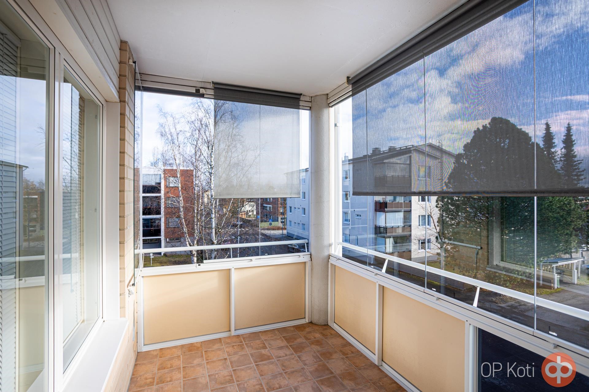 Lattiat ovat parkettia, ja kylpyhuone on kauttaaltaan kaakeloitu. Lisäksi asunnossa on erillinen tilava wc, jossa on kaakelilattia. Etelään avautuva lasitettu parveke tarjoaa mukavan lisätilan oleskeluun ja tuo valoa koko asuntoon.