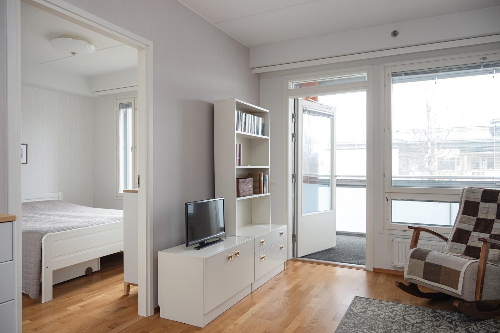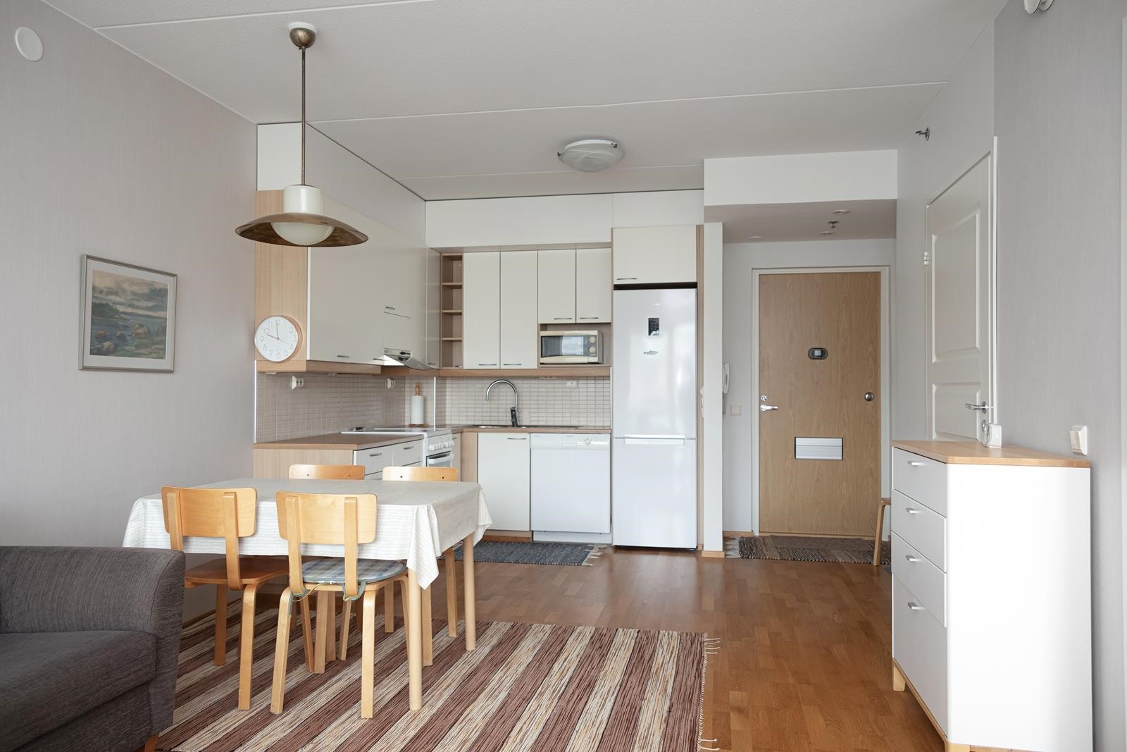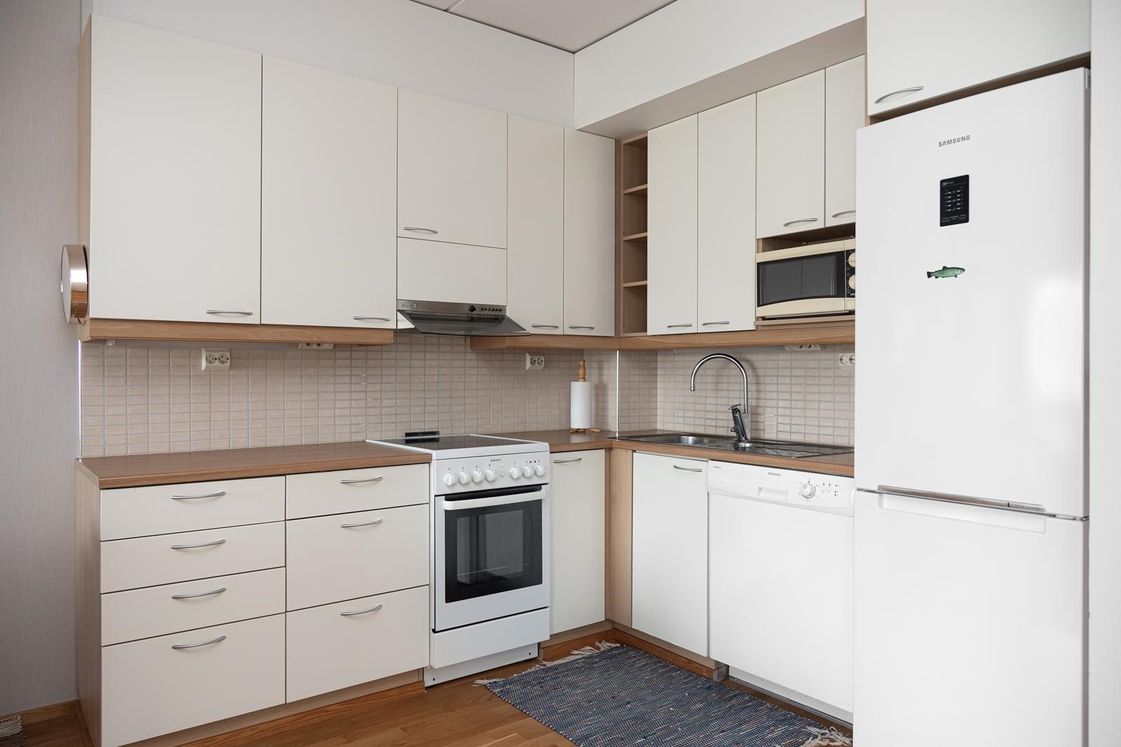 - Jääkaappipakastin, keraaminen liesi, liesituuletin, mikroaaltouuni, astianpesukone, kaapistot, kiinteät valaisimet.