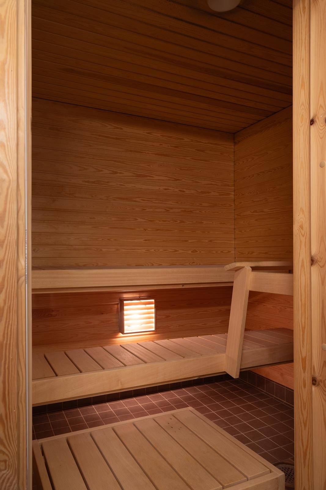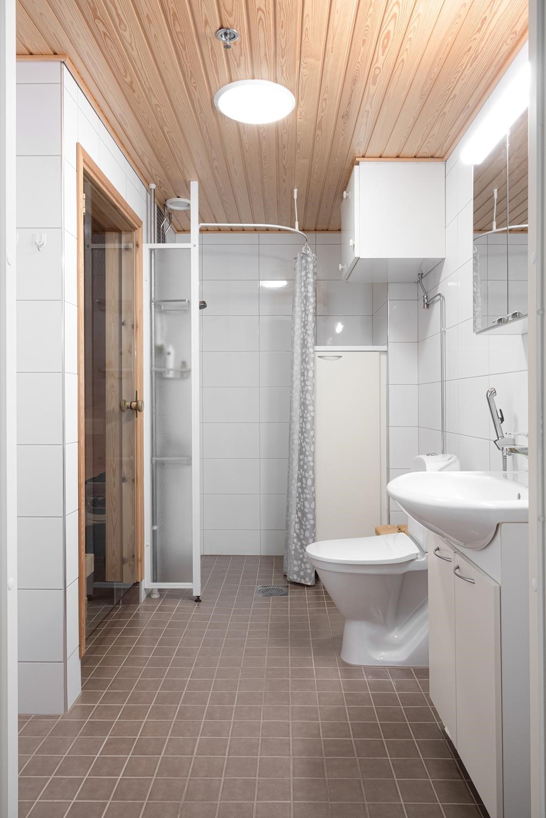 - Sauna, sähkökiuas, kylpyhuone, suihku, suihkuseinä, peilit, peilikaappi, allaskaappi, pesukoneliitäntä, lattialämmitys, kiinteät valaisimet.