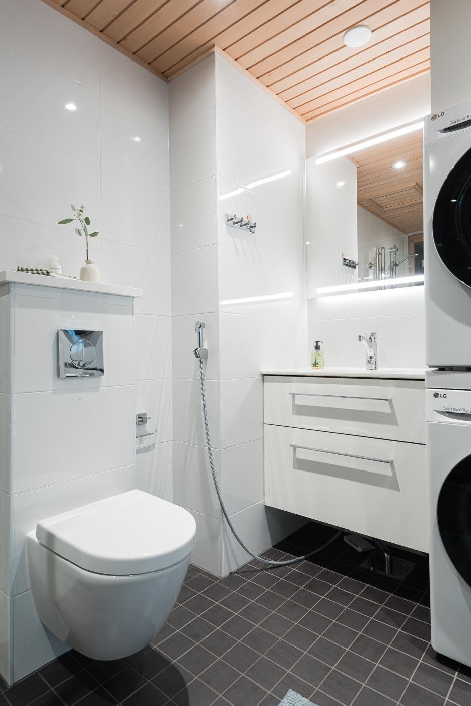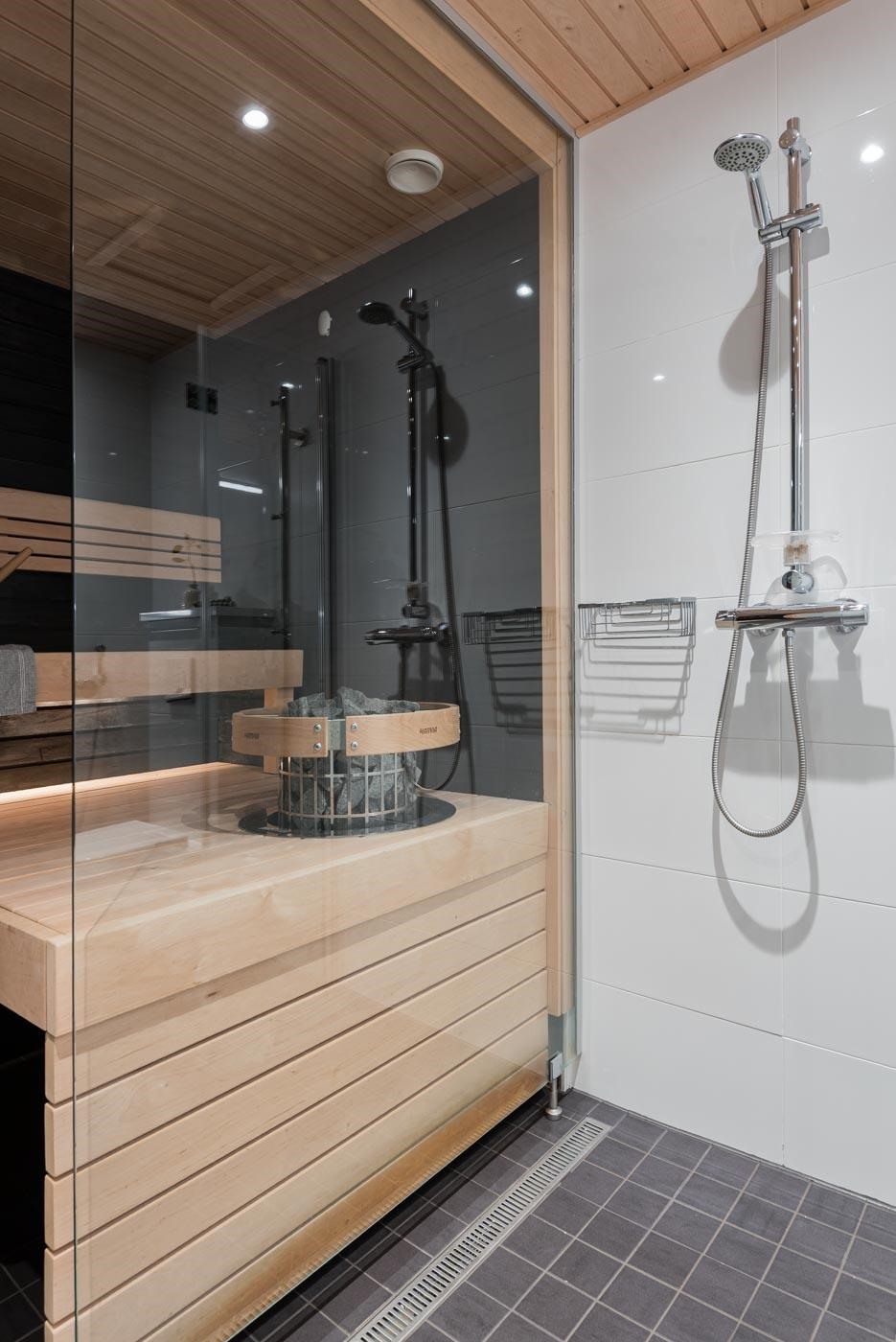 - Sauna; sähkökiuas Kylpyhuone, wc-istuinsuihku, suihkuseinä, valopeili, allaskaappi vetolaatikostolla, pesukoneliitäntä, lattialämmitys, kiinteät valaisimet. Lisäksi erillinen wc.