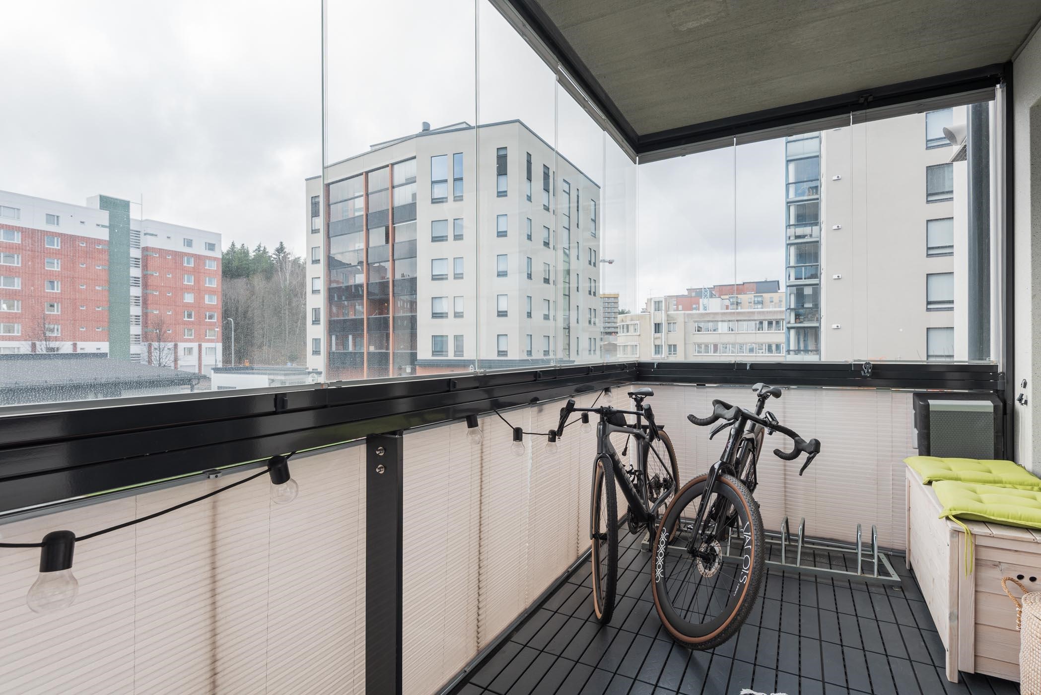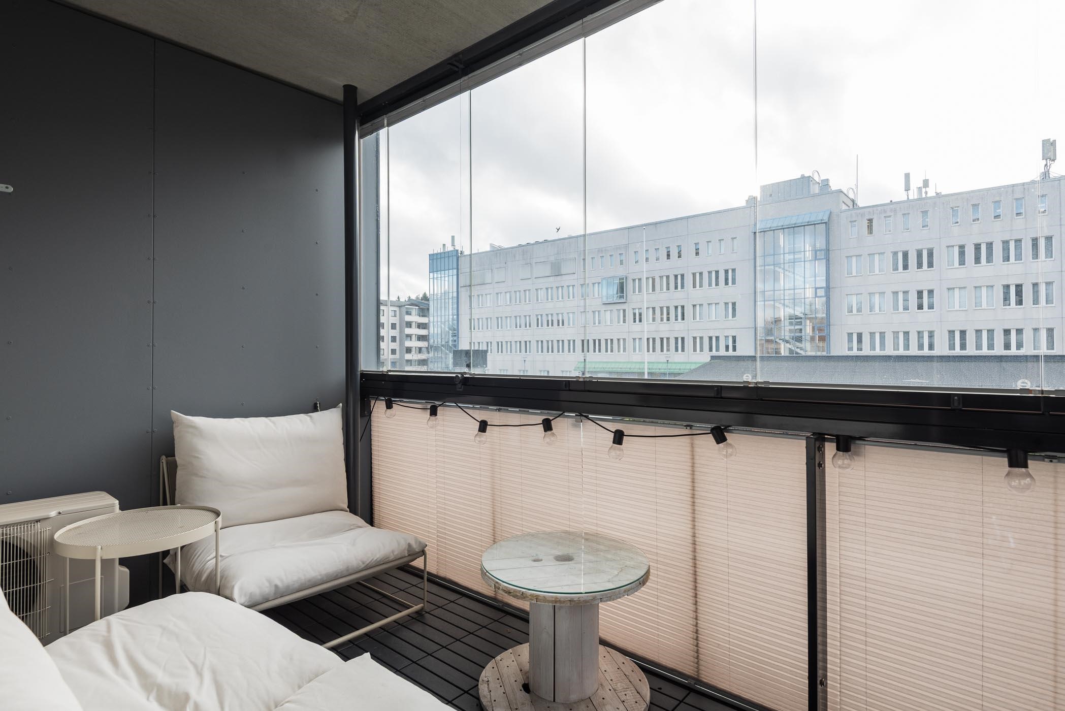 Huoneistossa on hyvä pohjaratkaisu, tilavan olohuoneen ja keittiön tilanjakajana toimii tyylikäs saarreke. Keittiö on varustettu laadukkailla AEG-kodinkoneilla ja Puustellin kalusteilla. Huoneistossa on lasitettu parveke, josta näkymä sisäpihalle. Tammiparketti ja laadukkaat pintamateriaalit viimeistelevät kokonaisuuden.