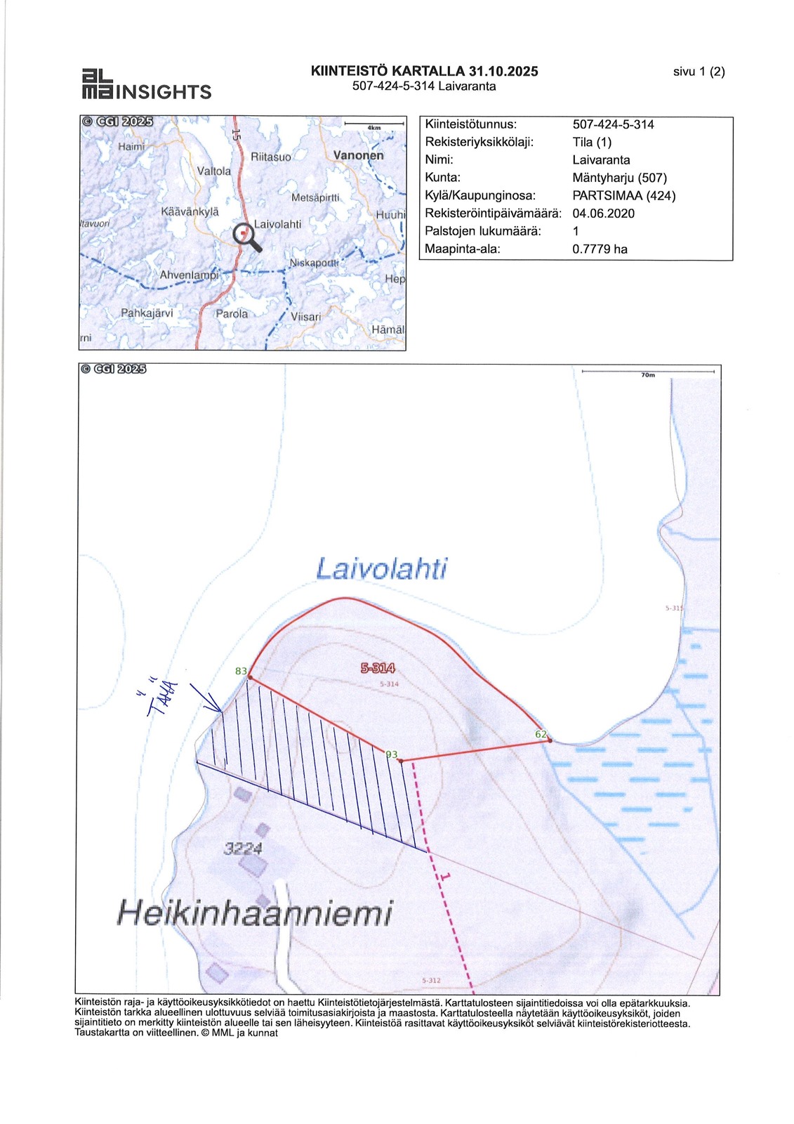 - Rantaosayleiskaava. Noin 5 500 m² määräala kiinteistöstä 507-424-5-315. Lomarakennusten alue. Rantarakentamista, rakennuspaikan kokoa ja rakennusoikeutta koskevat määräykset muodostuvat voimassa olevan rakennusjärjestyksen mukaisesti.Eli alue on kaavassa lomarakennusten aluetta. Kaavan vastainen rakentaminen tutkitaan tapauskohtaisesti poikkeamismenettelyn kautta. Olemassa olevan vapaa-ajan asunnon käyttötarkoituksen muuttaminen vakituiseen asumiseen on jossain tapauksessa mahdollista suoralla rakentamisluvalla (rakennusjärjestys § 29/sivu 21). Alueen rakentamista ohjataan kunnan rakennusjärjestyksellä Mäntyharjun kunta
