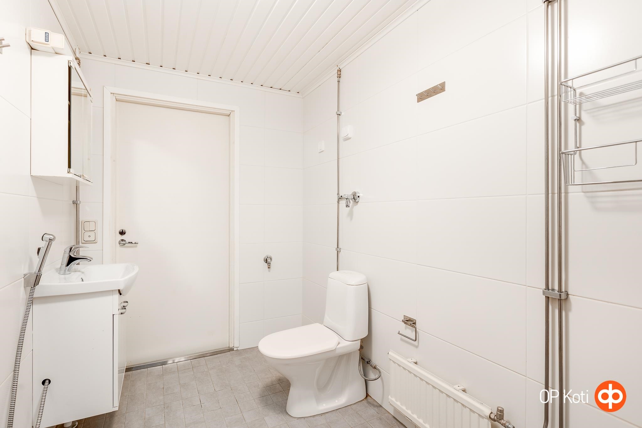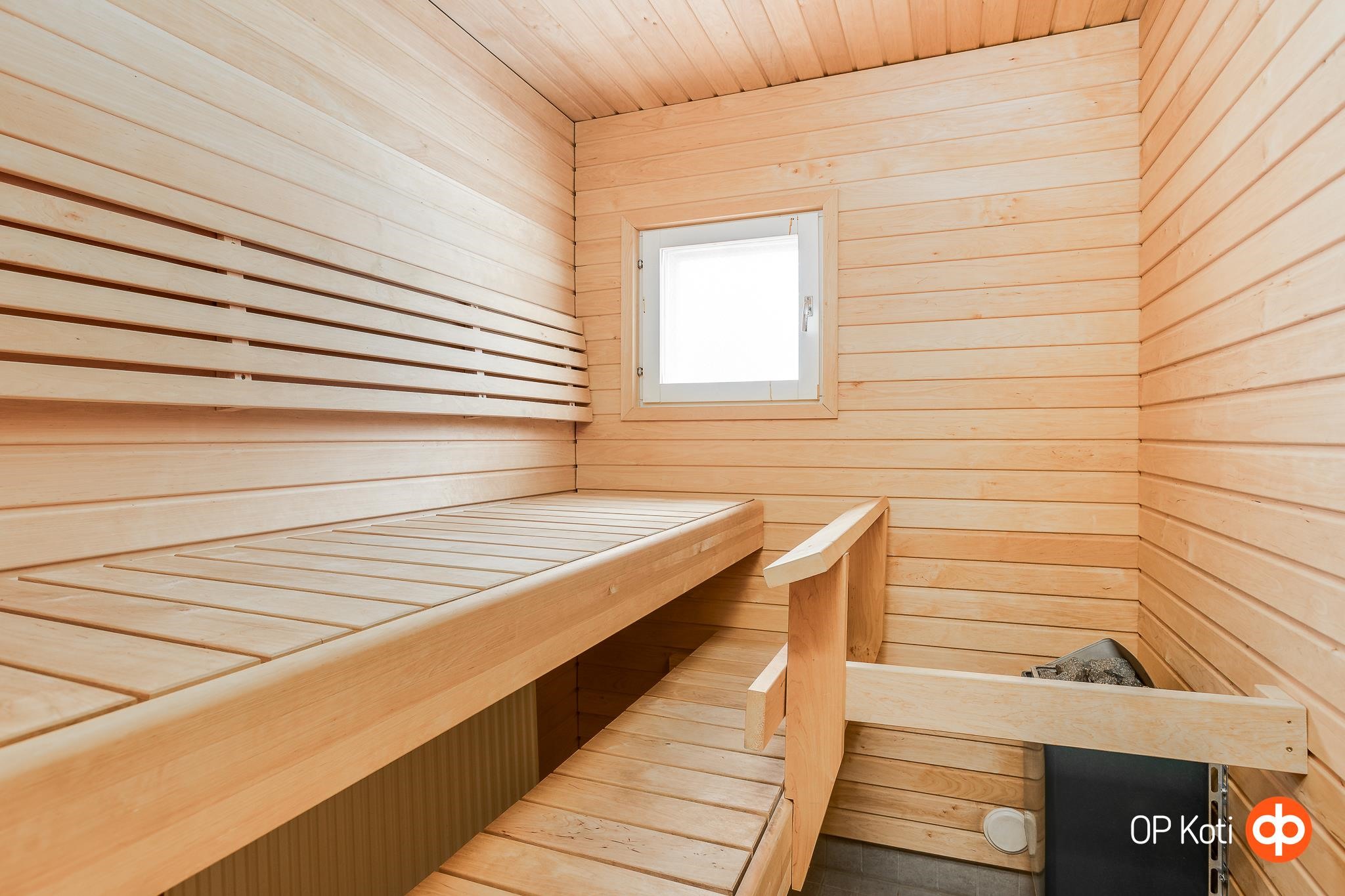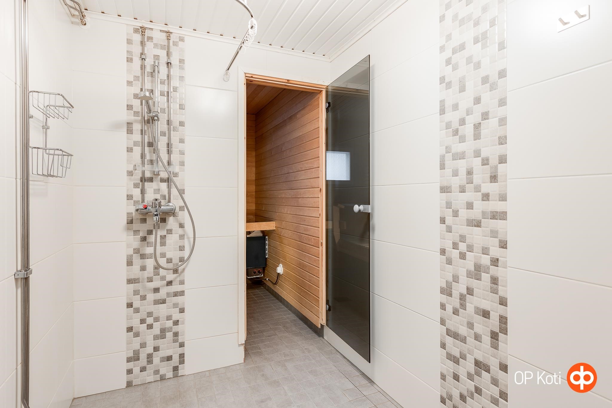 - Sauna, sähkökiuas, kylpyhuone, suihku, peilikaappi, allaskaappi, pesukoneliitäntä, kiinteät valaisimet.