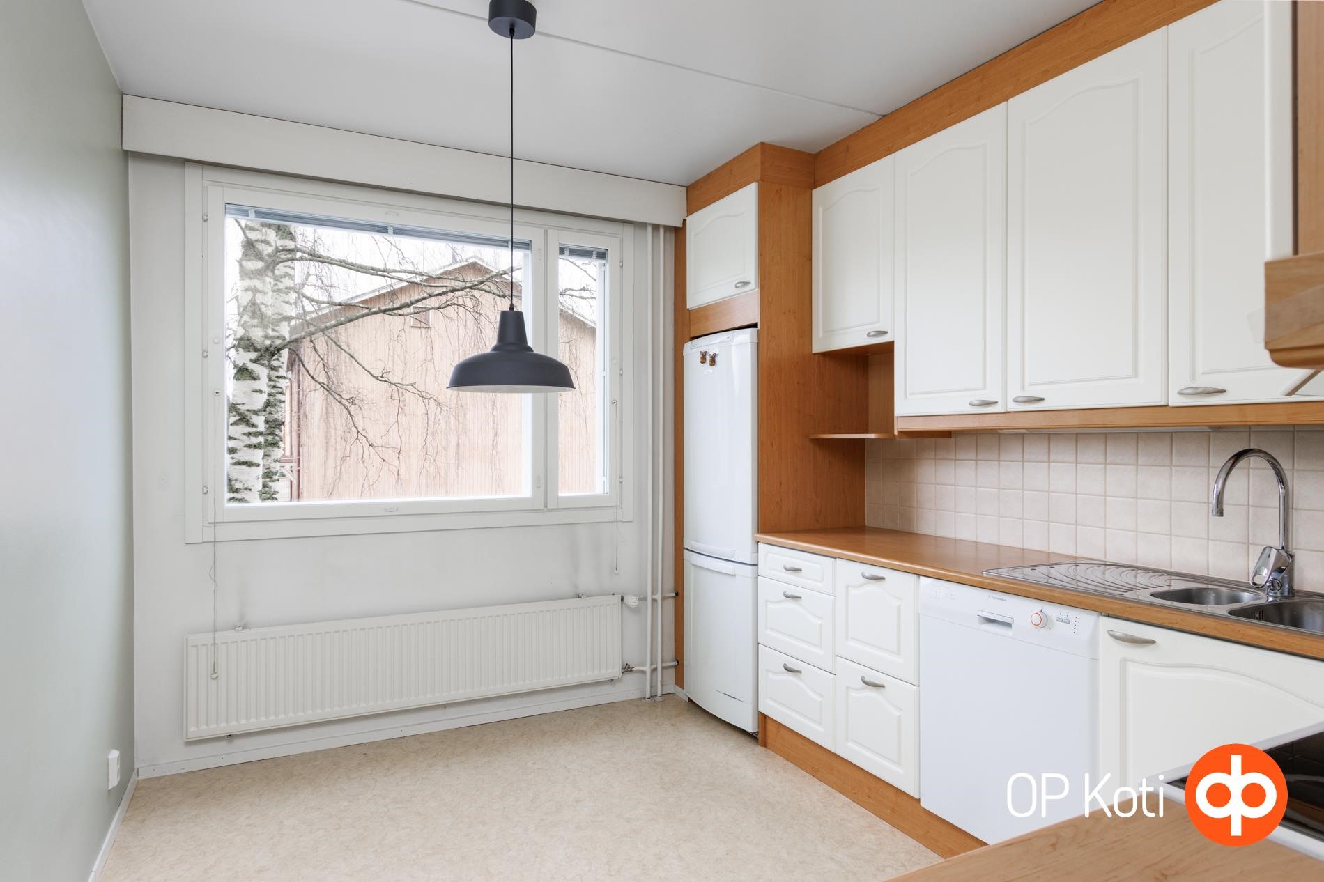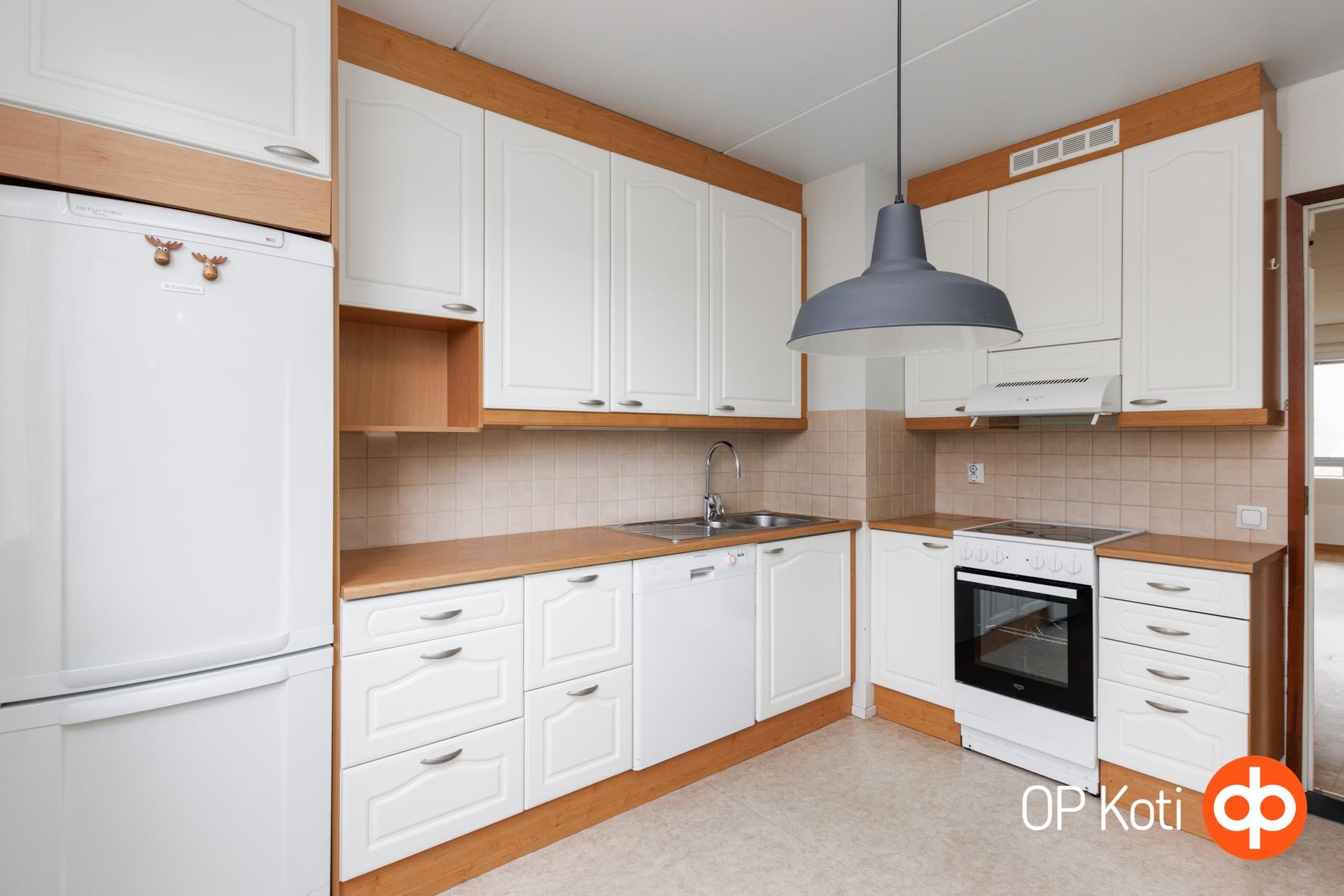 - Jääkaappipakastin, keraaminen liesi, liesituuletin, astianpesukone, kaapistot, kiinteät valaisimet.